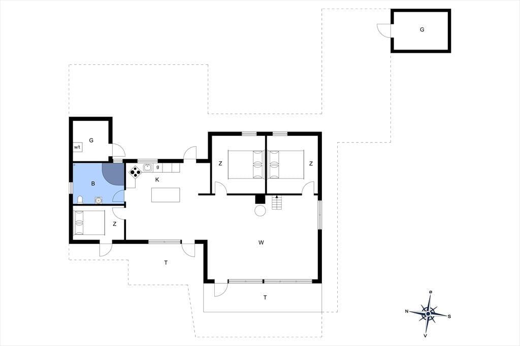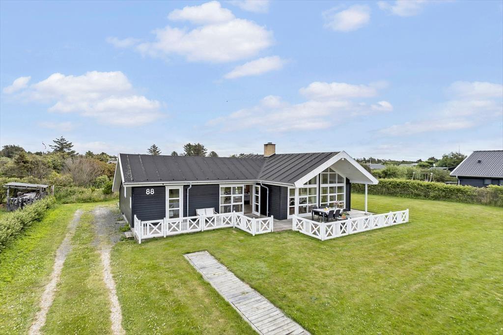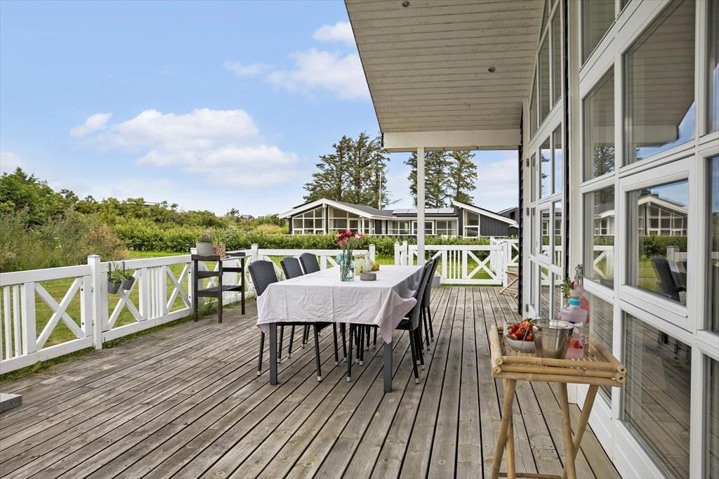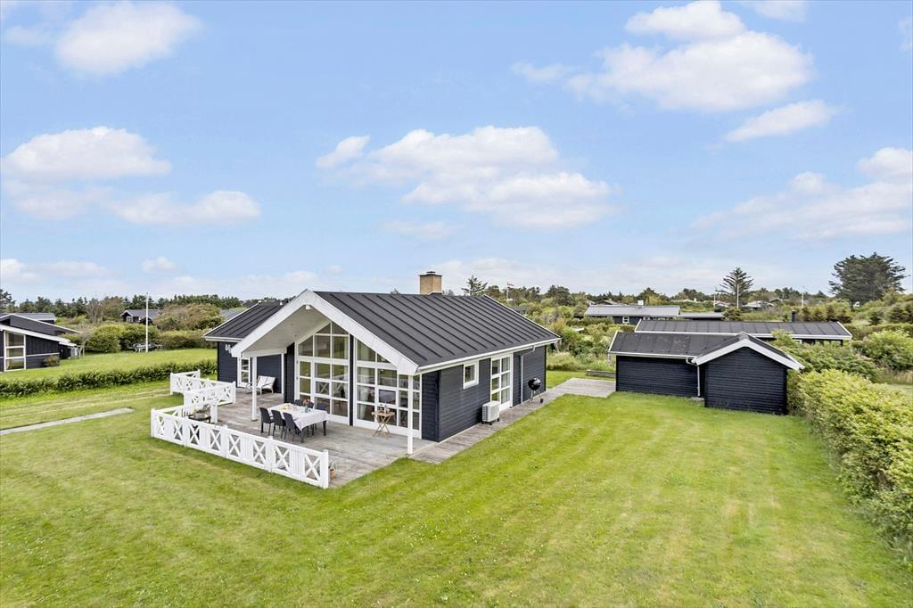Sommerhuset ligger på en flot havegrund med en dejlig græsplæne, hvor der er masser af plads til at lege, spille og løbe rundt. Der er terrasser rundt om en stor del af huset og en dejlig overdækket del med udgang fra stuen, hvor man kan nyde de lange, lune sommeraftener. Grill, gode havemøbler og liggestole er til rådighed for gæsterne.