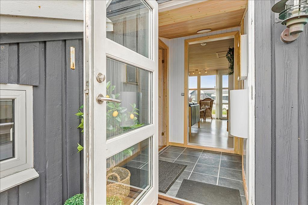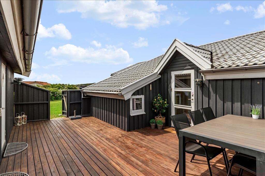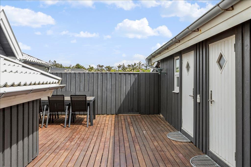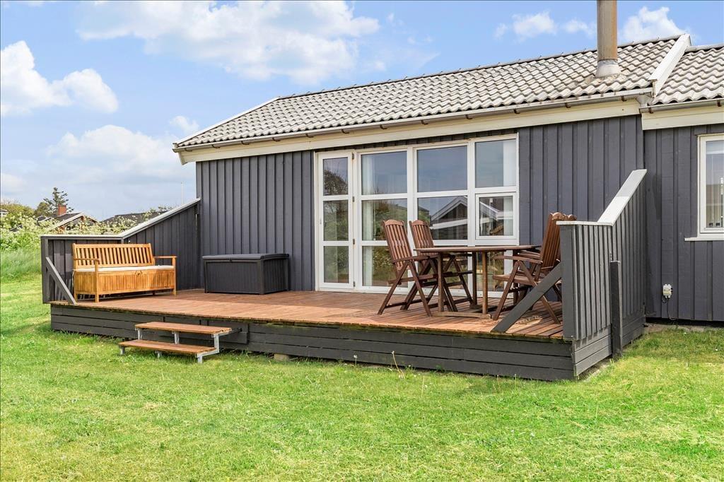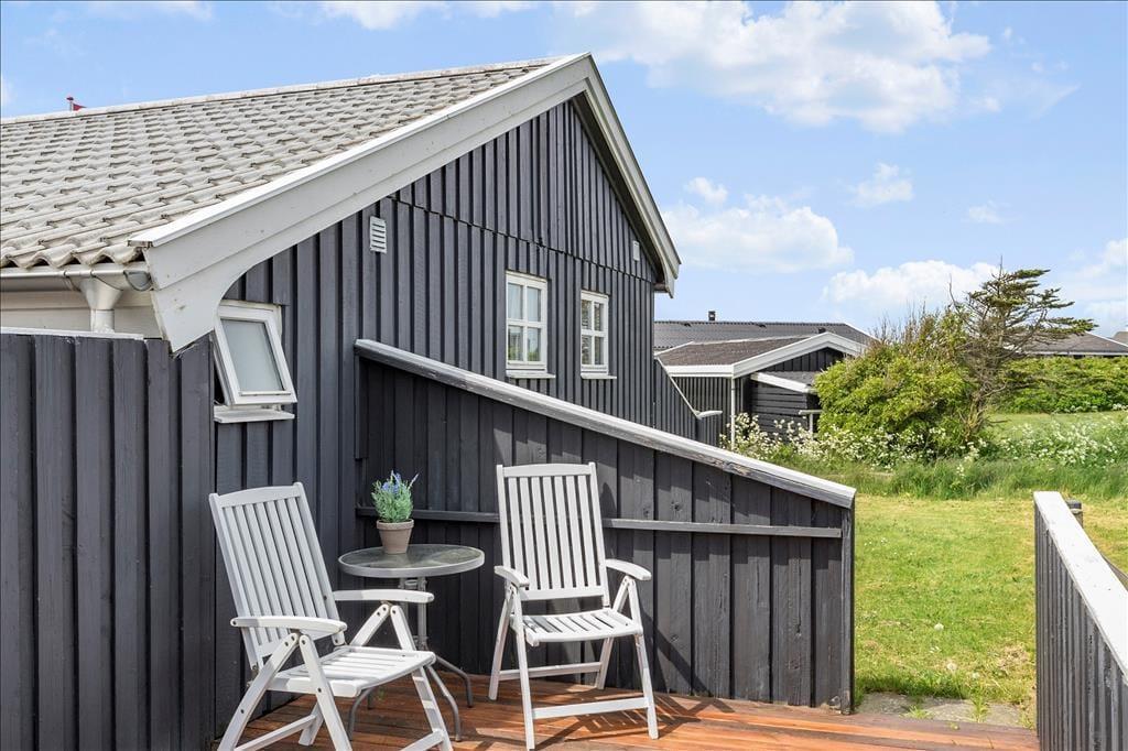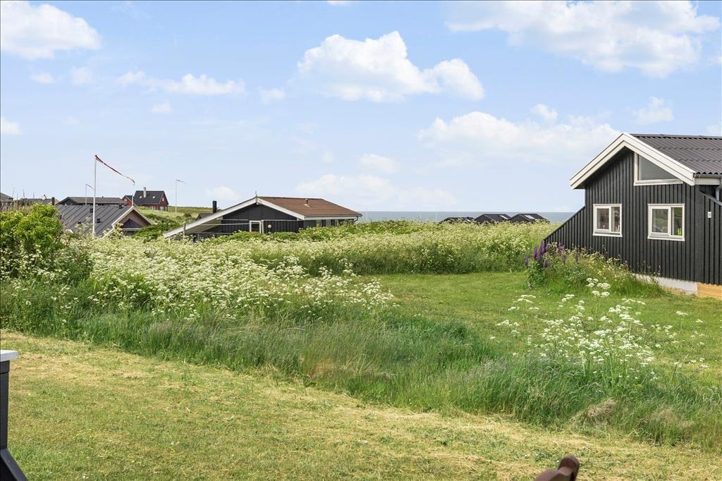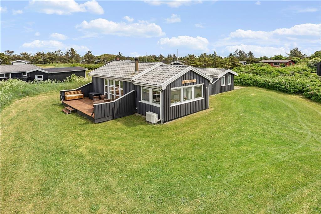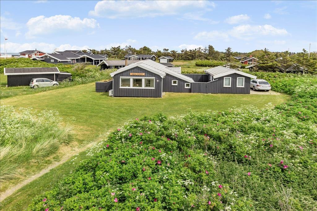 Sommerhuset ligger på en særdeles velplejet havegrund i det populære ’Harrerenden’ i Lønstrup. Mellem hovedhuset og annekset er en helt lukket terrasse, hvor både børn og hunde kan lege helt trygt, uden man skal bekymre sig om, om de løber ud på eventyr. Fra stuen kan man gå ud på en nordvestvendt terrasse med direkte udsigt til Vesterhavet og de smukke solnedgange om aftenen. Det er rendyrket idyllisk stemning!