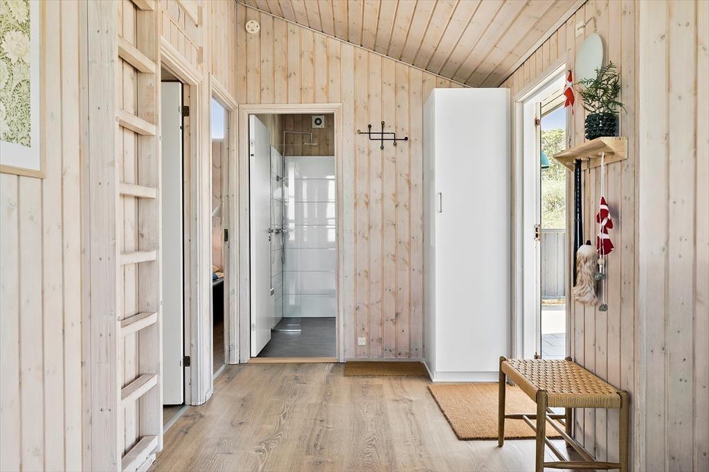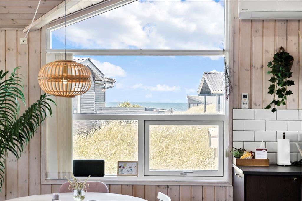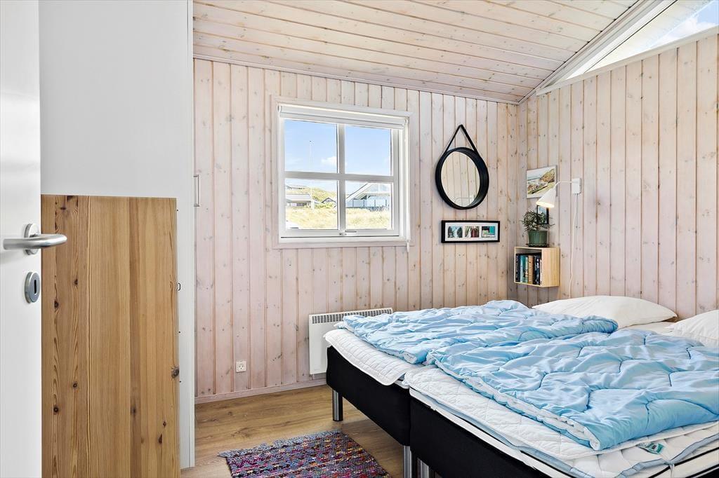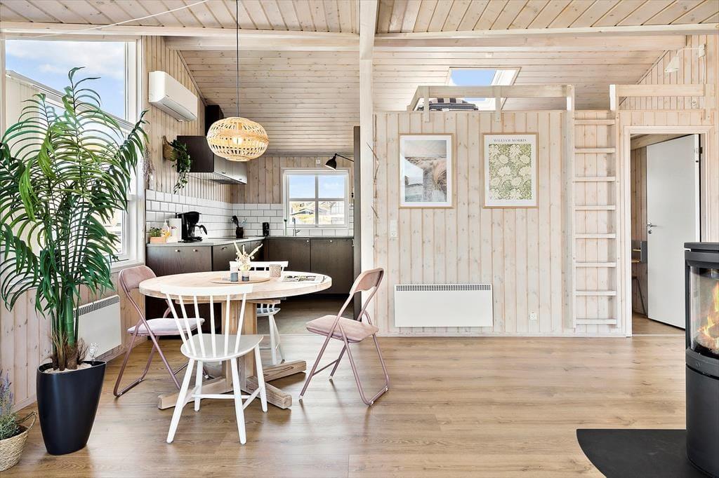 Sommerhuset er lyst indrettet med loft til kip og store panoramavinduer. Køkkenet ligger i åben forbindelse til stuen, som er indrettet med moderne og komfortable møbler. Der er brændeovn i stuen, som giver en dejlig varme og en hyggelig stemning. Der er to værelser. Et med dobbeltseng og et med en dobbelt sovesofa. Der er en ekstra sovemulighed på hemsen som har to madrasser.