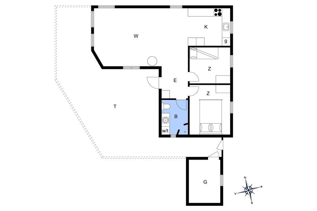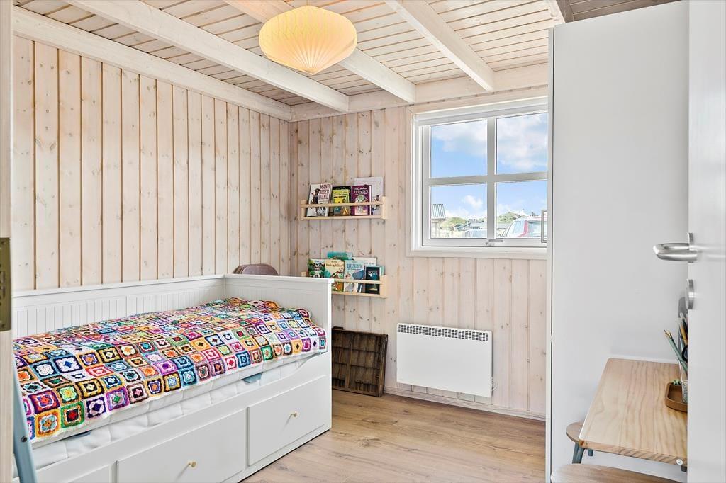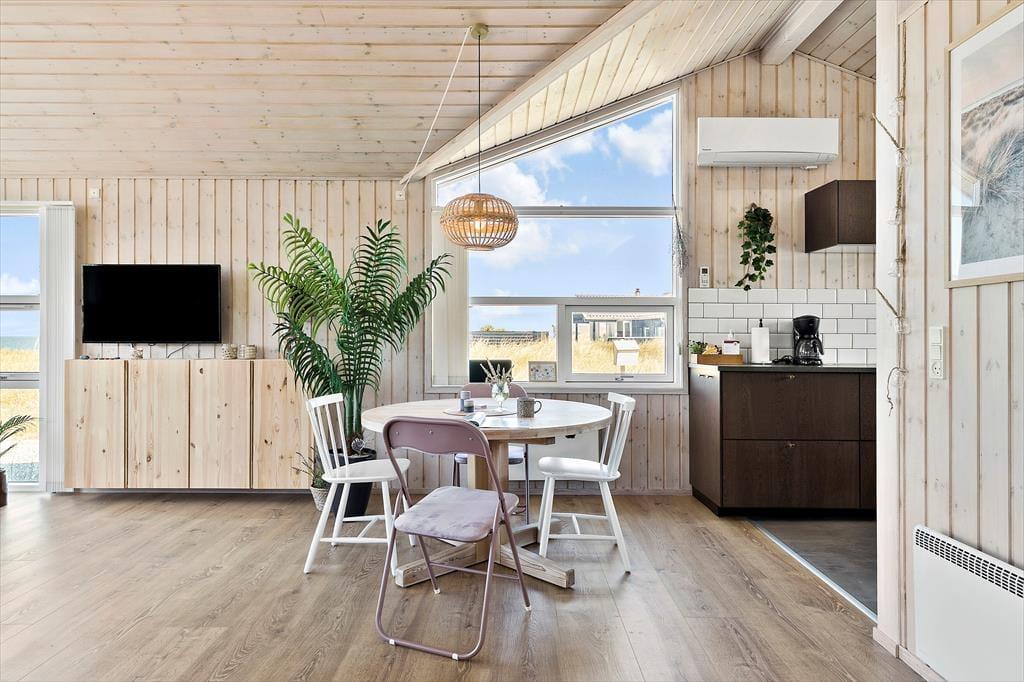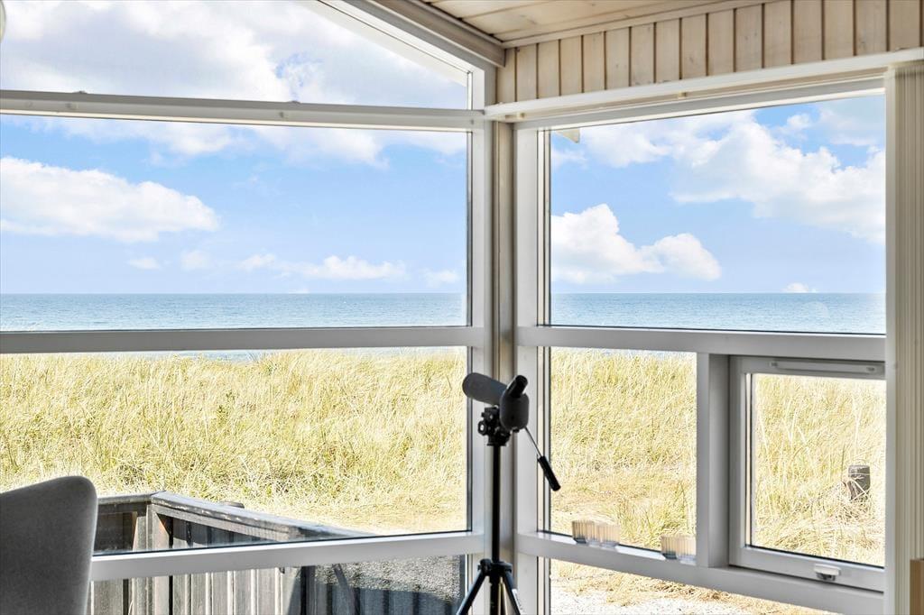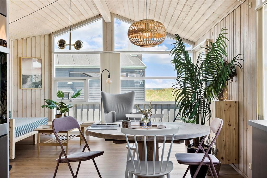 Sommerhuset er lyst indrettet med loft til kip og store panoramavinduer. Køkkenet ligger i åben forbindelse til stuen, som er indrettet med moderne og komfortable møbler. Der er brændeovn i stuen, som giver en dejlig varme og en hyggelig stemning. Der er to værelser. Et med dobbeltseng og et med en dobbelt sovesofa. Der er en ekstra sovemulighed på hemsen som har to madrasser.