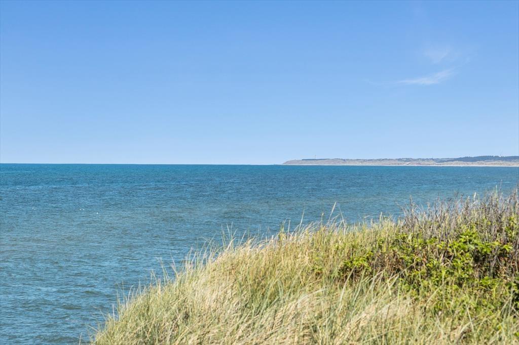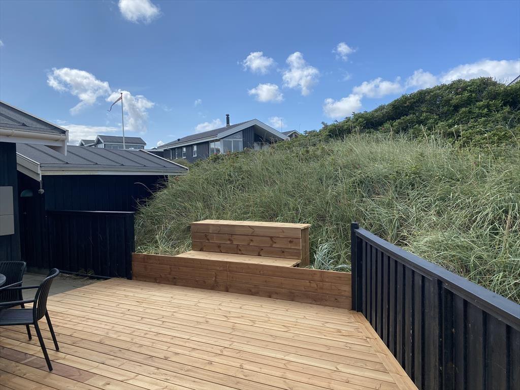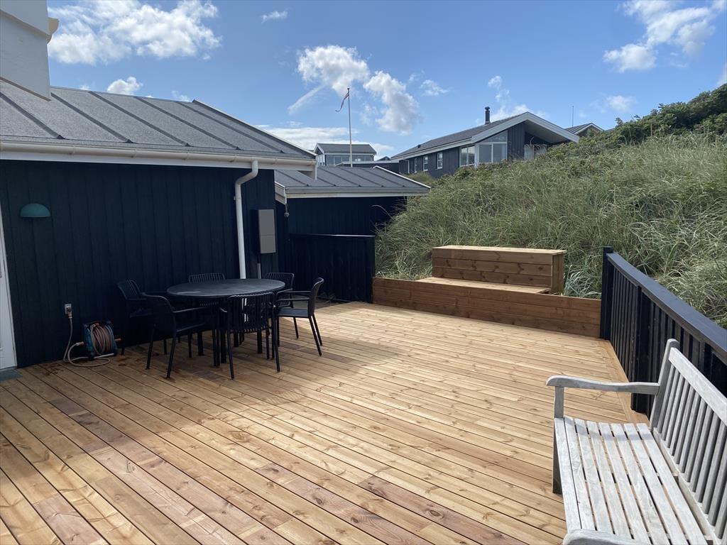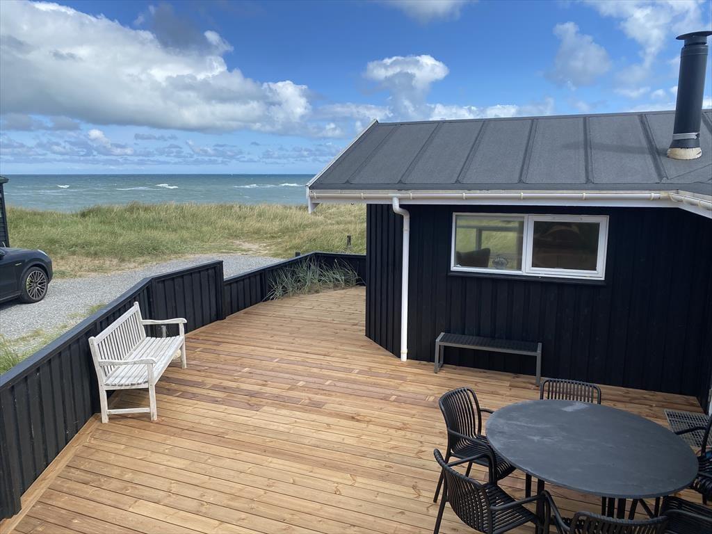 Der hører en stor lukket terrasse til sommerhuset, og også herfra har du den flotte panoramaudsigt over vandet. Huset ligger på en mindre naturgrund og den nærmeste nabo er den lille hyggelige købmandsbutik, som har begrænsede åbningstider.