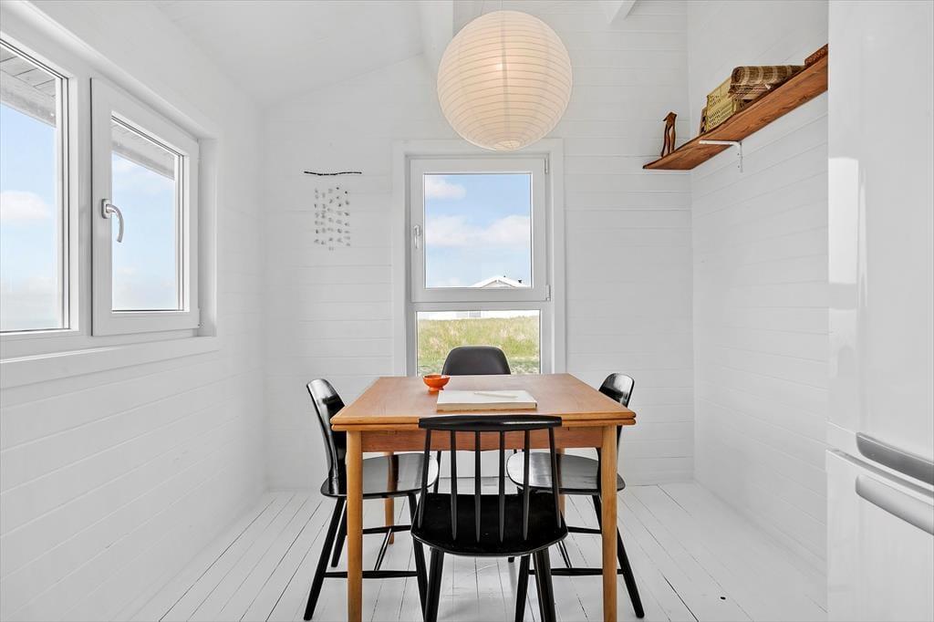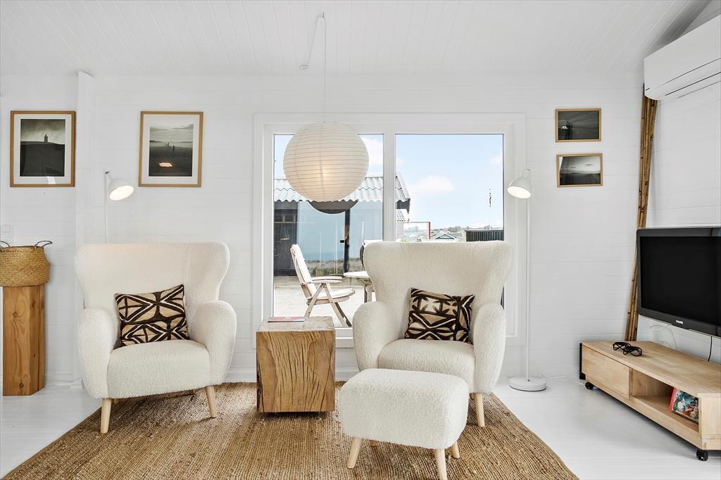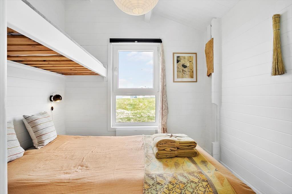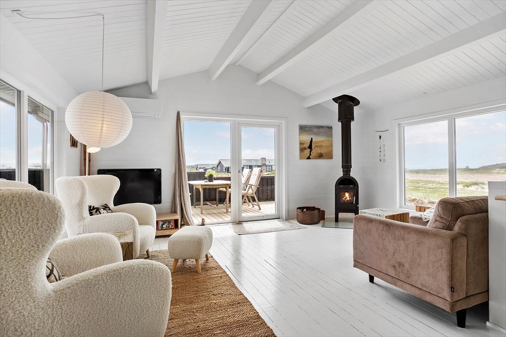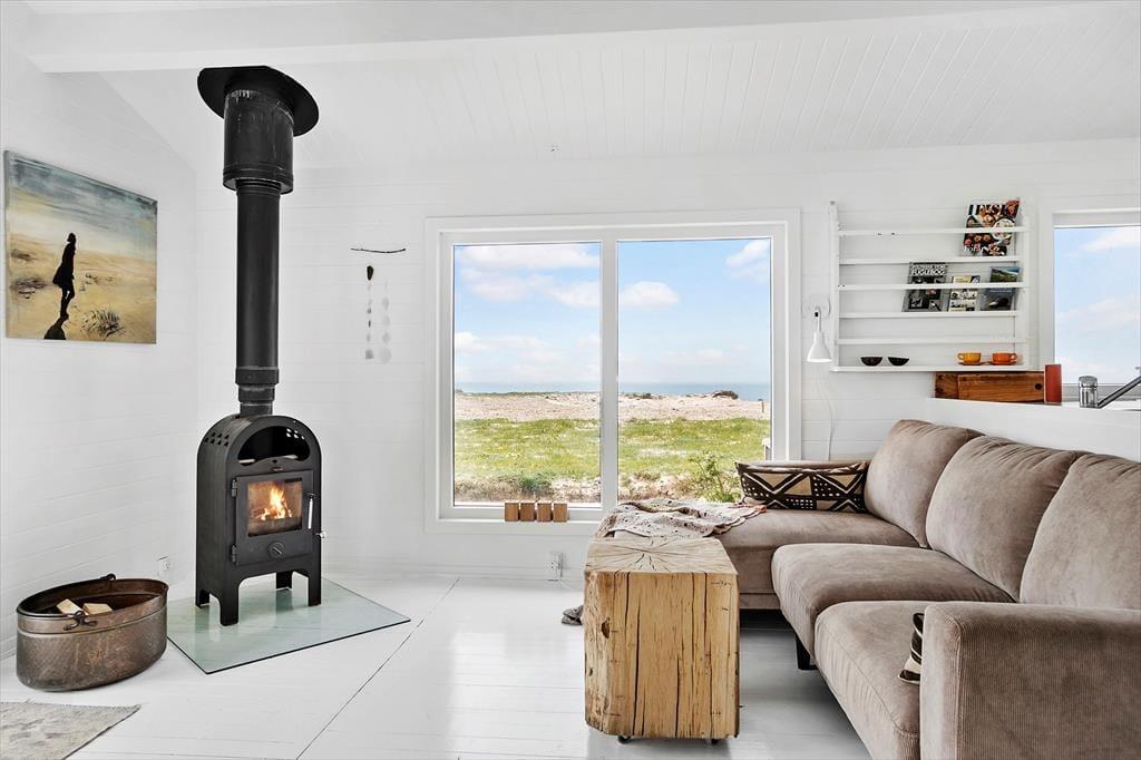 Sommerhuset er lyst og venligt indrettet med pæne og moderne møbler. På papiret hører sommerhuset ikke til de største, men de 60m2 er udnyttet på bedste vis og indrettet i en hyggelig og praktisk stil. Der er 2 gode soveværelser, begge med dobbeltsenge. Køkkenet ligger i åben forbindelse til stuen, som også råder over en brændeovn. Der er store vinduer samt loft til kip,der tilsammen giver et dejligt lysindfald.