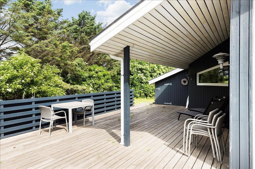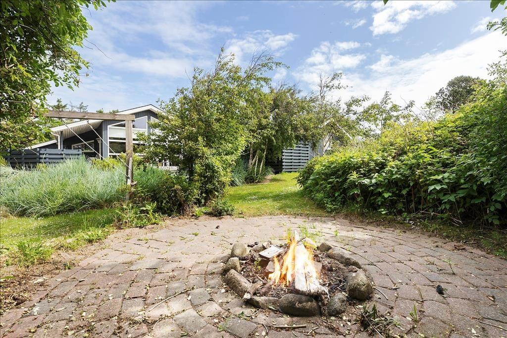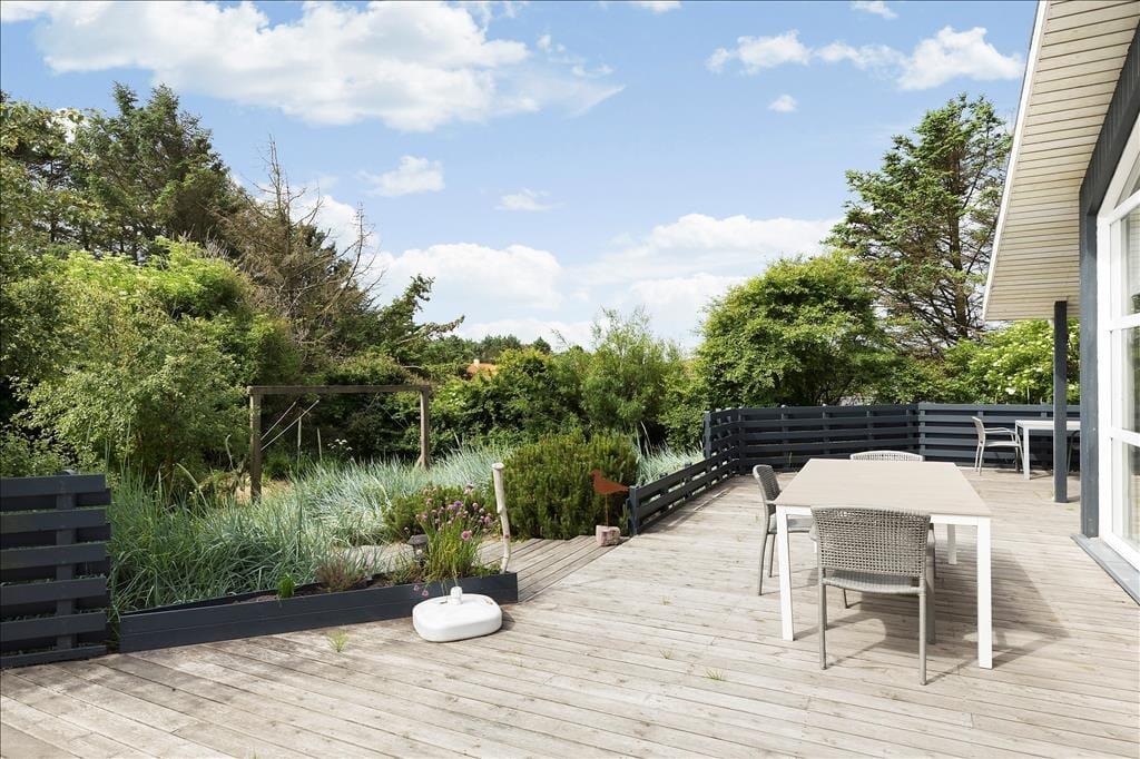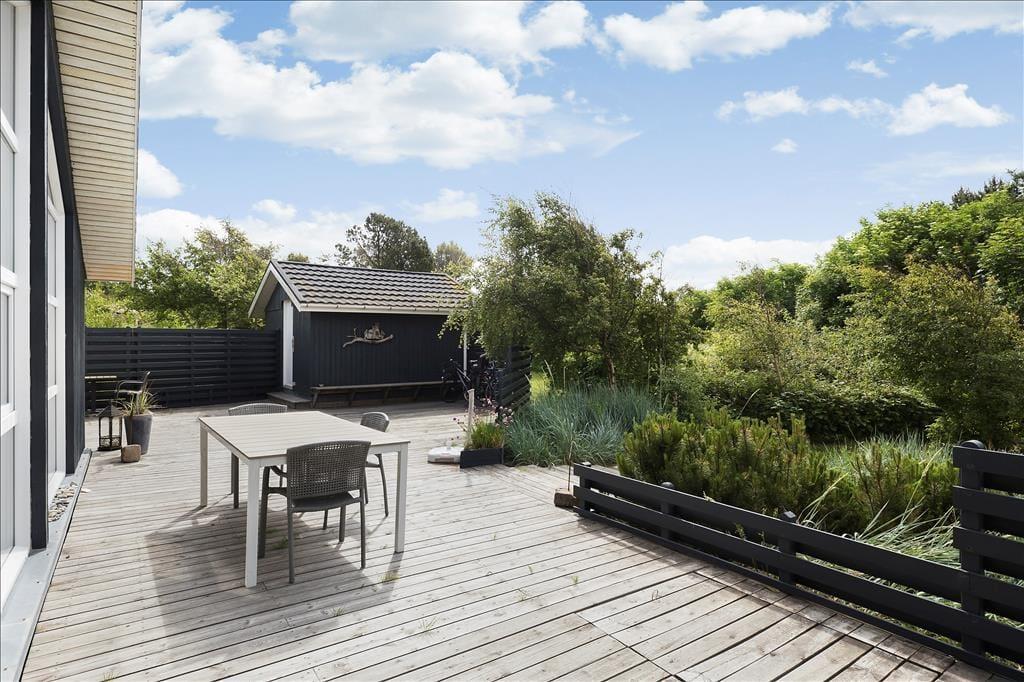 Ud for husets opholdsrum og mod syd er der anlagt en kæmpe stor, moderne og meget, meget flot terrasse. Her er der god læ, og en del af terrrassen er overdækket. Fra den store terrasse kan du via nogle få trappetrin komme til husets hyggelige bålsted, hvor familien kan samles og bage snobrød og stege pølser. Huset er veludstyret med havemøbler, liggestole, grill og parasol, og til børnene er en sandkasse.