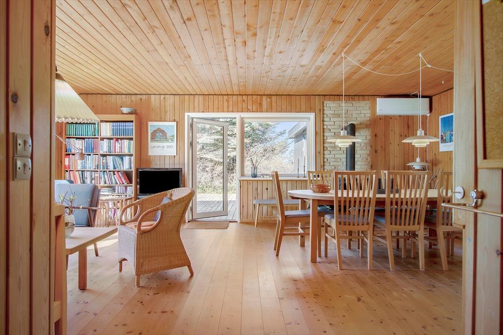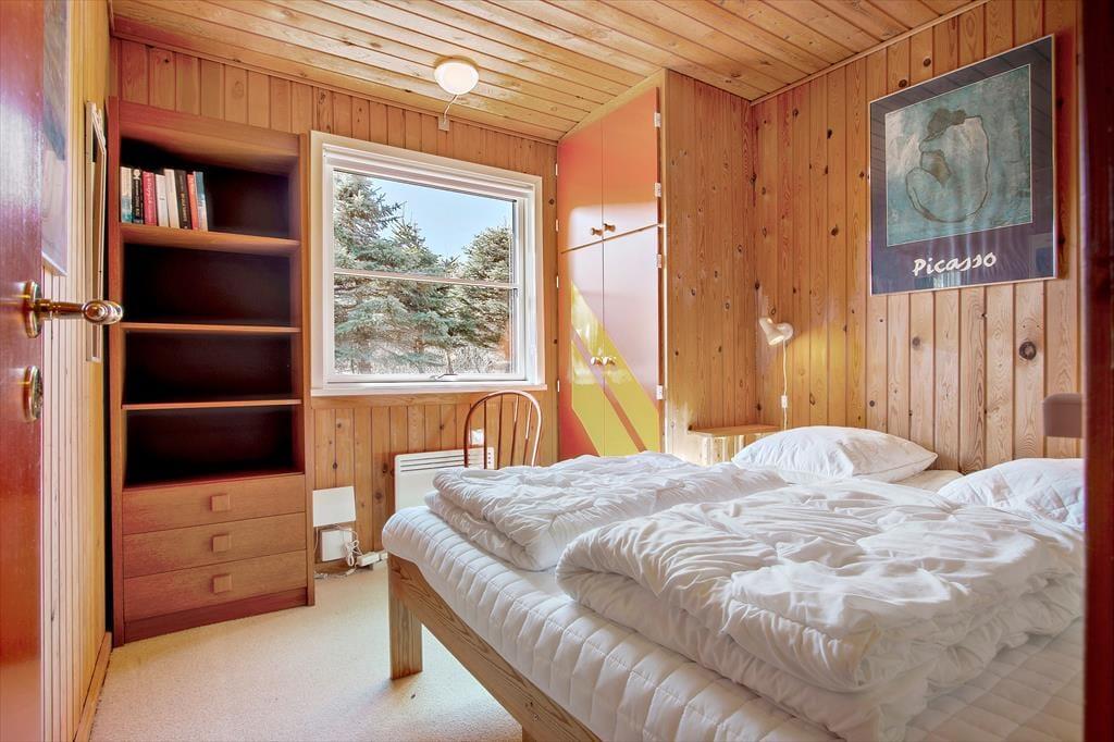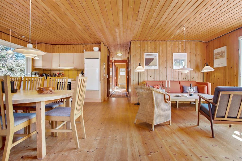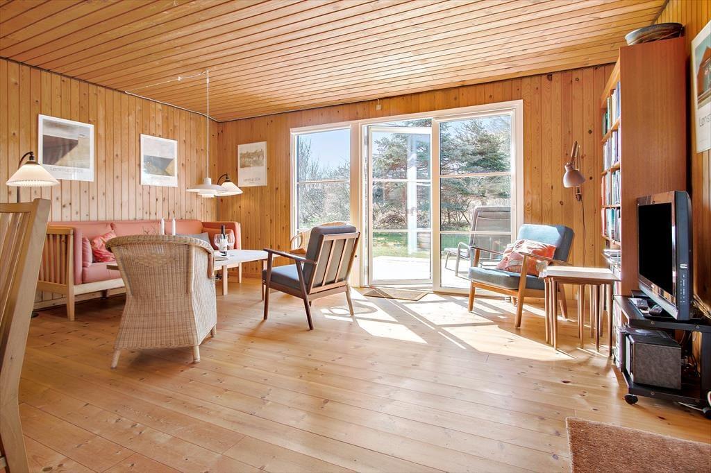 Sommerhuset har plads til 8 personer, fordelt på 4 soverum. 3 soverum er med dobbeltsenge og 1 med en køjeseng. Det store soveværelse er rummeligt og her kan sagtens være en børneseng. Huset har to badeværelser. Et nyere med toilet og brus, og varme i gulvet. Samt et lidt ældre med toilet og brus. Der findes god skabsplads i huset, både i rummene og i fordelingsgangen. Køkken og stue er i et, og der er brændeovn til de kølige aftener. Fra stuen er der åbnet ud til vestvendt terrasse som er delvist overdækket. Fra denne terrasse er der adgang til et viktualierum, med ekstra køleskab og plads til opbevaring. Køkken og stue er åbent og giver mulighed for at være sammen med hele familien, og med direkte udgang til dejlig sydvendt terrasse med god læ og solkrog samt delvist overdækket terrasse mod vest, hvor aftensolen kan nydes. Sommerhuset er en sand retroperle, indrettet med sans for kvalitet og bevarelse af den oprindelige sommerhusstil. Man finder således originale skabe i brændt orange, indretningsdetaljer med vægt på klassiske skandinaviske design. Et utroligt hyggeligt sommerhus. Til børnene er der et skab fyldt med spil til regnvejrsdagene eller en hyggelig aften. Hertil kommer en stor lukket terrasse bagved, hvor man altid kan finde læ, det er næsten en gårdhave.