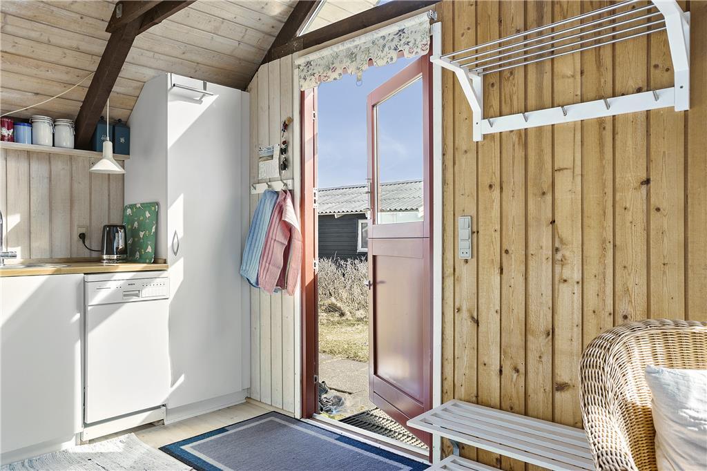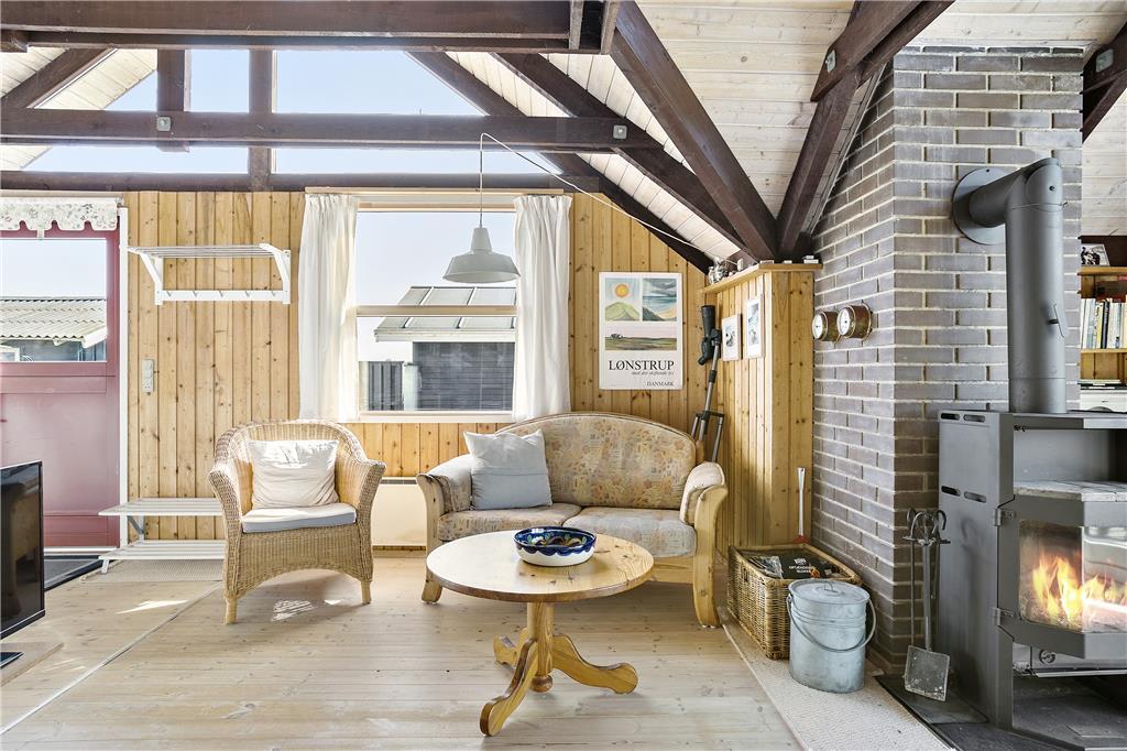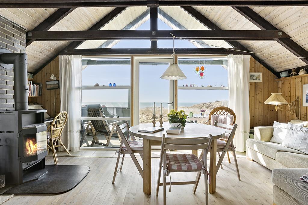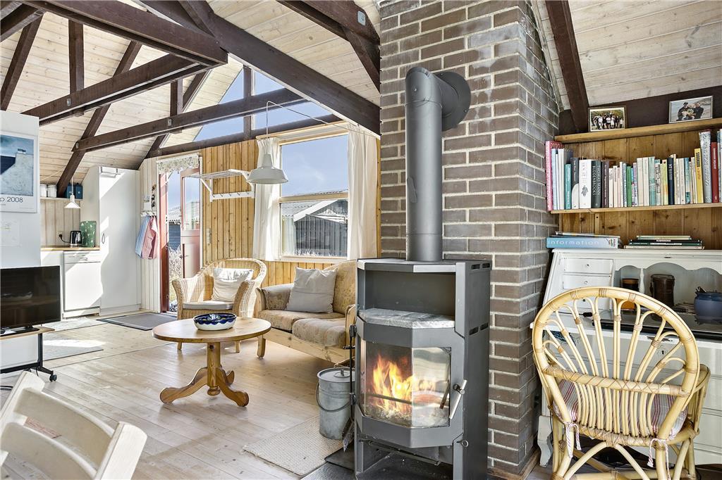 Man træder ind i sommerhusets lyse køkken som ligger i åben forbindelse til den hyggelige stue som er holdt i træ med loft til kip og fritlagte bjælker. Der er store vinduer ud mod havet, som giver et dejligt lysindfald og en fantastisk udsigt over havet, Rubjerg Knude og de små fiskerhuse i Lønstrup by. Brændeovnen fuldender den gode sommerhusstemning.