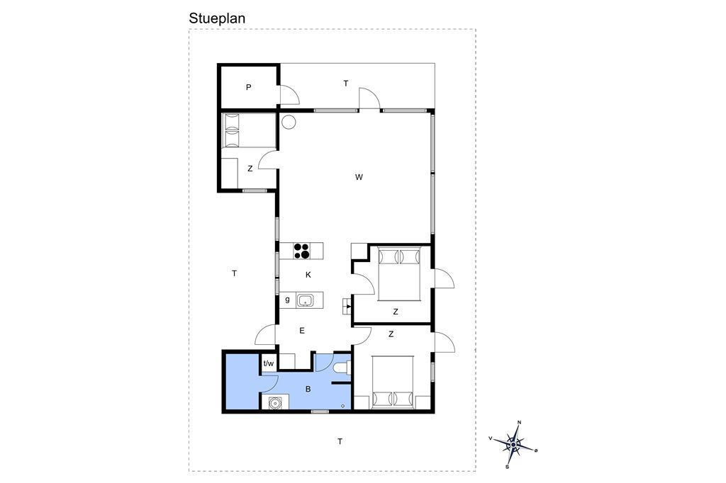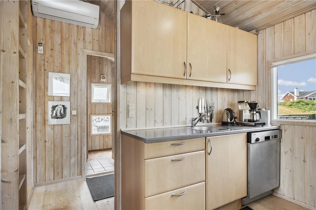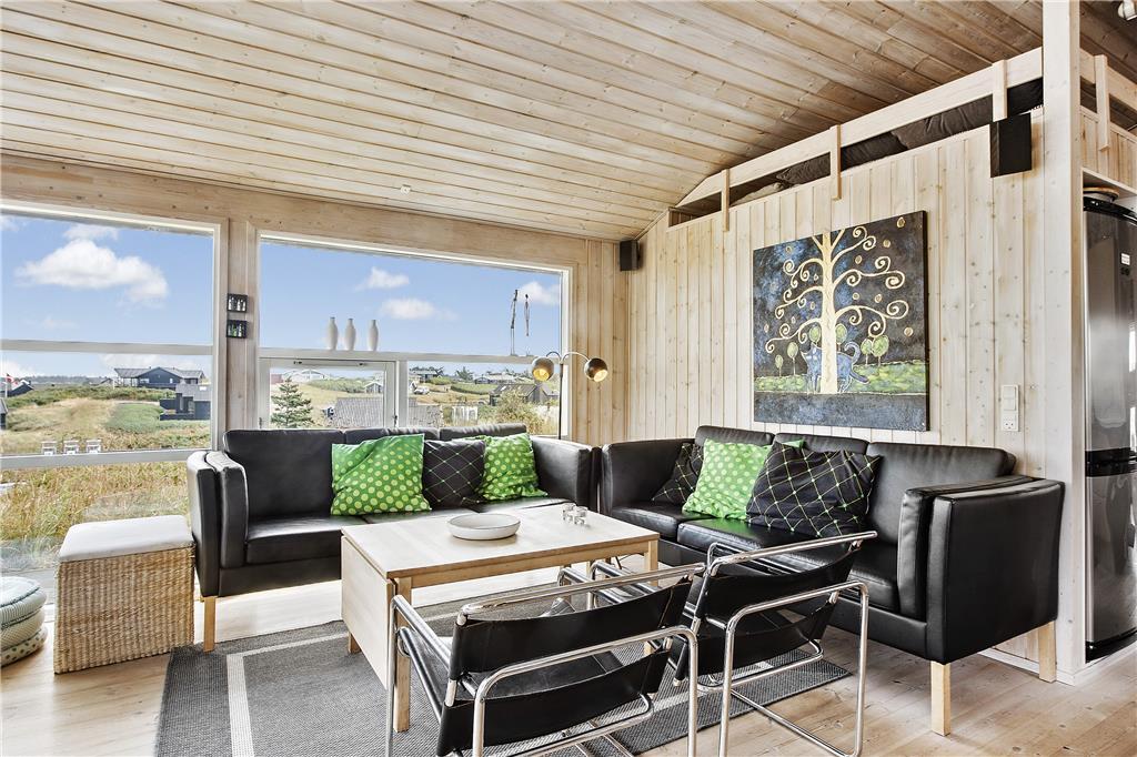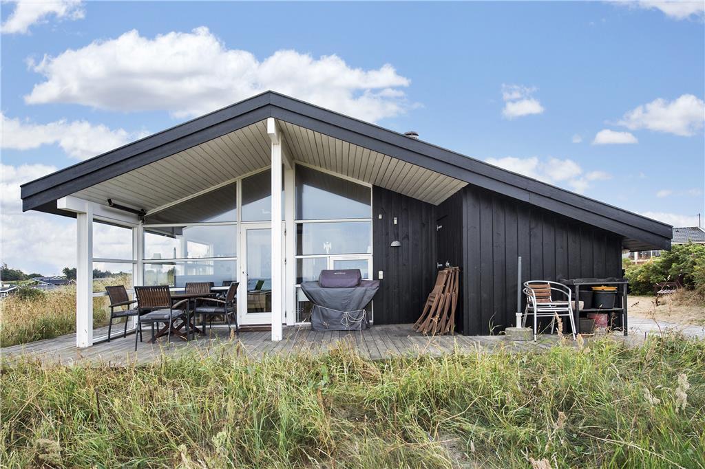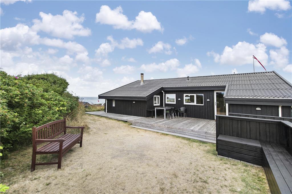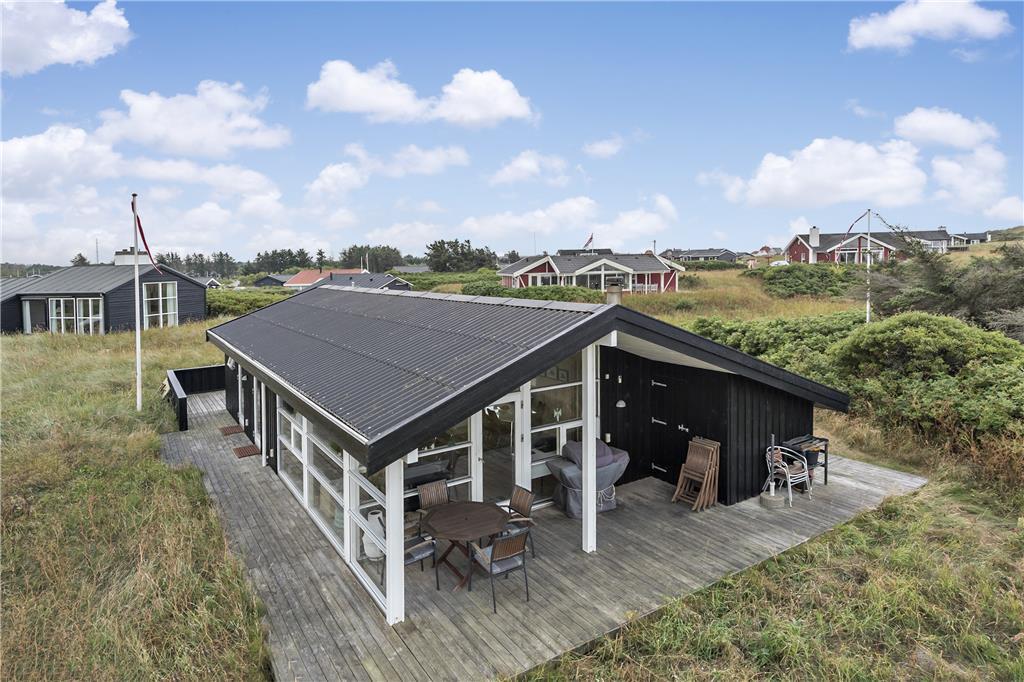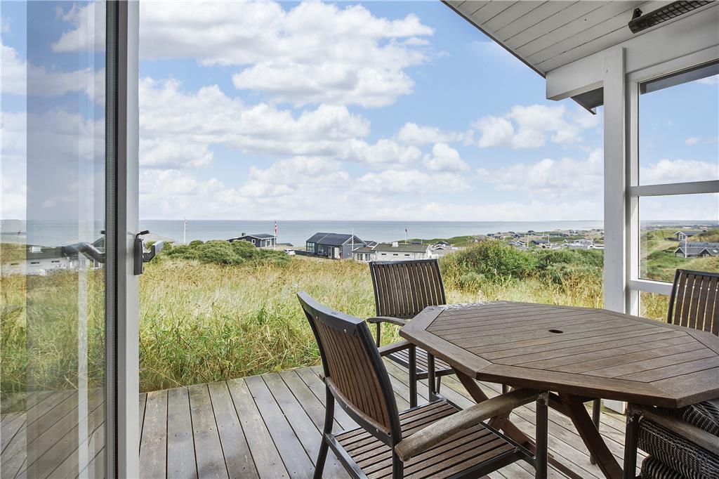Sommerhuset har terrasse hele vejen rundt, og en del er overdækket samt med læhegn, så det er nemt at finde solskin og læ. Sommerhuset ligger højt hævet, og fra flere sider er der en skøn udsigt. Grill og havemøbler gør det oplagt at nyde flere af feriens måltider udendørs – hvem vil ikke gerne nyde et lækkert måltid med familien og udsigt over Vesterhavet?