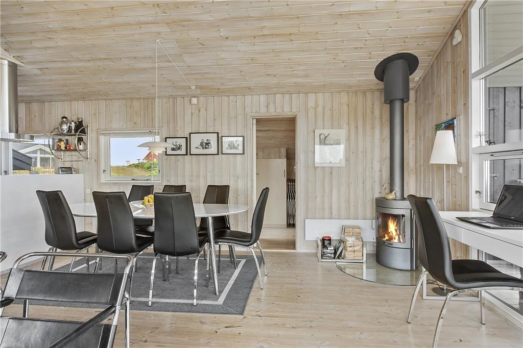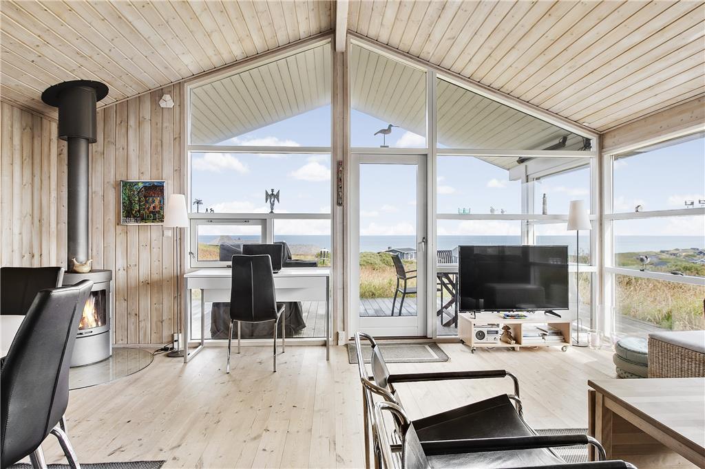 Sommerhuset har et åbent køkken-alrum, som er lyst og pænt indrettet. Med brændeovn og store vinduer, der giver en rigtig god udsigt over havet og området, så er opholdsrummet i dette hus bestemt et skønt sted at slappe af og nyde sin families selskab. Huset rummer tre værelser, af varierende størrelser, men alle med en dobbeltseng, og et større, lyst badeværelse med vaskemaskine og tørretumbler. Sommerhuset danner helt bestemt gode rammer for en dejlig ferie i Lønstrup!