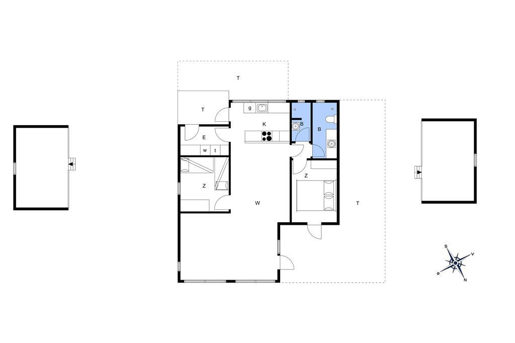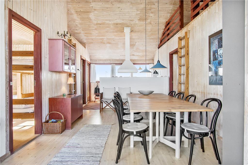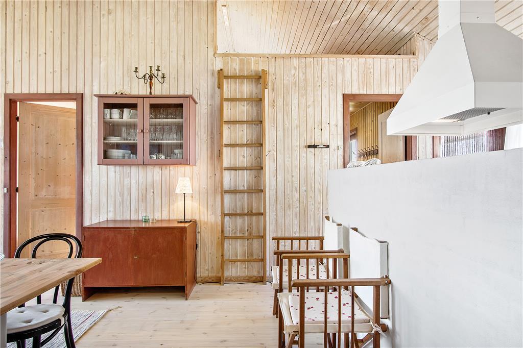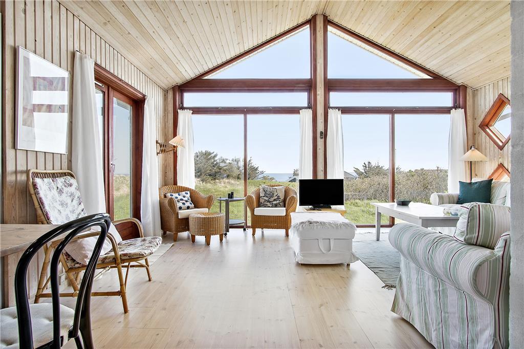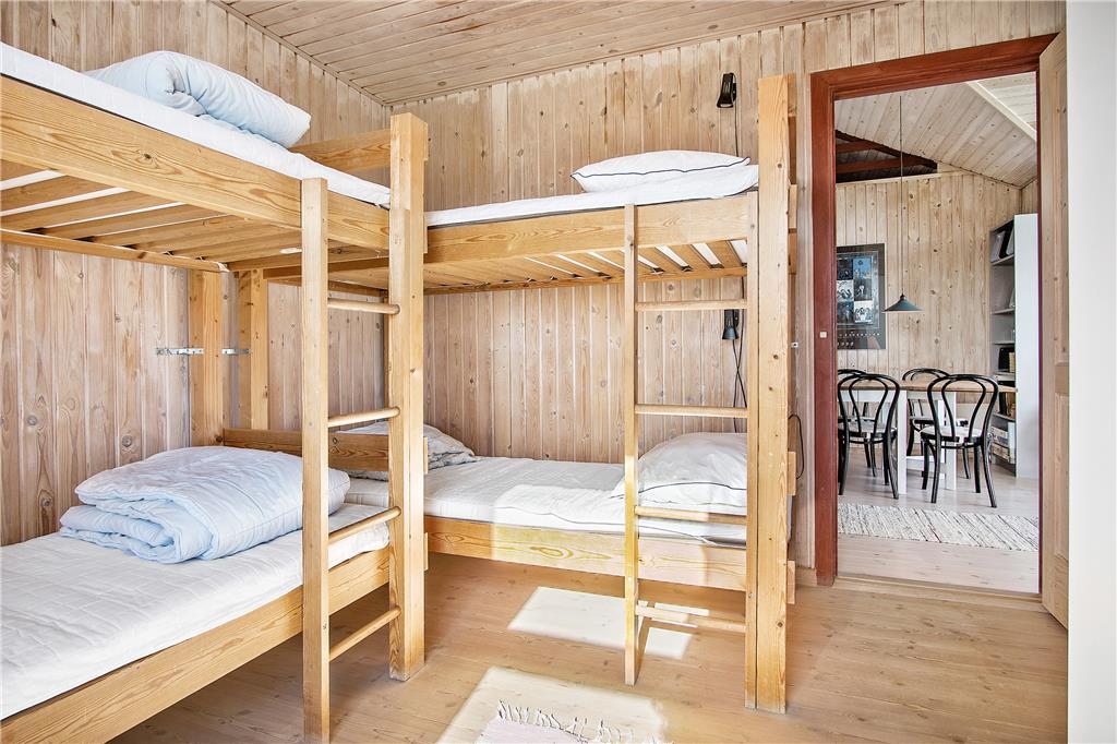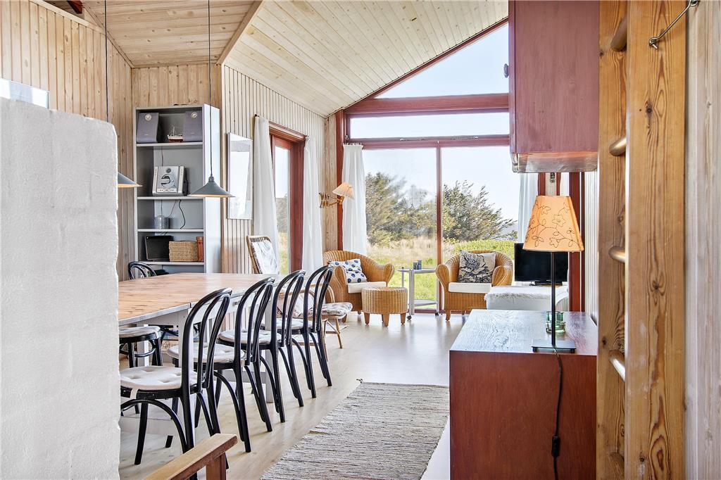 Huset er indrettet med køkken, som er åbent til spisestue og opholdsstue, så man kan være sammen, når man har ferie. I stuen er der først og fremmest en skøn havudsigt fra de lyse sofaer, så hvem vil ikke gerne nyde et stille øjeblik her. Også når familien er samlet omkring spisebordet, kan man nyde udsigten. Møblerne er blandede og praktiske - og fremfor alt hyggelige i et sommerhus. Der er to soveværelser med hhv. dobbeltseng og to køjesenge, og så er der to sovemuligheder på hemsen. Der er et stort badeværelse med pænt bordarrangement og god plads, og så er der et ekstra rum med bruser og håndvask.