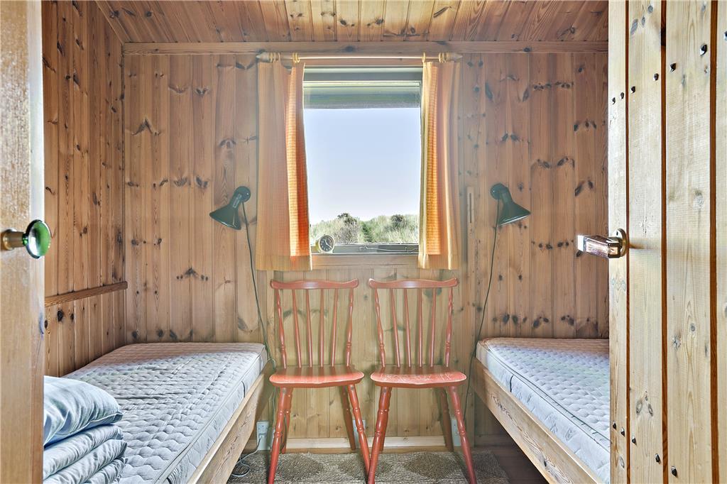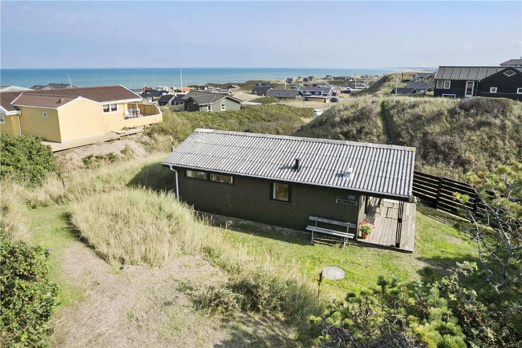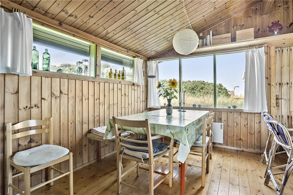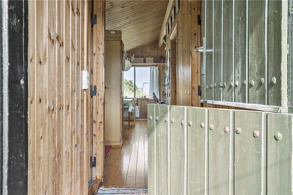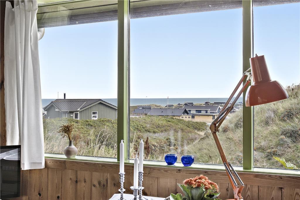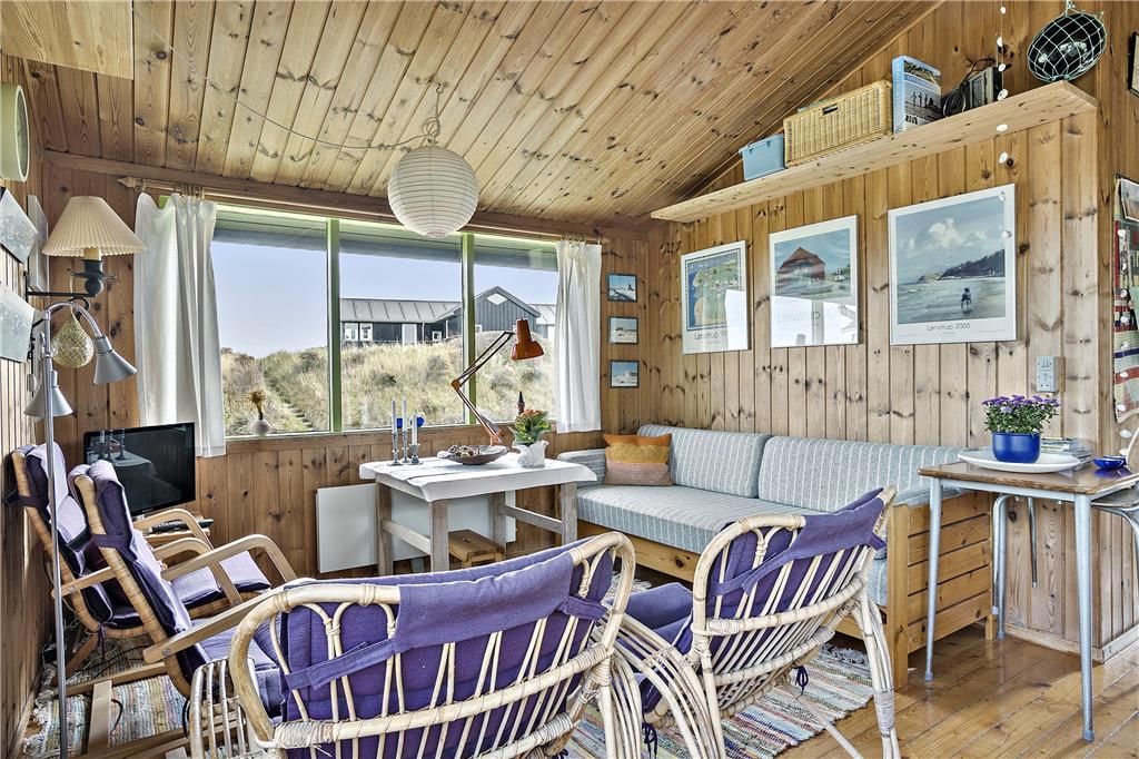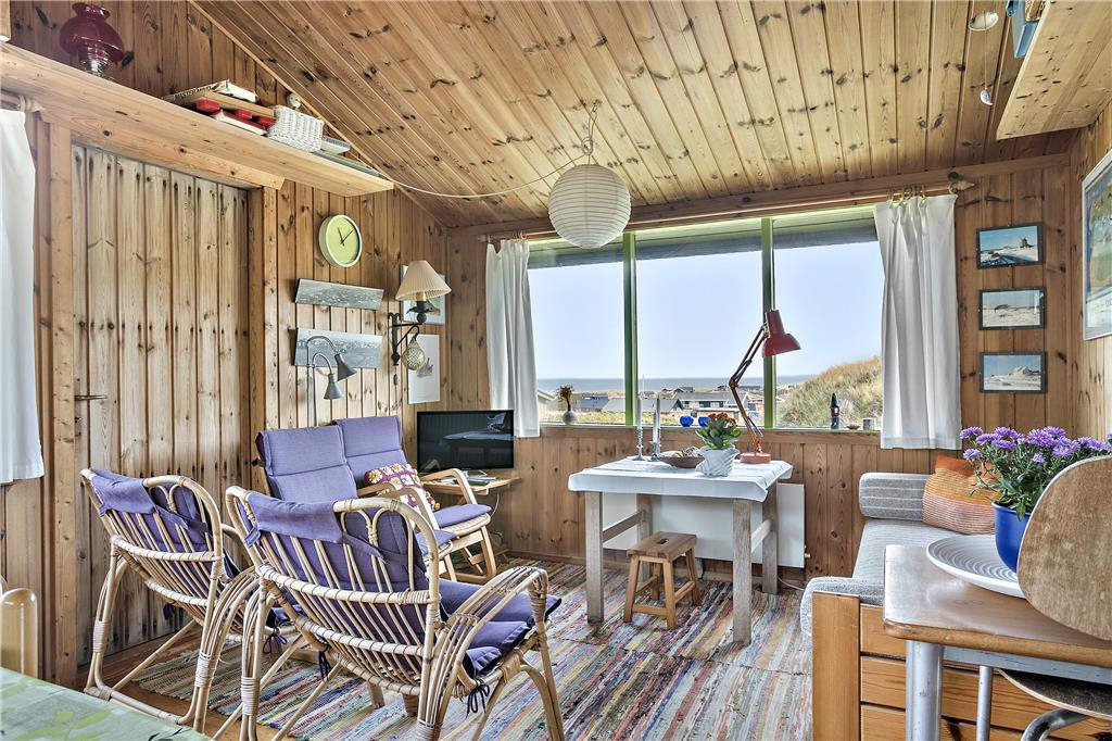 Når du træder indenfor i sommerhuset, mødes du af en gammel, men velholdt indretning, der emmer af hygge og personlig charme. Den rustikke stil med træbeklædning og det traditionelle sommerhusudtryk skaber en varm og indbydende atmosfære, der får dig til at føle dig hjemme fra første øjekast. De store vinduer giver et vidunderligt lysindfald og åbner op for den fantastiske udsigt over Vesterhavet, som kan nydes fra både stuen og det ene soveværelse. Det åbne køkken og opholdsareal gør det muligt at tilberede dagens måltider, mens du samtidig har udsigt til havet og kan følge med i familiens aktiviteter.
