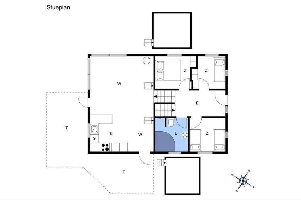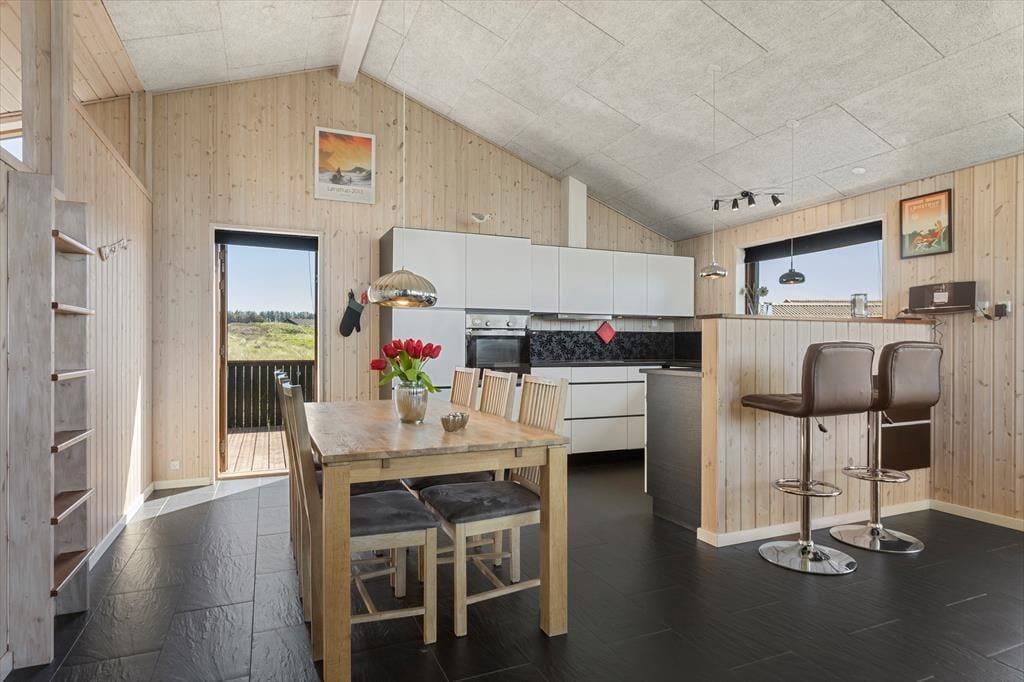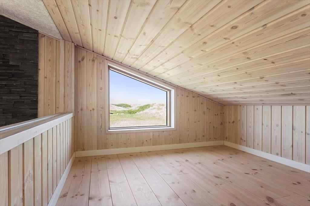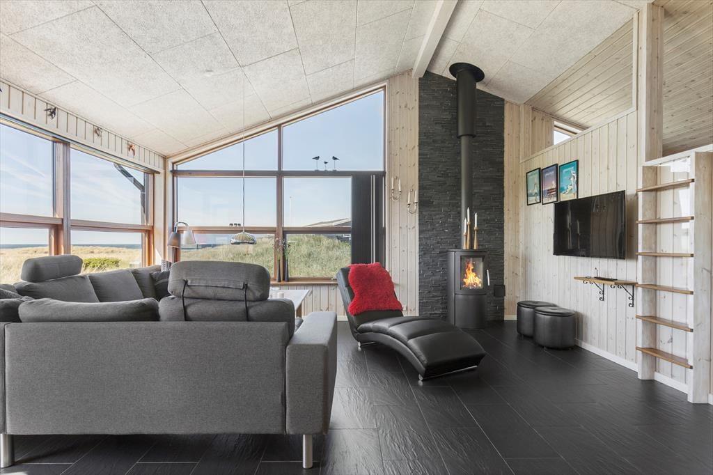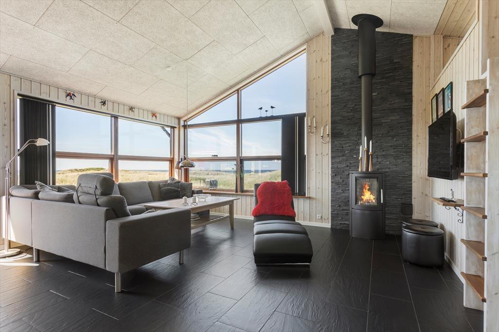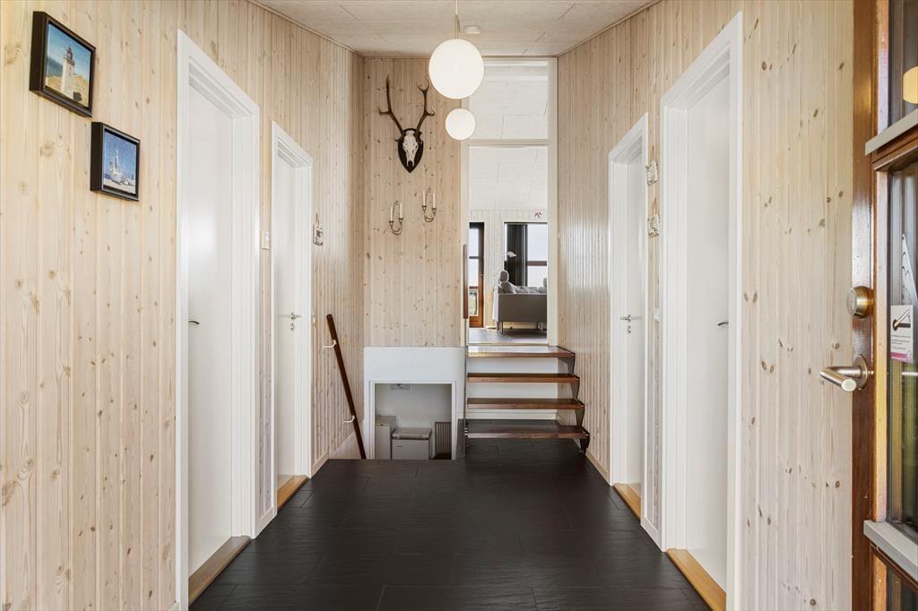 Man træder som det første ind i sommerhusets brede entré, hvorfra der er adgang til de 3 soveværelser samt badeværelset med spa. Man kan straks fornemme at det er spændende hus, hvor der er gjort meget ud af detaljerne. En trappe fører ned til et stort bryggers, som har har vaskemaskine og tørretumbler. En trappe fører fra entreen op til husets hjerte, nemlig stuen og køkkenet, som ligger i åben forbindelse. Her er plads til samvær og på de koldere efterårsdage giver brændeovnen både varme og hygge. Fra stuen er der adgang til de to store hemse og også herfra er udsigten fantastisk.