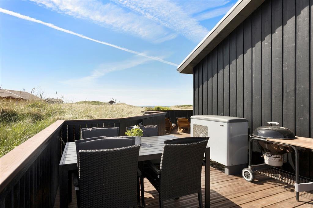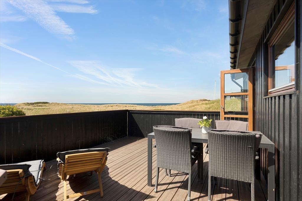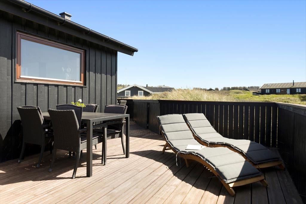 Sommerhuset ligger på en let skrånende naturgrund. Der er en stor lukket terrasse rundt om huset, så man har mulighed for at opholde sig i læ for vinden og at nyde solen hele dagen. Der er udgang fra stuen til den lukkede terrasse. Også fra terrassen kan man nyde den flotte udsigt.