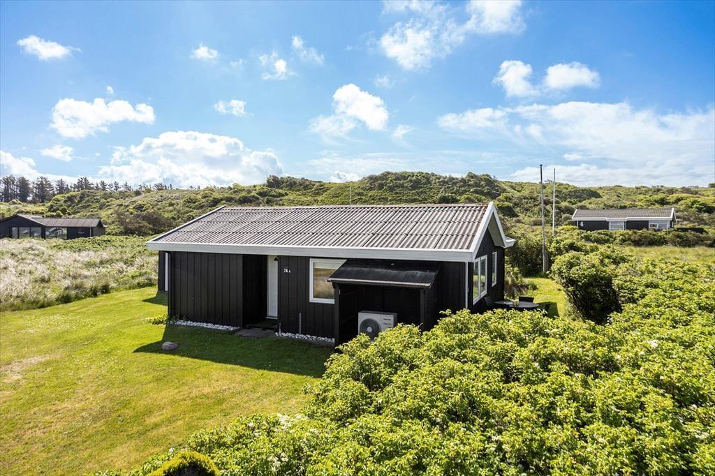 Fra grunden er der en skøn udsigt over området og også et lille glimt af Vesterhavet. Der er terrasser på to sider af huset, og udgang fra opholdsrummet til begge, så det er nemt at tage flere af feriens måltider med udendørs. Grill og havemøbler hører naturligvis også til huset, så det er med at nyde mest muligt af ferien udendørs.