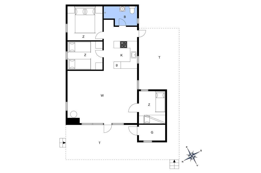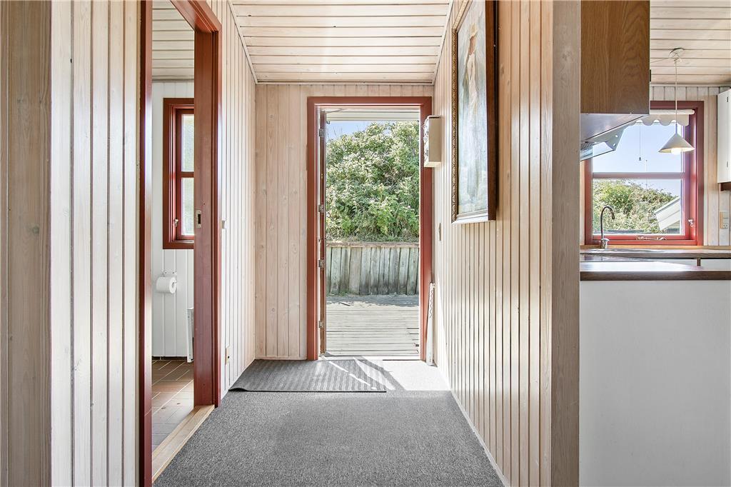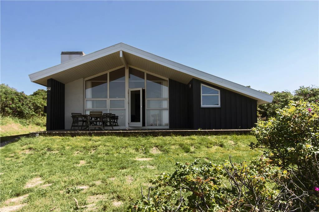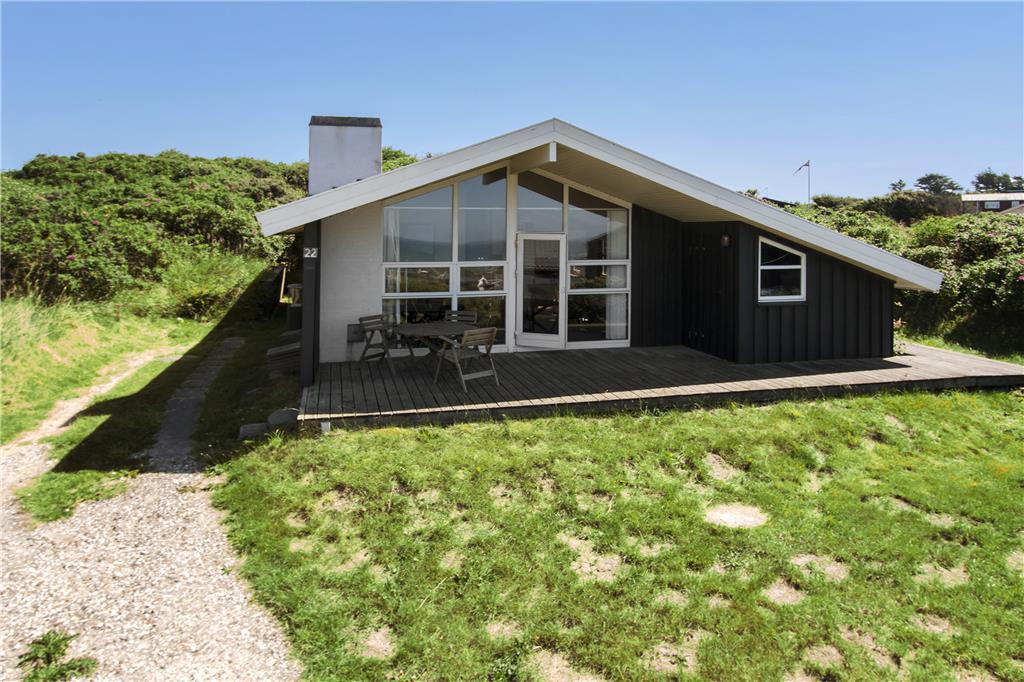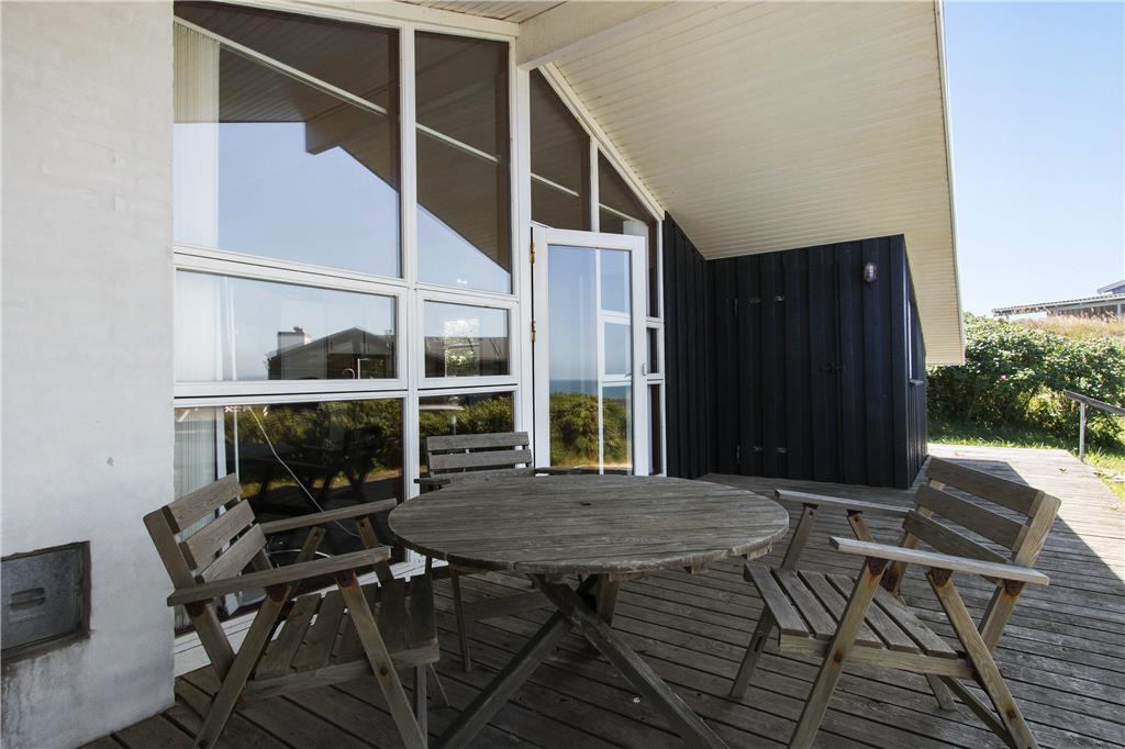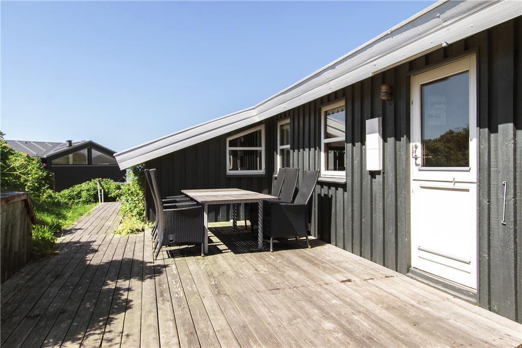 Der er terrasse på to sider af huset, så der er mulighed for at vælge, om man er til fuld sol, eller om man vil gemme sig lidt mere af vejen på den overdækkede del af terrassen. Grunden er en forholdsvis lille klitgrund, som ligger omkranset af hyben og anden klitbevoksning.