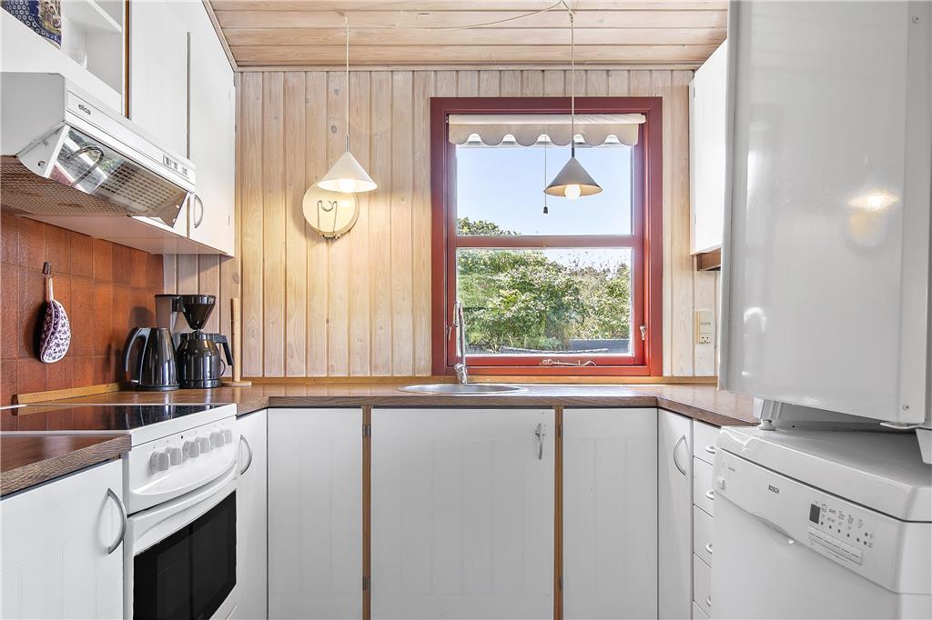 Feriehuset er rigtig praktisk indrettet med åbent køkken til både spisestue og opholdsstue. Herfra er der udgang til en dejlig delvist overdækket terrasse med den mest fantastiske havudsigt. Huset er indrettet med funktionelle møbler og en lille brændeovn, som kan gøre nytte, hvis aftenerne skulle blive lidt kolde. Der er tre soverum med hhv. dobbeltseng, to enkeltsenge og et værelse med en køjeseng og en enkeltseng, som ikke har fuld længde. Badeværelset er lyst og praktisk indrettet med bruseniche.