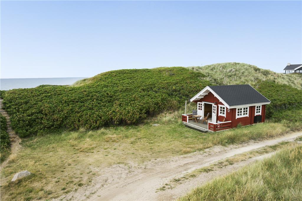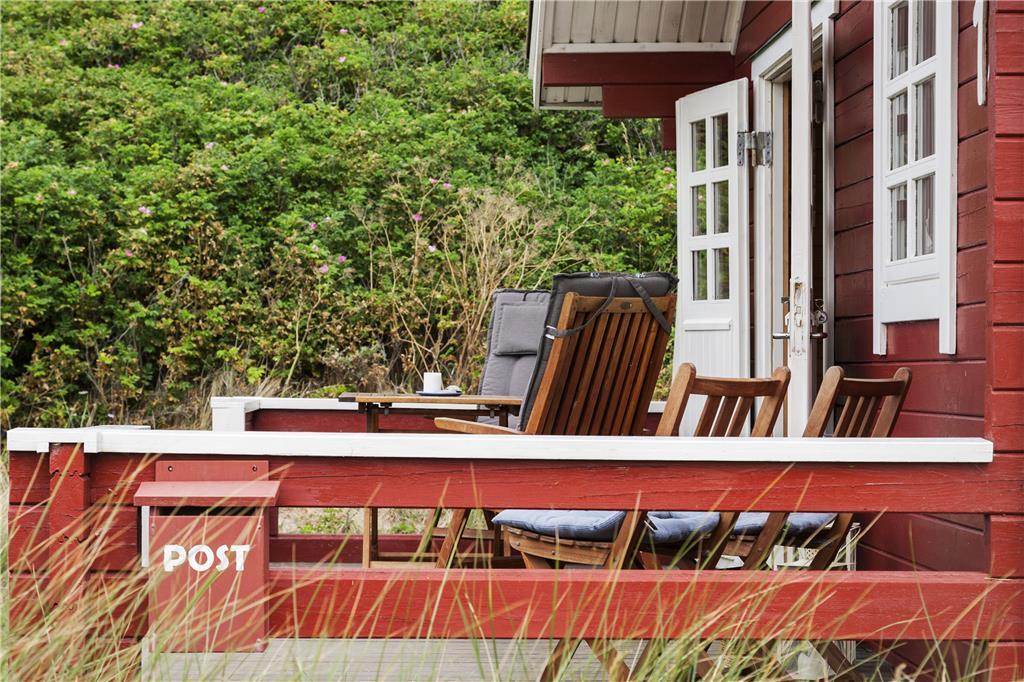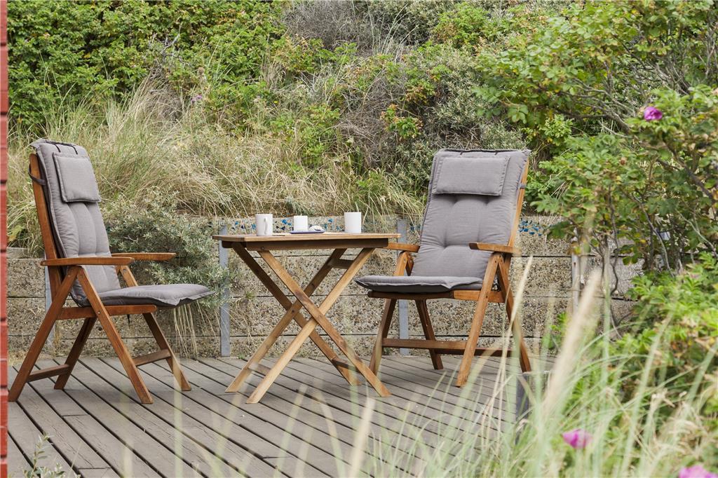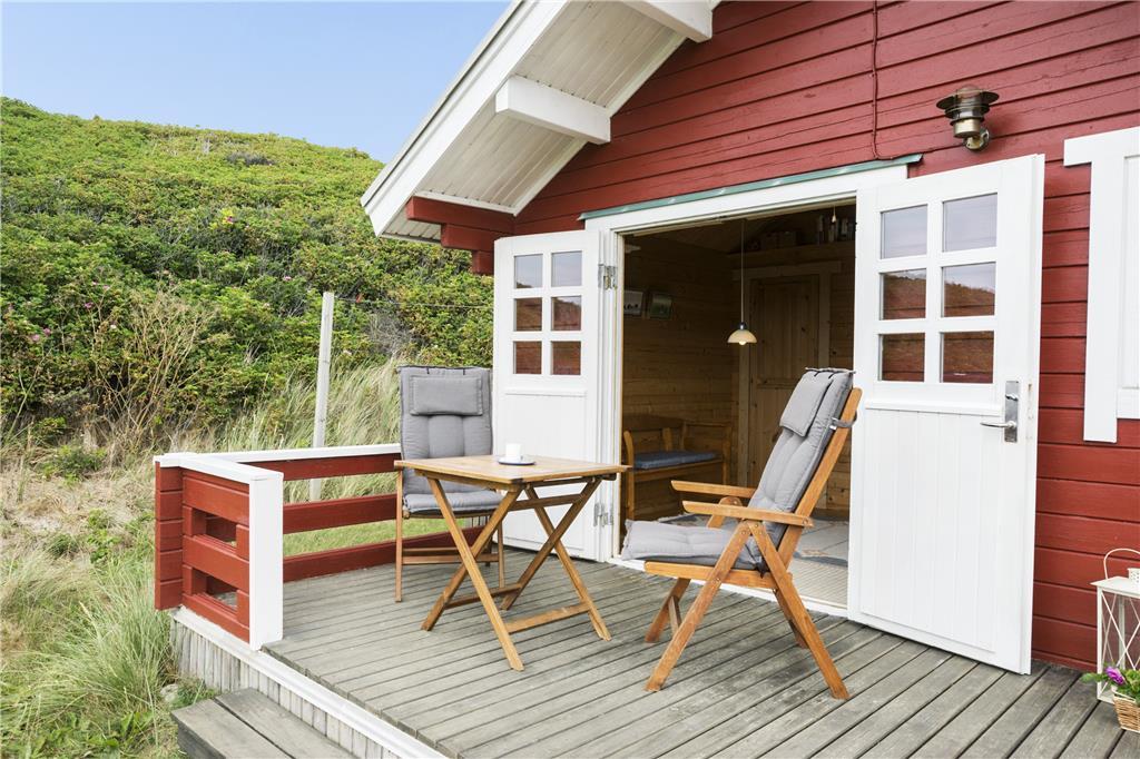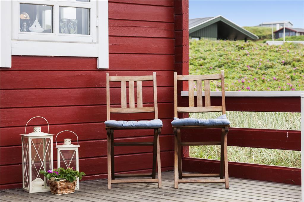Der er en skøn terrasse foran huset, og herfra har man føling med både huset, havet og klitlandskabet. Der er også plads til lidt boldspil foran huset, hvis der er boldspilglade familiemedlemmer med. Med beliggenheden lige bag klitten er der godt med læ for den af og til vilde vestenvind.