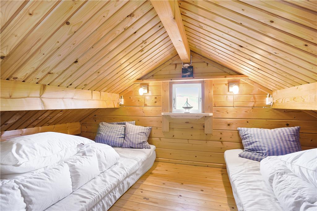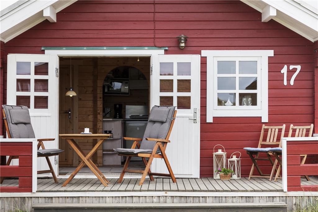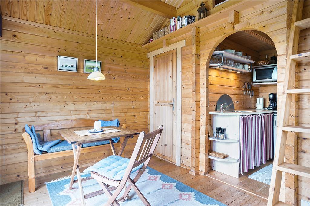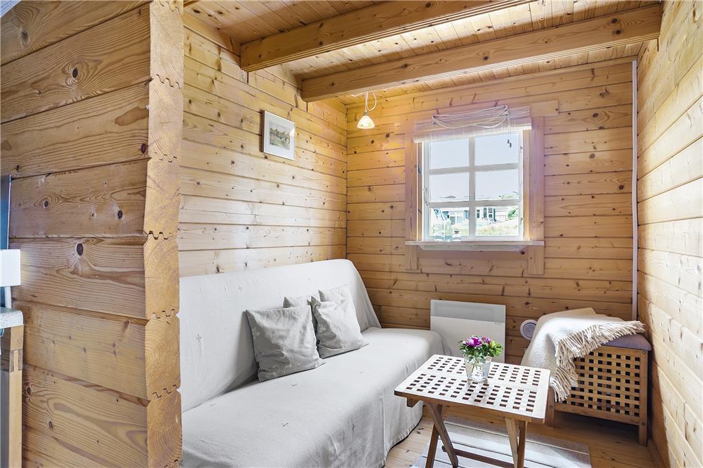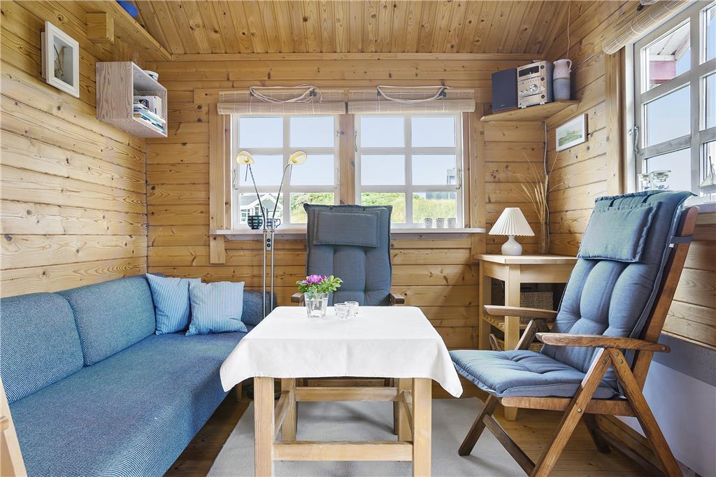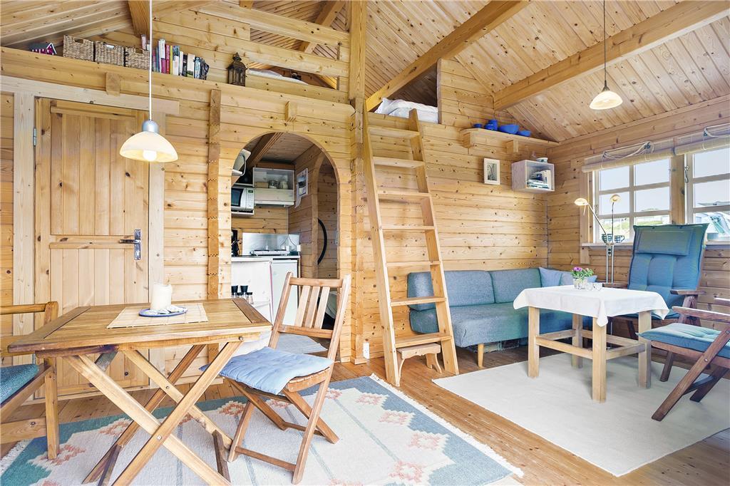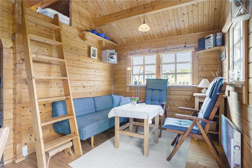 Man går direkte ind i stuen, som er indrettet med en sofa og minimalistiske møbler af hensyn til den lille plads. Men alt er virkelig hyggeligt og charmerende. Det lille men funktionelle køkken ligger i direkte forbindelse med stuen, så man kan både følge med i, hvad der sker i stuen og på terrassen, når der laves mad. På hemsen er der to madrasser, og her fra kan man skue ud over stuen, terrassen og det skønne klitlandskab, som omgiver huset. I værelset i stueplan er der en dobbelt sovesofa, ligesom sofaen i stuen også er egnet som soveplads, hvis man ikke har mod på at benytte hemsen. Der er et charmerende lille badeværelse med brusemulighed i feriehuset.