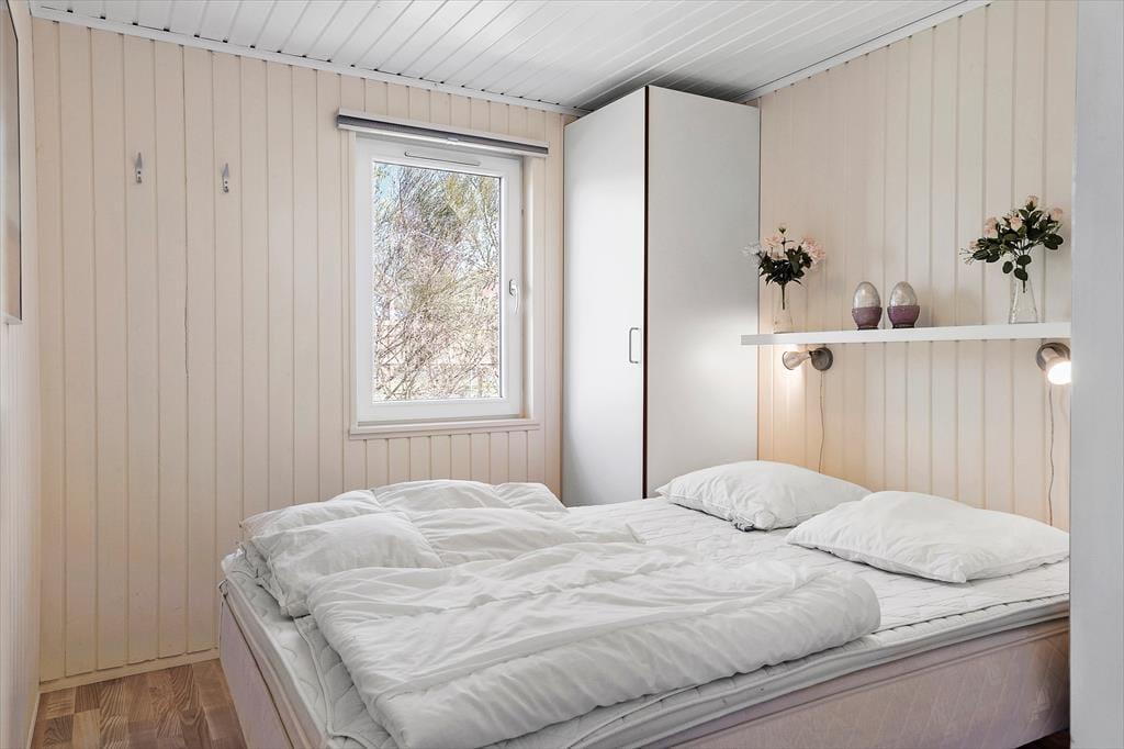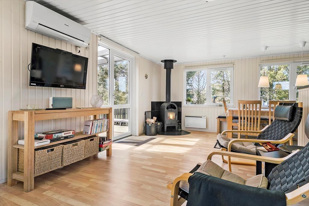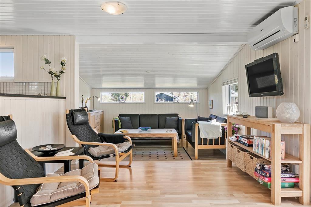 Mens selve sommerhuset måler 69 m2, har I yderligere 24 m2 at gøre godt med i annekset, og derfor er der god plads til seks personer inden døre. De to bygninger er forbundet af en delvist overdækket terrasse, der gør det nemt at smutte over for at sove eller spille bordfodbold. Annekset byder på to soverum, og derudover er der to soveværelser i selve sommerhuset, så I har flere fordelingsmuligheder, når det er sengetid. I løbet af dagen kan I samles i opholdsafdelingen, der består af køkken og stue i åben forbindelse, for at hygge jer med brætspil, lækker mad, læsestunder og alt det andet, en afslappende ferie kan byde på. I rummet er der brændeovn og varmepumpe, og så er der for øvrigt solvarme, som gør huset energivenligt. Planløsningen fuldendes af et nyt badeværelse fra 2022 med gulvvarme.