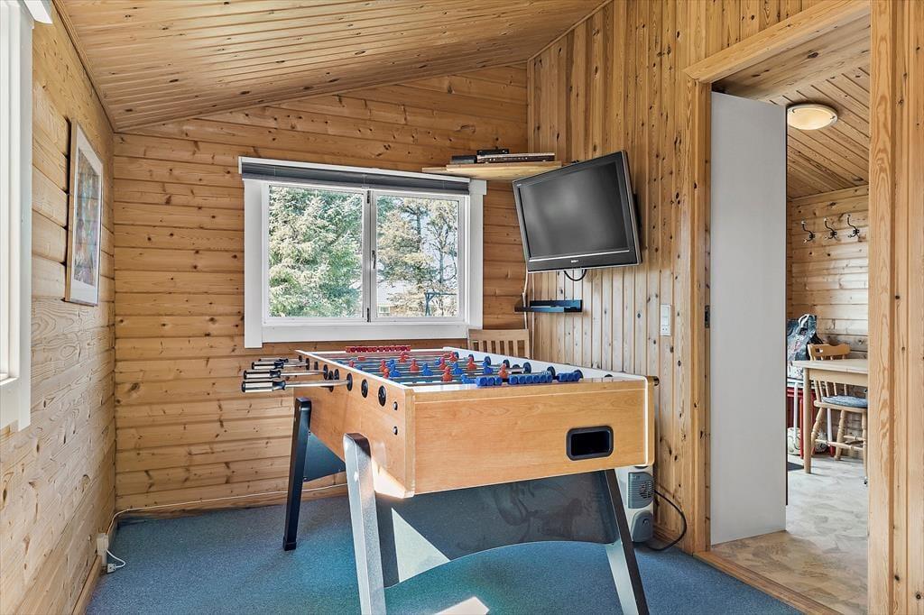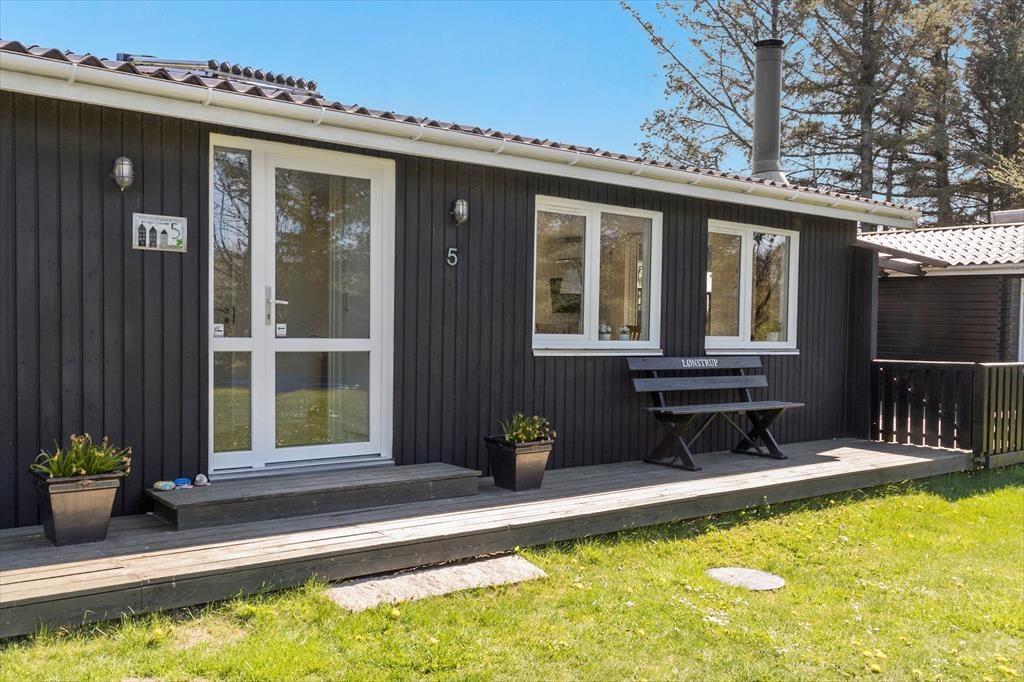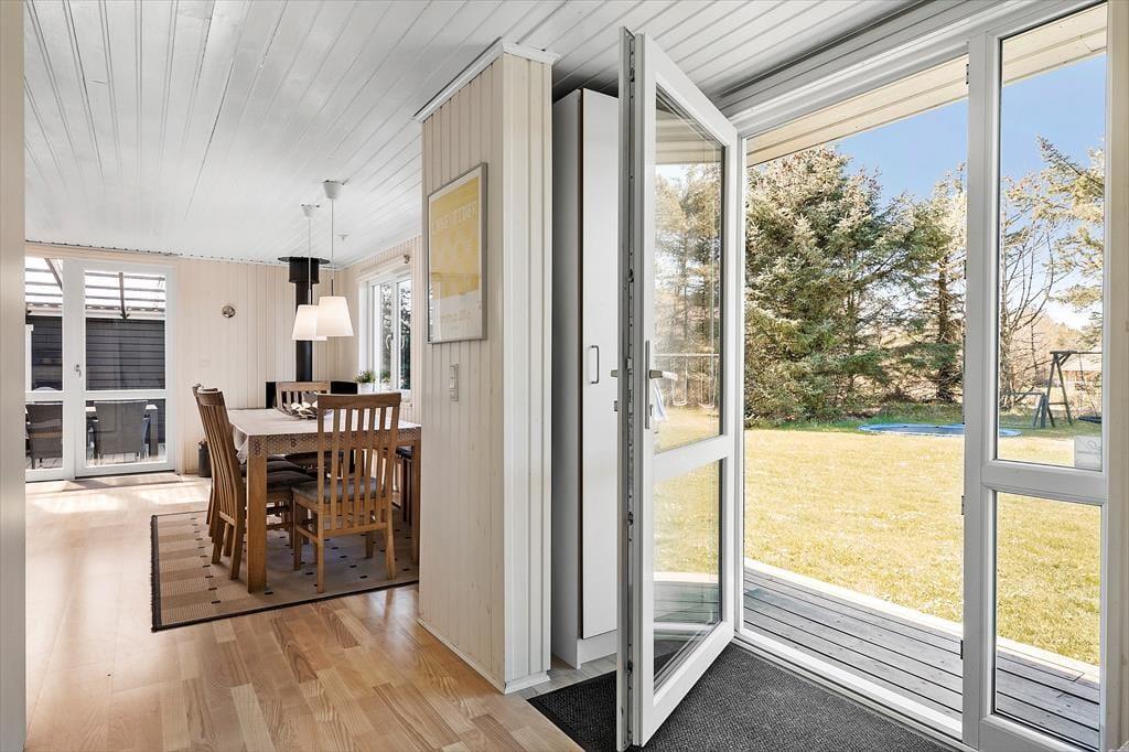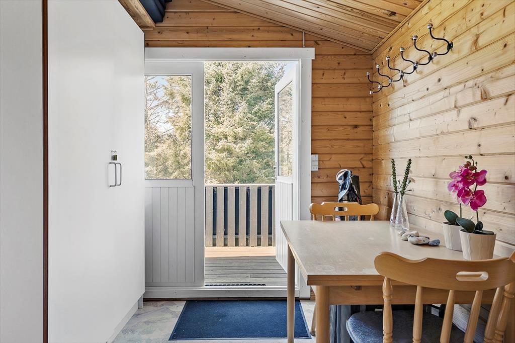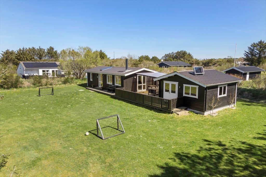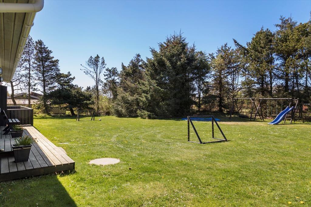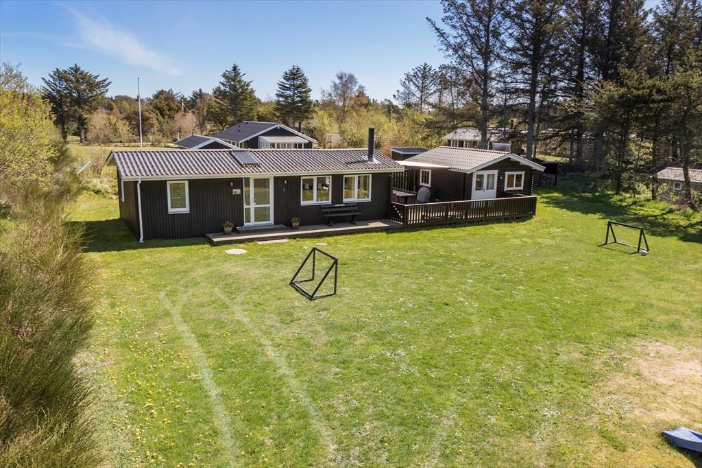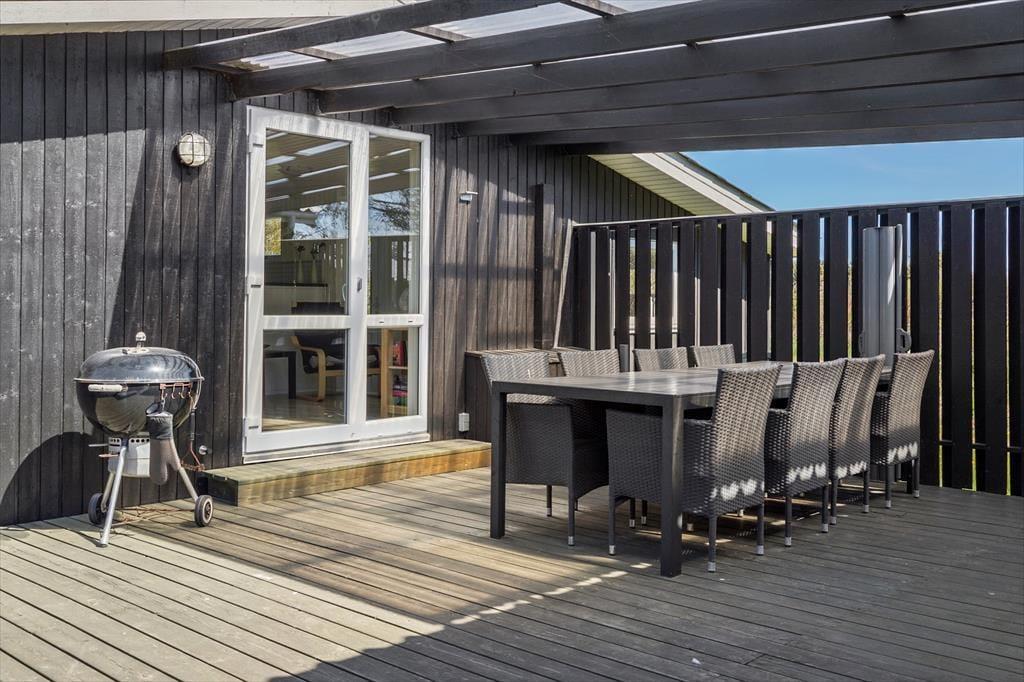 Rundt om sommerhuset er der anlagt flere terrasser, så I kan sætte jer lige der, hvor solforholdene er bedst. Nordøst for sommerhuset ligger en stor træterrasse, hvor I kan nyde solen lige fra morgenstunden og frem til klokken 14. Senere på dagen kan I rykke over på vestsiden af huset, hvor den store, delvist overdækkede terrasse ligger – den er for øvrigt også helt aflukket, hvilket er et hit for hundeejere og børnefamilier med små børn. De yngste familiemedlemmer kan desuden glæde sig til at spæne rundt på græsplænen på den store grund, der også byder på trampolin, gyngestativ og fodboldmål.