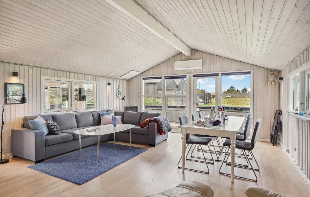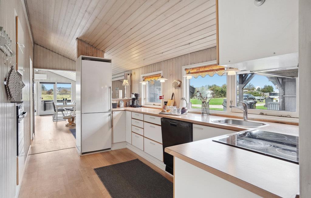 Velkommen til dette komfortable feriehus, med kort vej til Vesterhavet og roligt beliggende for enden af en vej. Her finder I de helt ideelle rammer for en tid med velvære, afkobling og nærvær. Det dejlige hus med en behagelig lys atmosfære byder på alt, hvad I har brug for til en ubekymret ferie og inviterer til at svinge grydeskeen som hobbykok i det hjemlige køkken, til at slappe af i den store hjørnesofa eller til at spille brætspil ved spisebordet. Hvem mon vinder? På den store indhegnede terrasse kan I nyde solen på liggestolene, spise friske jordbær under parasollen, grille og indtage aftenkaffen. Mens I planlægger de næste dages aktiviteter, kan jeres små tumle i haven og bruge legeredskaberne. På den store græsplæne er der lagt op til alletiders fodboldkamp.