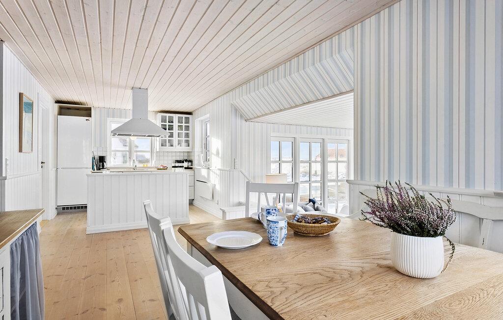 Huset ligger tæt på stranden i det flotte, åbne klitlandskab, og her er der lagt op til en allelunde dejlig ferie. Indretningen fremstår lyst og indbydende, og i det åbne opholdsrum mødes køkkenet og stue i et dejligt lysindfald gennem de store vinduespartier. Nyd godt af husets komfort på de to etager og af havudsigten, som kan nydes fra stuen og er virkelig behagelig. Tillad jer selv lidt ekstra wellness og glid ned i boblebadet, inden I lader en sommeraften gå på hæld med en kølig drink på terrassen.