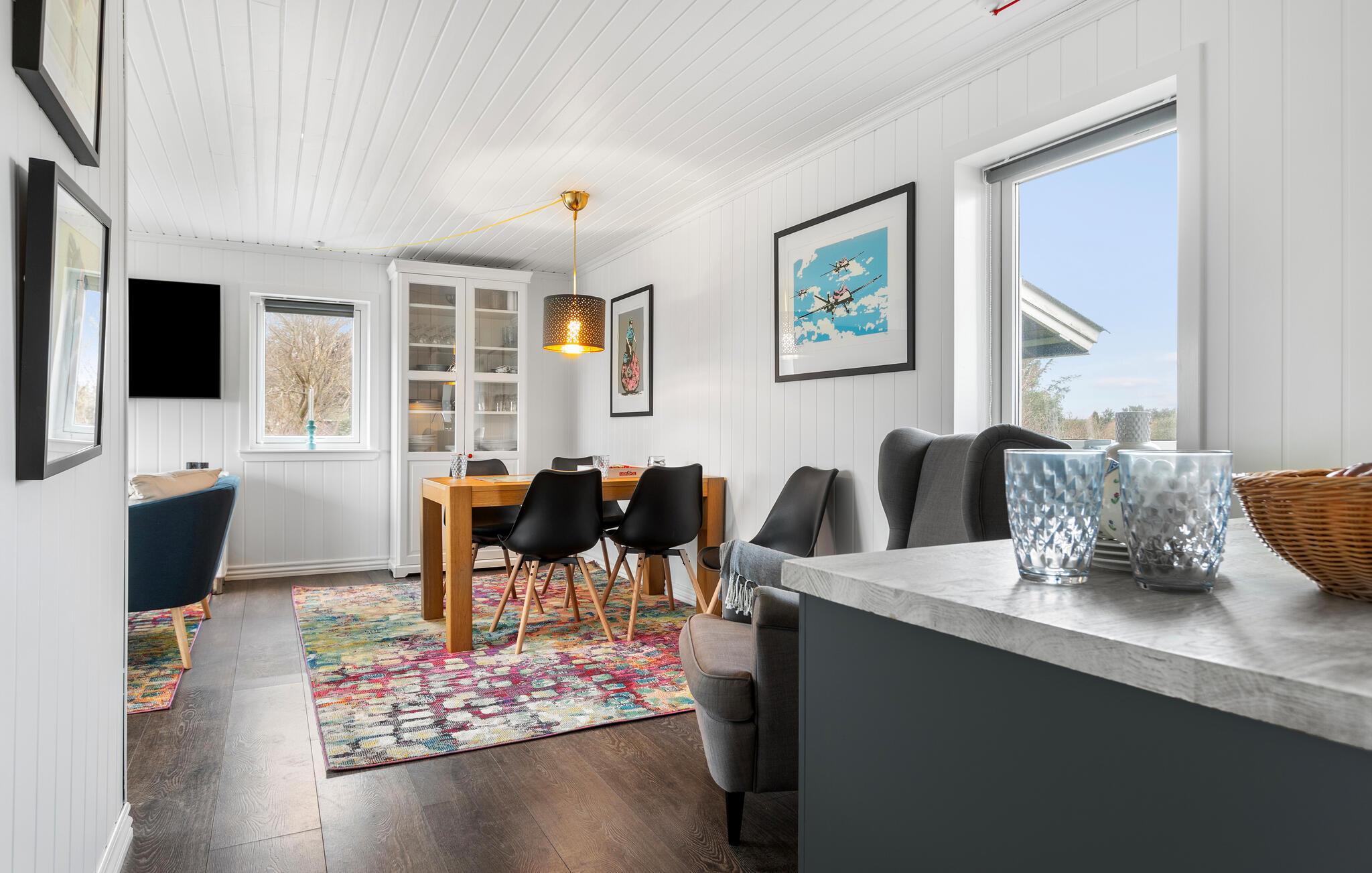 Jeres lyse og stilfuldt indrettede feriehus lover afslappende dage, hvor I alle sammen kan nyde en harmonisk pause fra hverdagen. Tilbered jeres måltider i det moderne køkken, og tag plads ved det indbydende spisebord. Oplev glædelige øjeblikke med en spilleaften, eller hyg jer med en bog i den komfortable stue.