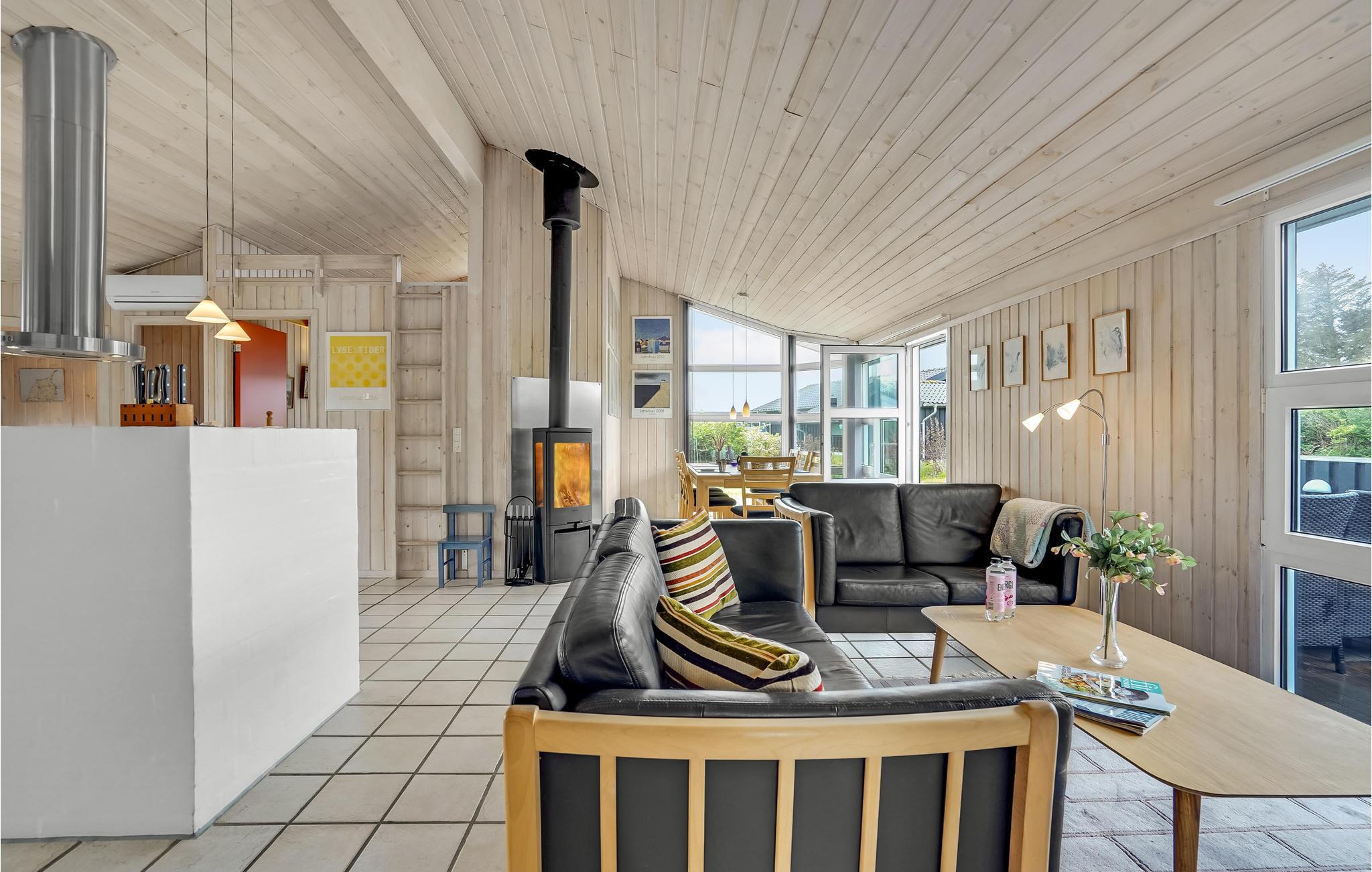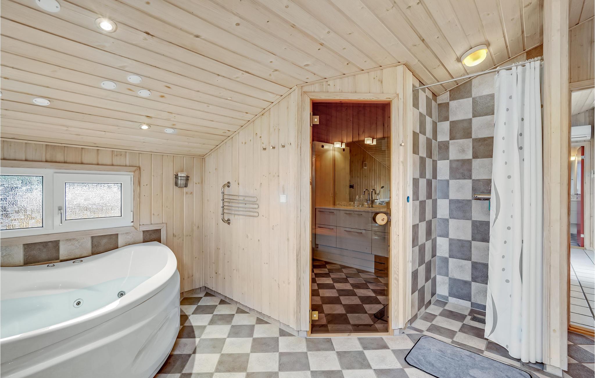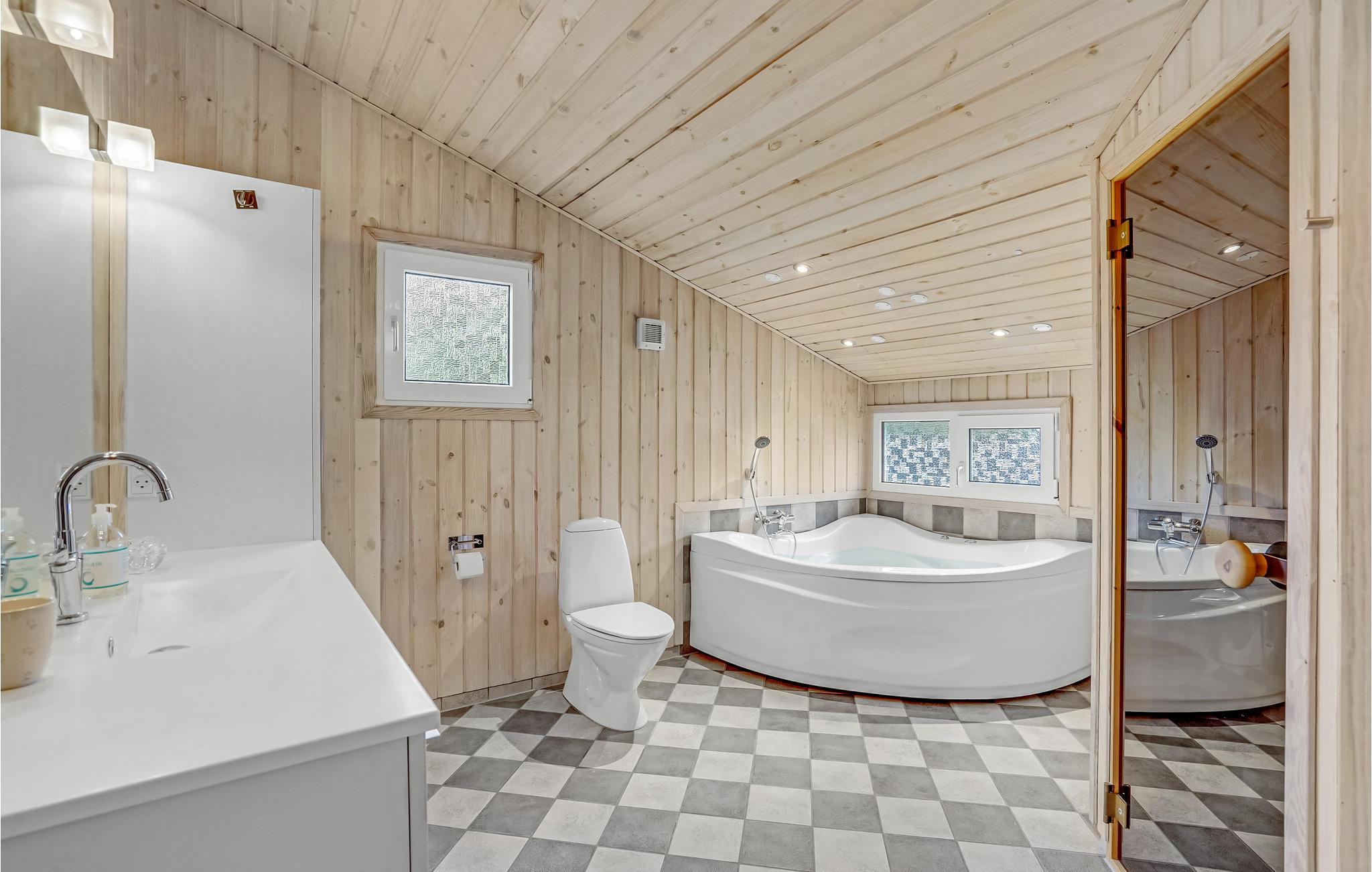 Glæd jer til nogle skønne dage i dette rummelige, lyse og praktisk indrettede feriehus. Over 100 m2 terrasser og den skønne, børnevenlige grund indbyder til solbadning, leg, sport, udendørsspil og hyggelige grillaftener. Op til tre kæledyr er også velkomne her, så hele familien kan holde ferie sammen. Takket være spa og sauna kan I se frem til rendyrket ferieafslapning, men hovedattraktionen er det lækre vildmarksbad, hvor en drink kan nydes om aftenen til den dejlige kombination af vildmarksbadets varme vand og den friske luft. En god feriedag kan afsluttes i opholdsstuen foran brændeovnen og fladskærmen, som er udstyret med Chromecast, således at I kan streame jeres yndlingsfilm- og serier.