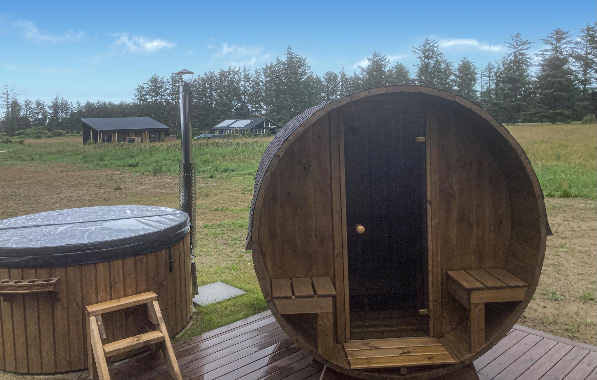 Moderne træhus ved Lønstrup med vildmarksbad, stor have og legeredskaber for en skøn familieferie.