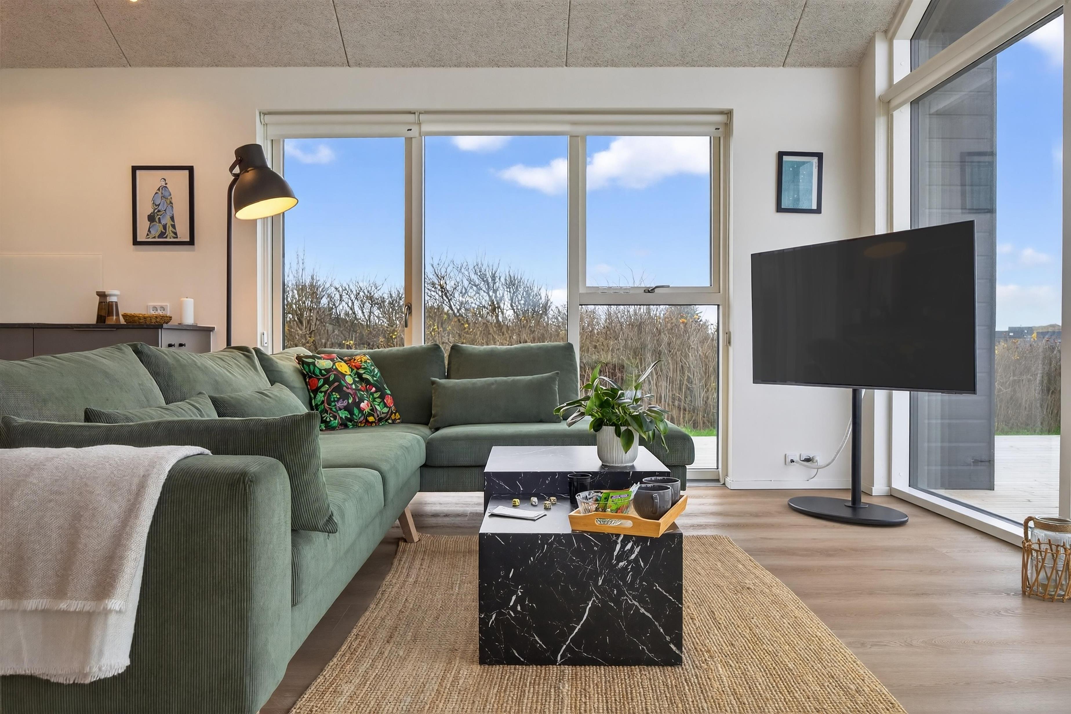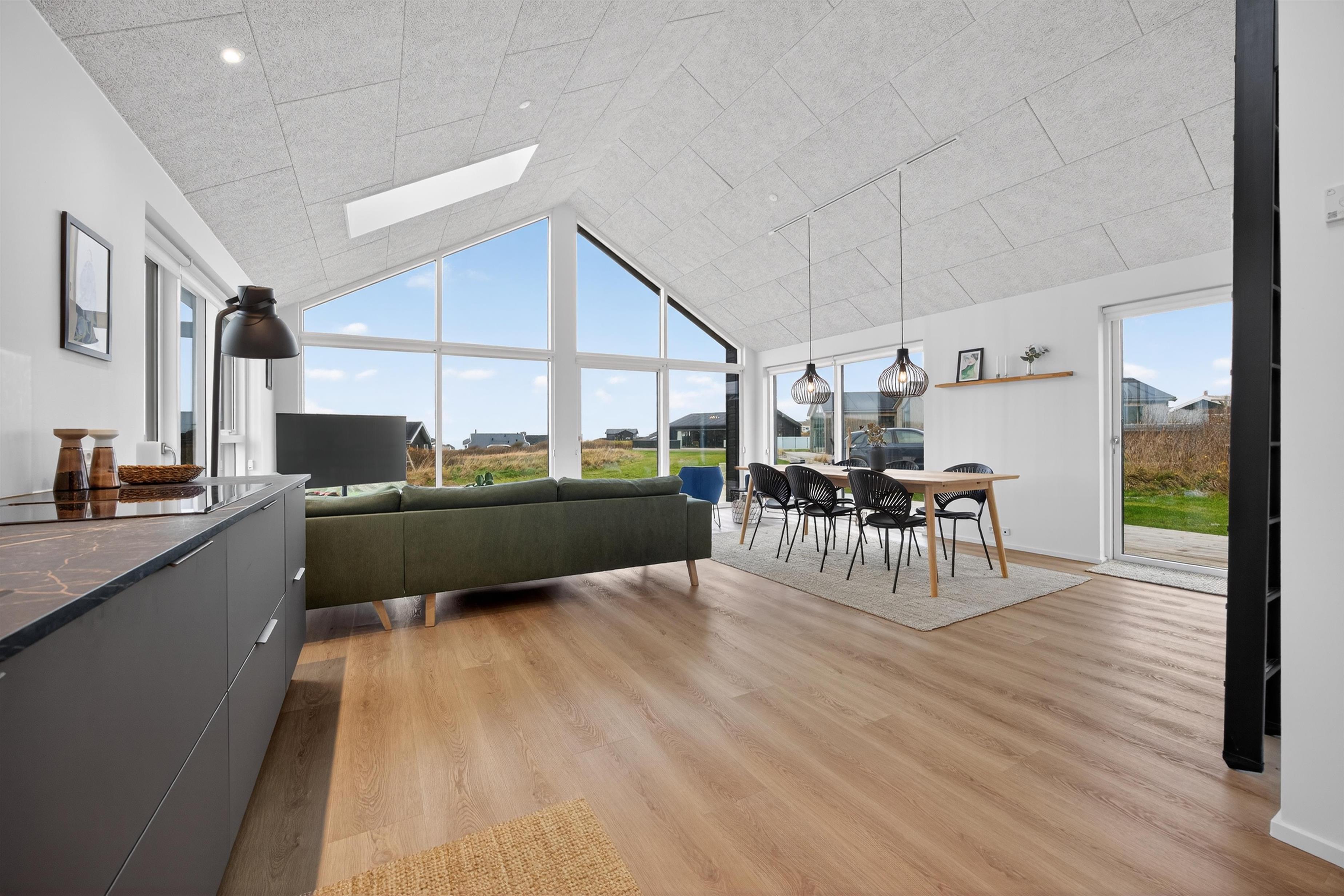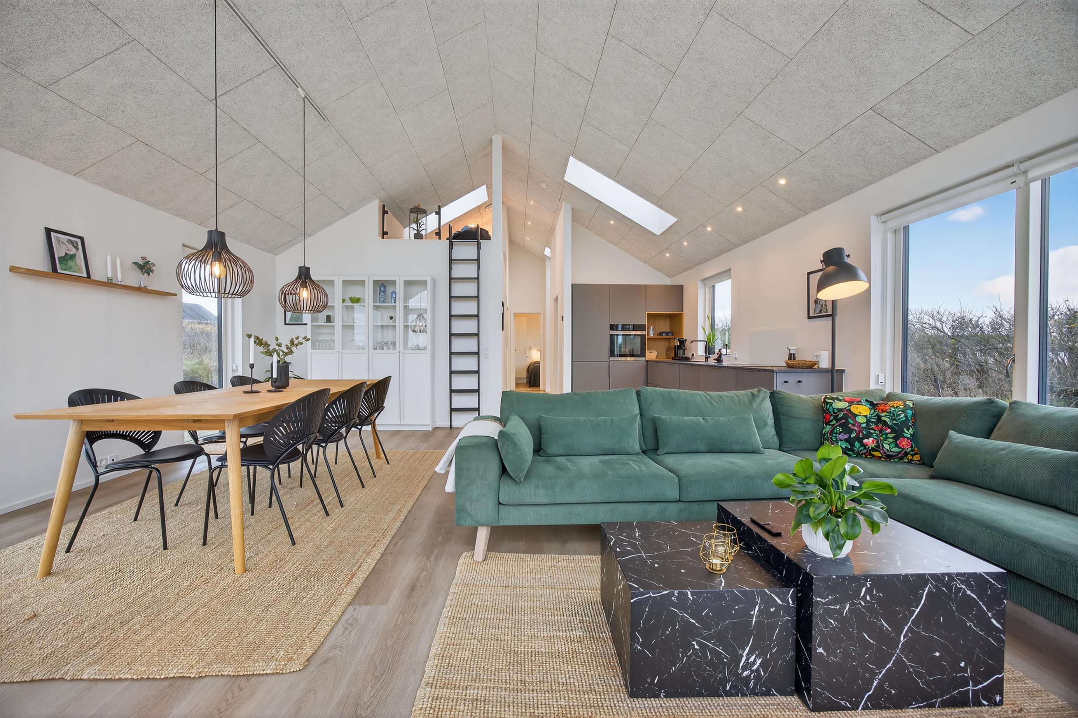 Velkommen til et nyt og moderne sommerhus, hvor kvalitet og komfort går hånd i hånd. Allerede i entréen mærker du rummeligheden og den høje loftshøjde, som giver huset en luftig og indbydende atmosfære. Herfra træder du ind i en smukt indrettet opholdsafdeling med store panoramavinduer, der lukker havets horisont ind i stuen.