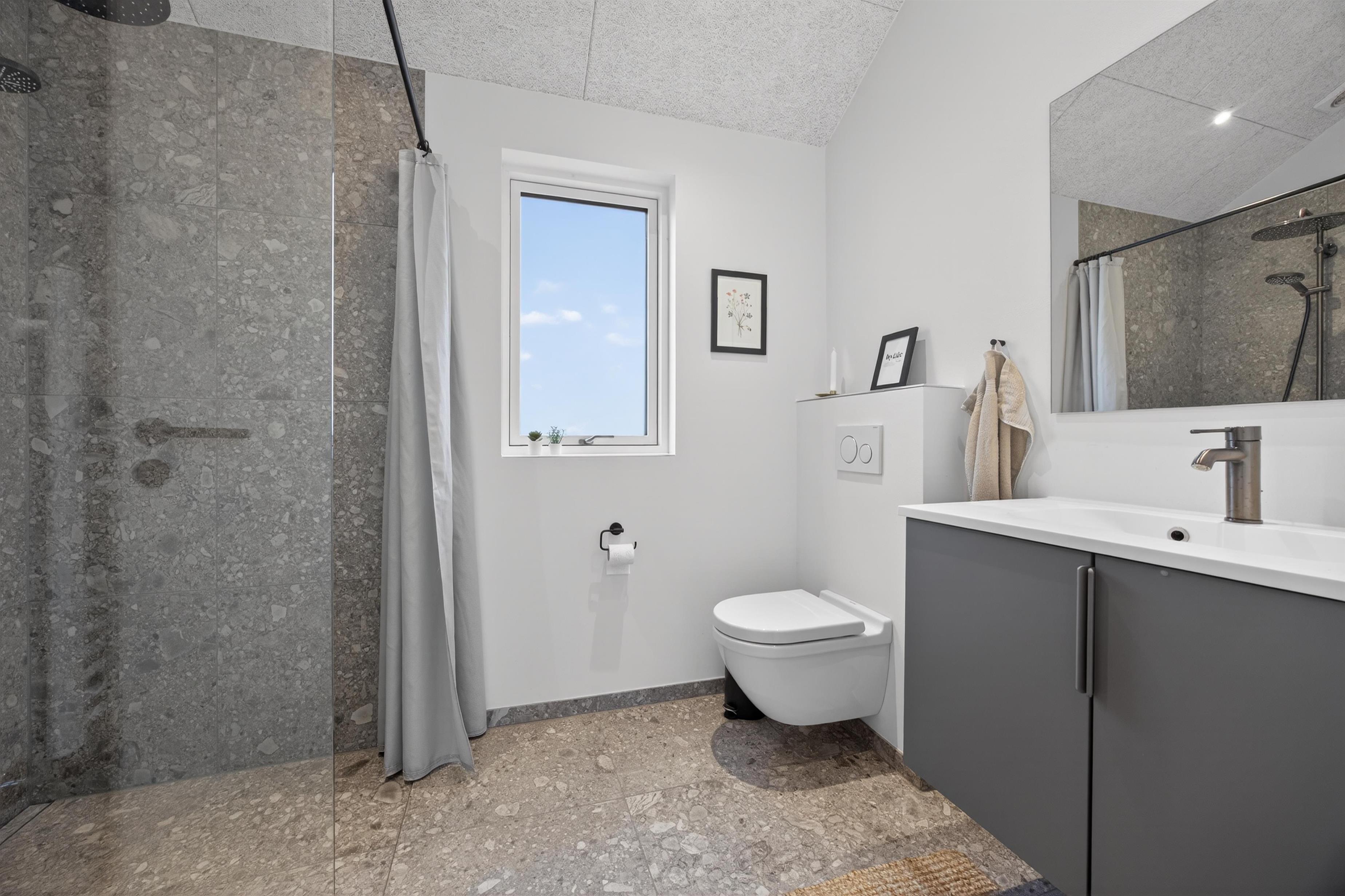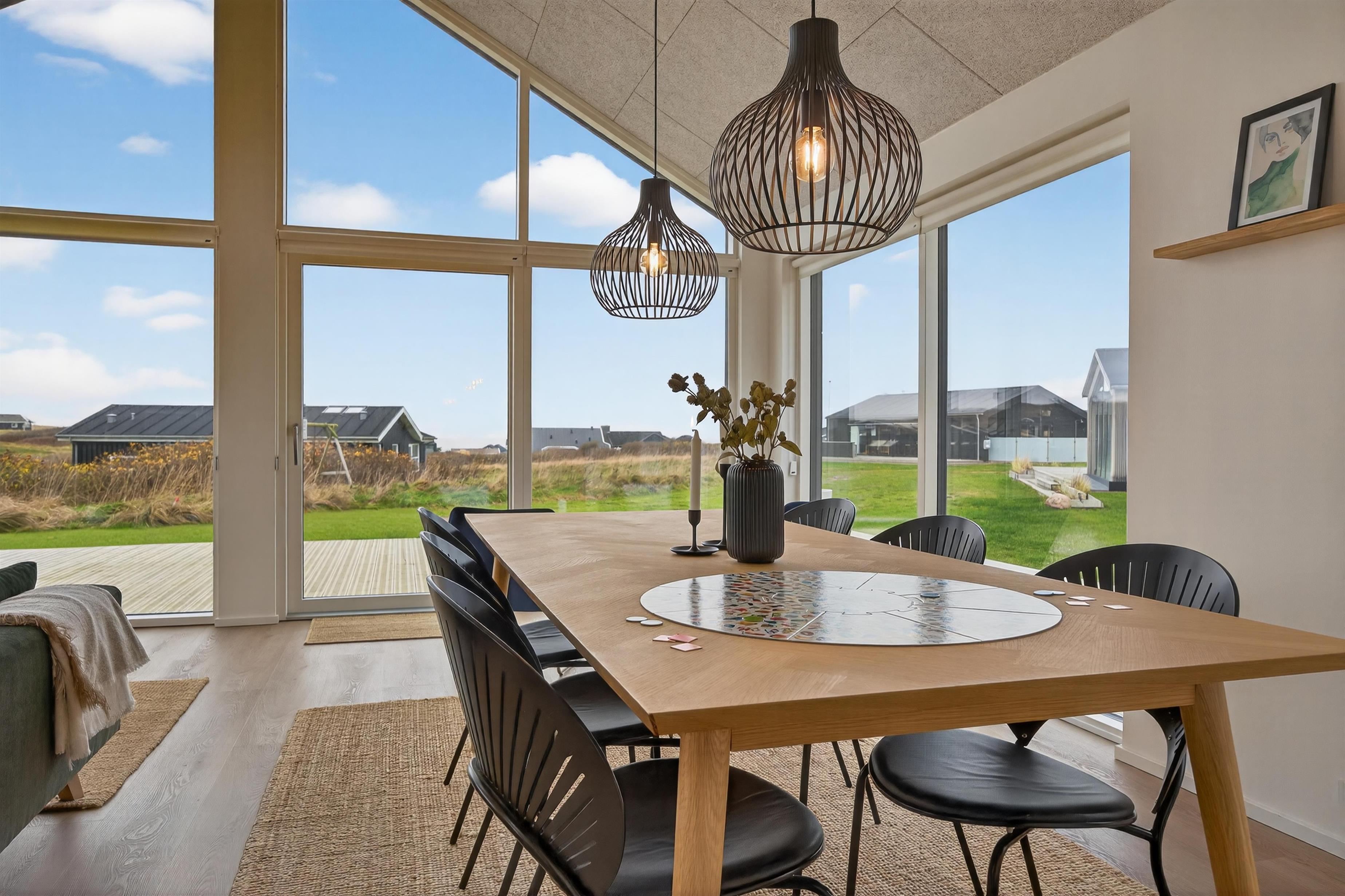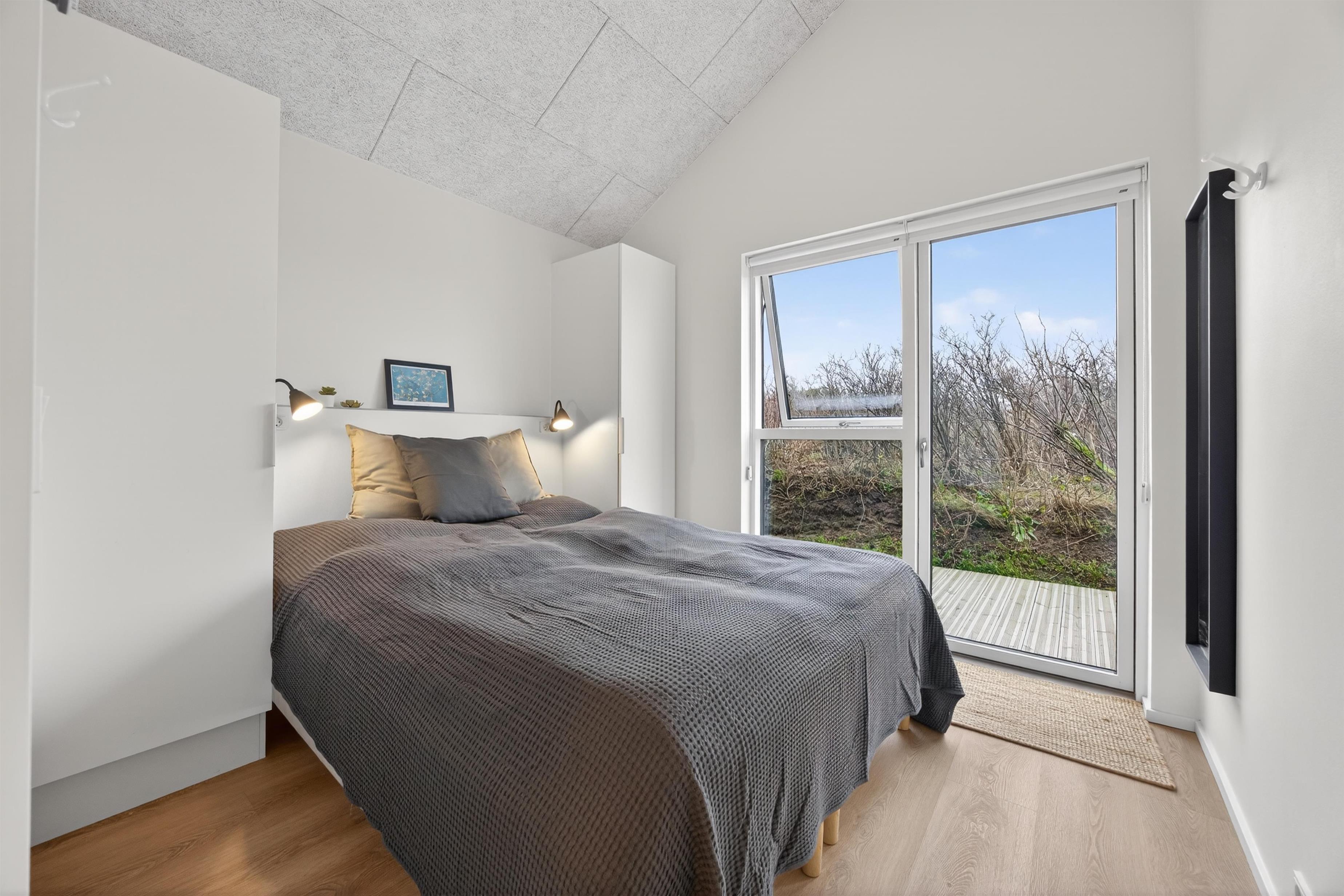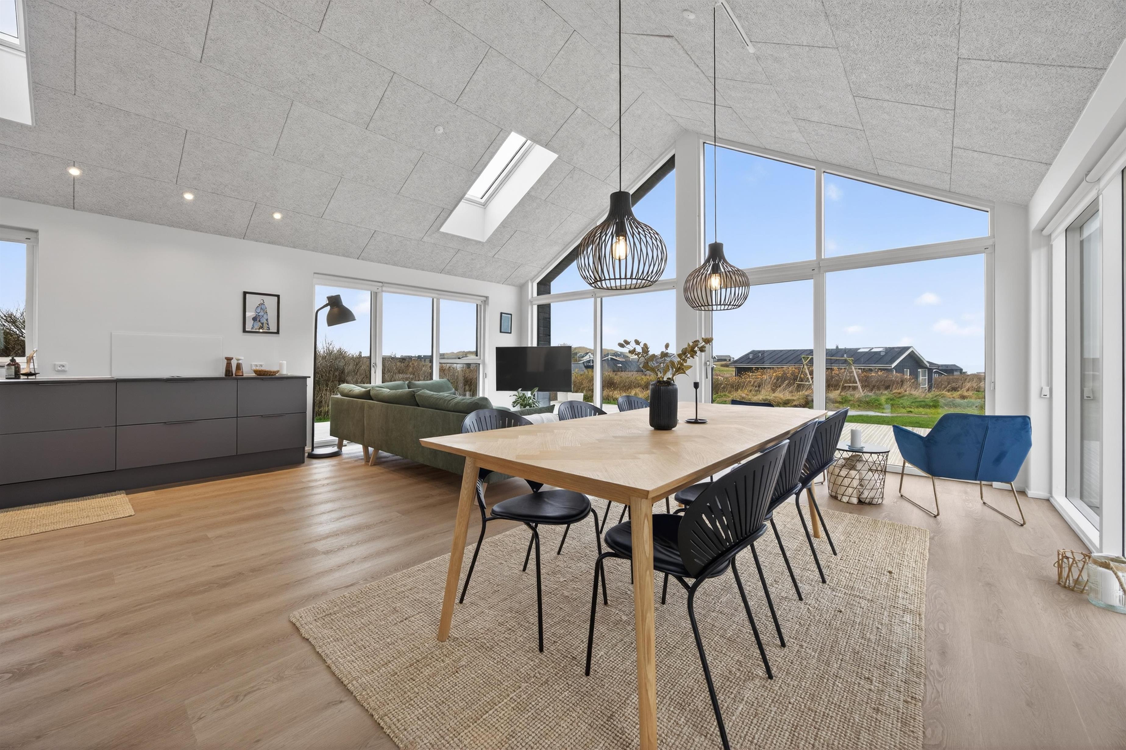 Velkommen til et nyt og moderne sommerhus, hvor kvalitet og komfort går hånd i hånd. Allerede i entréen mærker du rummeligheden og den høje loftshøjde, som giver huset en luftig og indbydende atmosfære. Herfra træder du ind i en smukt indrettet opholdsafdeling med store panoramavinduer, der lukker havets horisont ind i stuen.