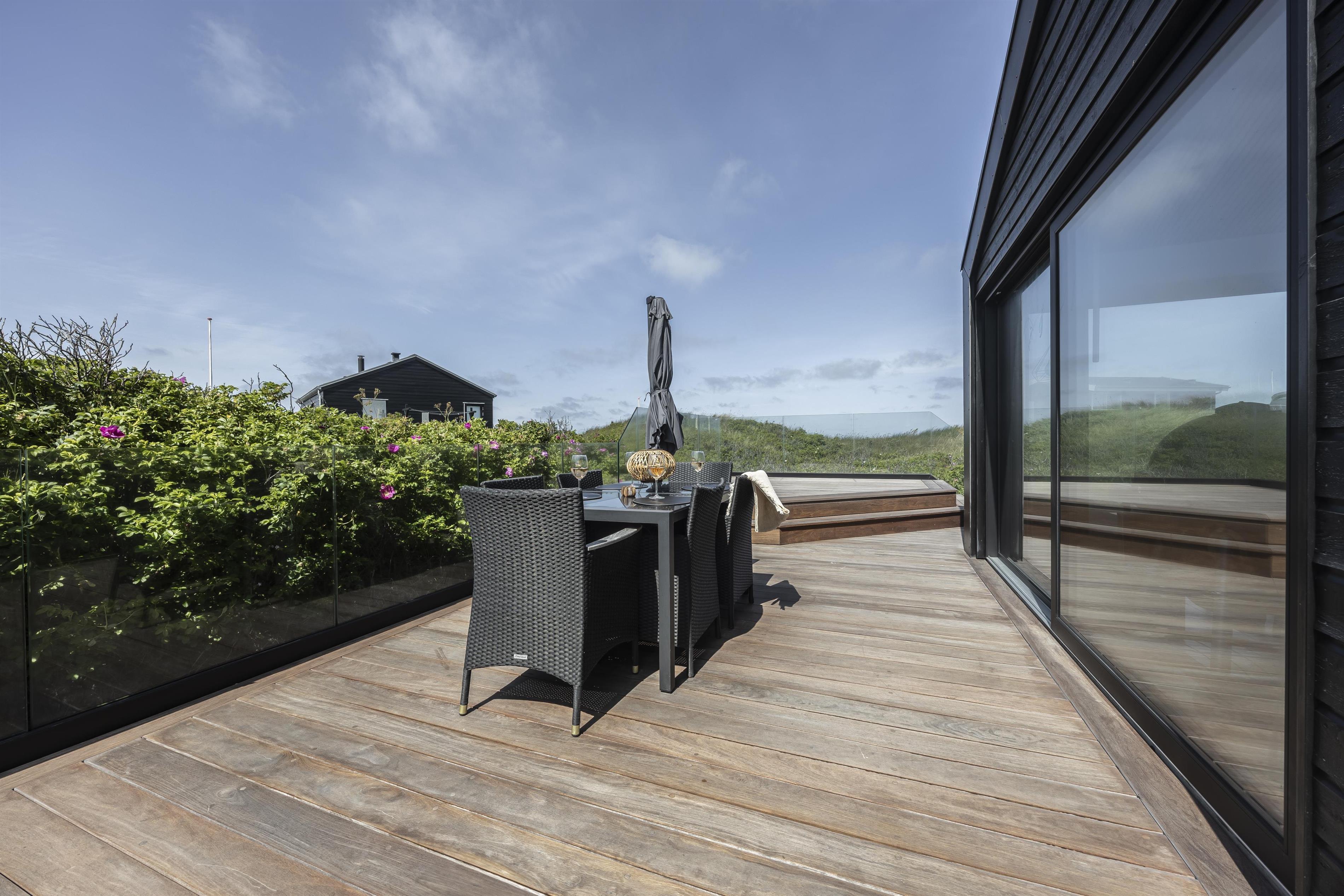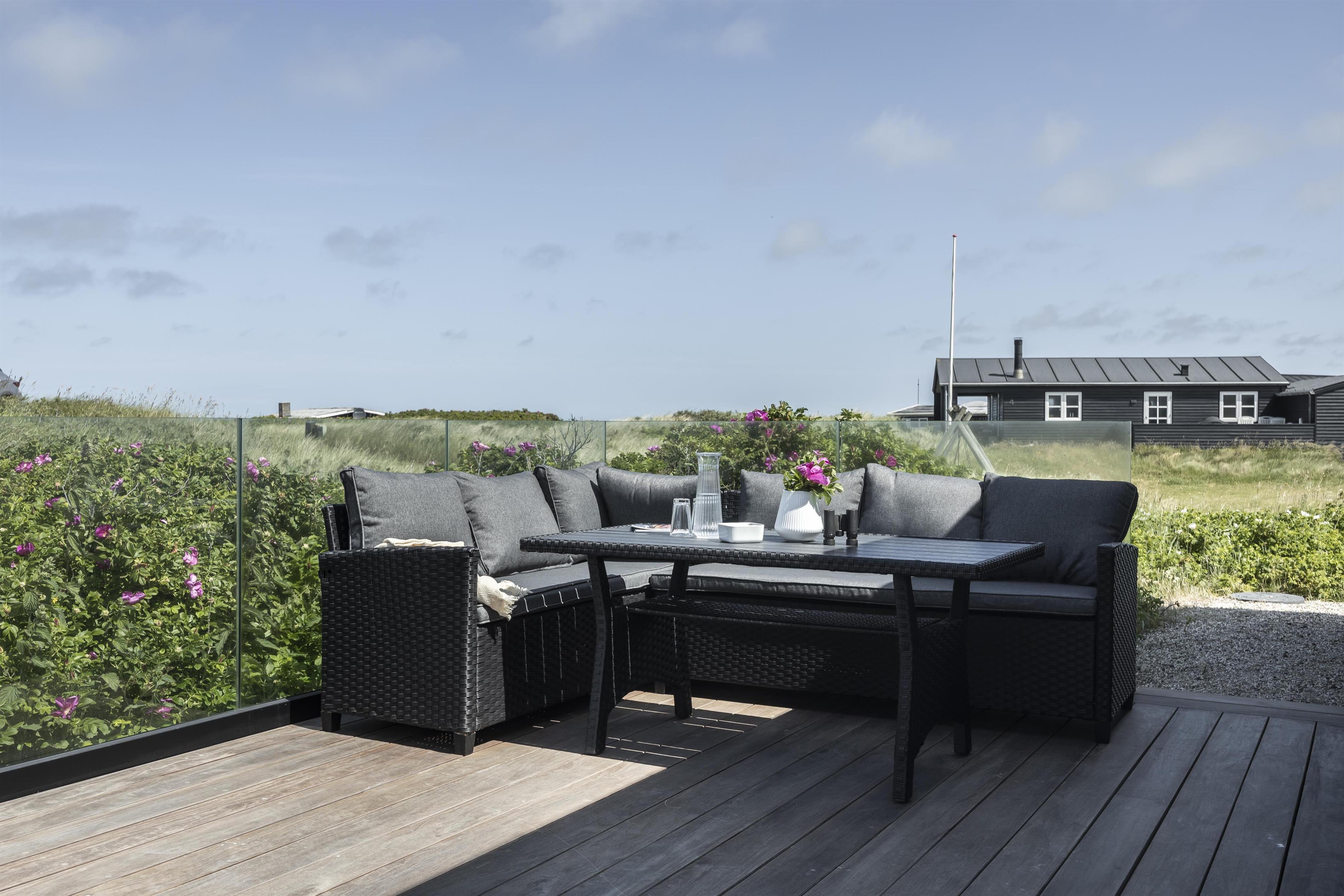 Den spektakulære udsigt fra dette feriehus er helt enestående og kan nydes fra flere dejlige terrasser, som er anlagt rundt om huset. På vestsiden af huset findes en stor terrasse, hvor en del af den er forhøjet. Her vil det være oplagt at nyde et dejligt måltid tilberedt på grillen og følge med i den flotte udsigt og dragende solnedgang lige for øjnene af jer. Terrassen er desuden afskærmet med glas for at skabe læ for den, til tider, barske vestenvind.