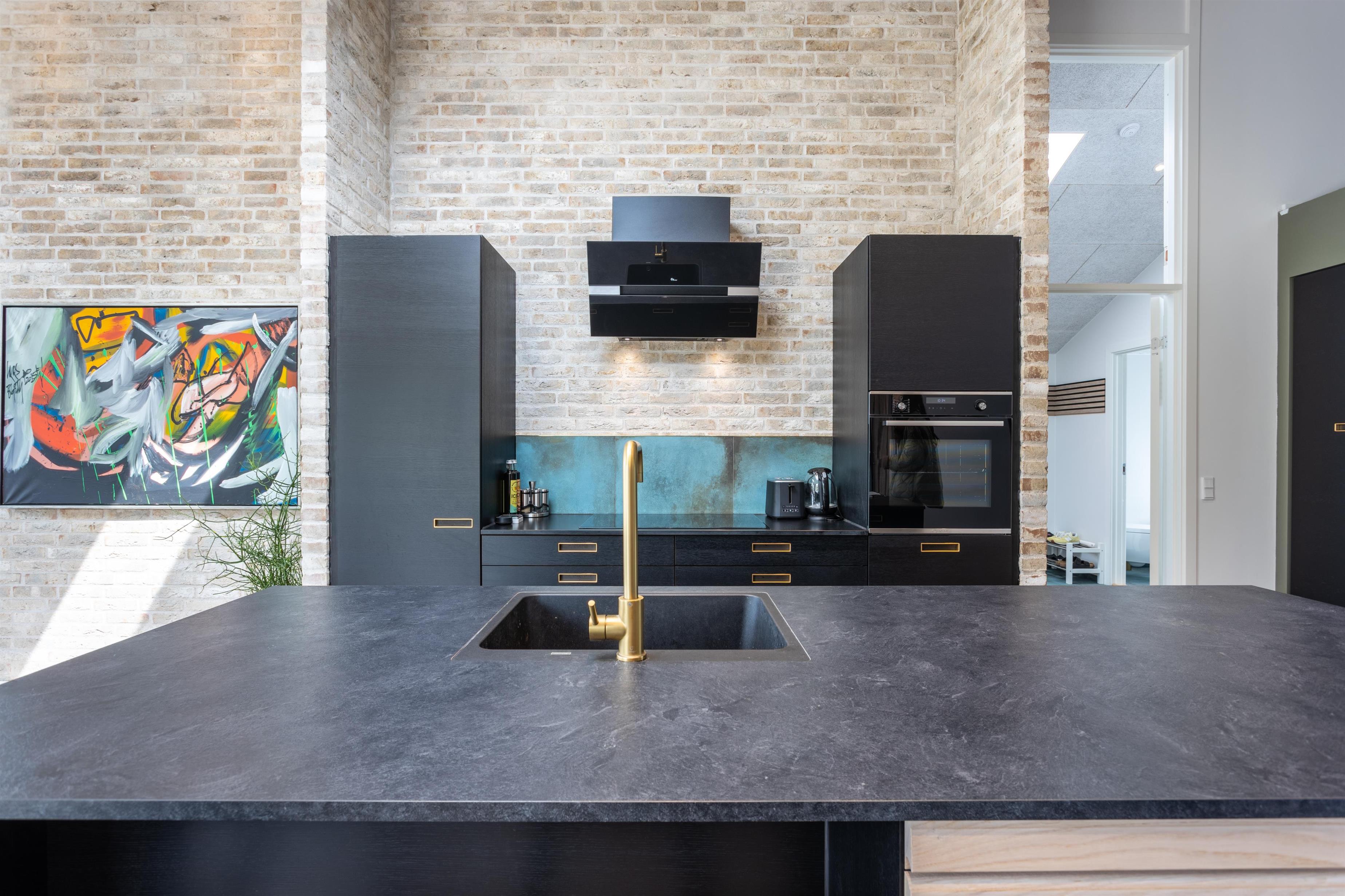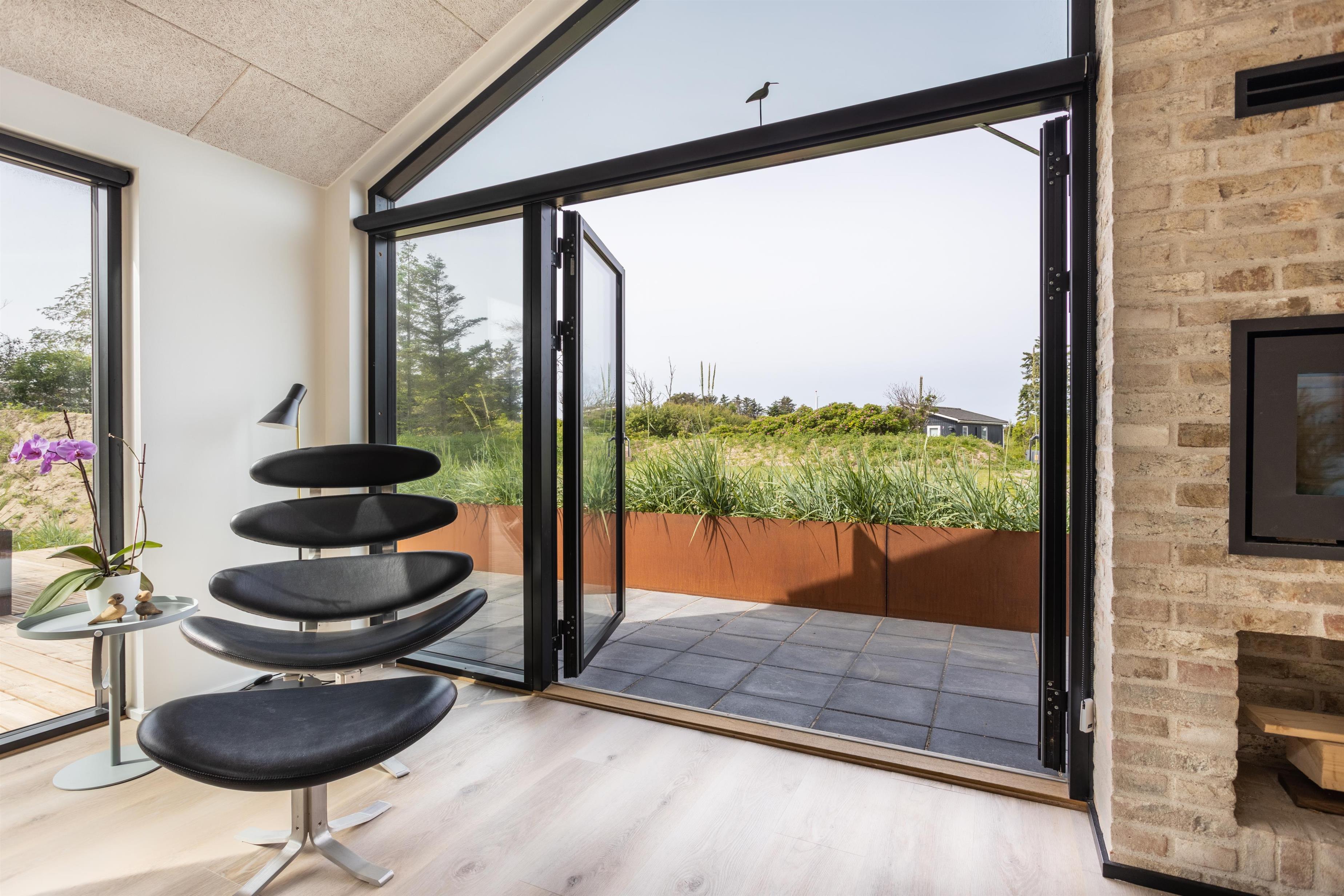 Køkkenalrummet er husets hjerte og de store vinduespartier giver det smukkeste lys. Det mørke køkken, messingdetaljerne, de rå vægge og interiøret er alt sammen nøje afstemt og er med til at give huset liv og gøre det hyggeligt. Huset råder også over to gode værelser med TV samt en stor hems. Fra både spisepladsen og stuen kan I nyde ildens knitren i brændeovnen - en perfekt detalje efter en lang gåtur ved stranden, hvor man måske også åbner en flaske vin fra vinkøleskabet.