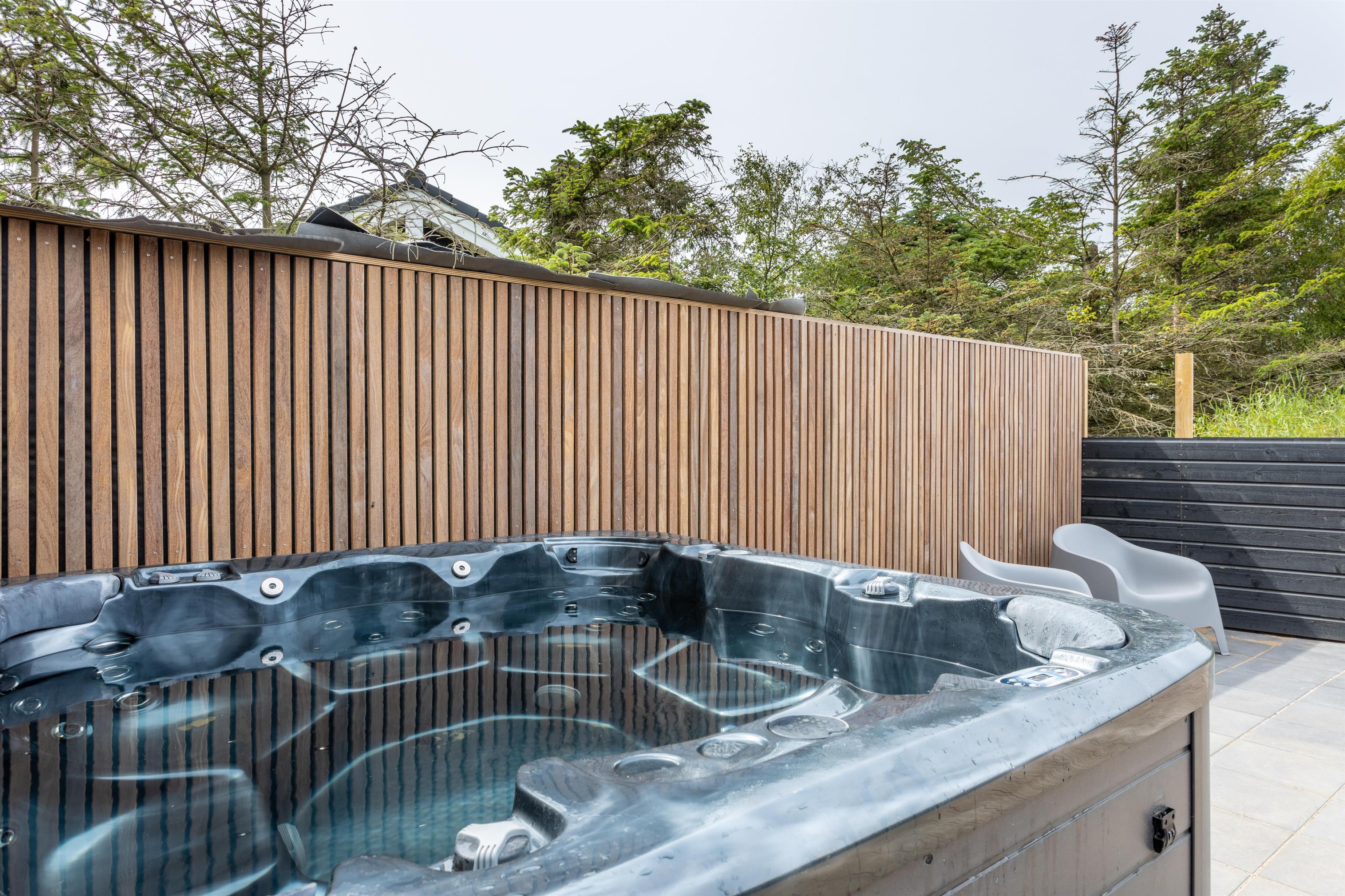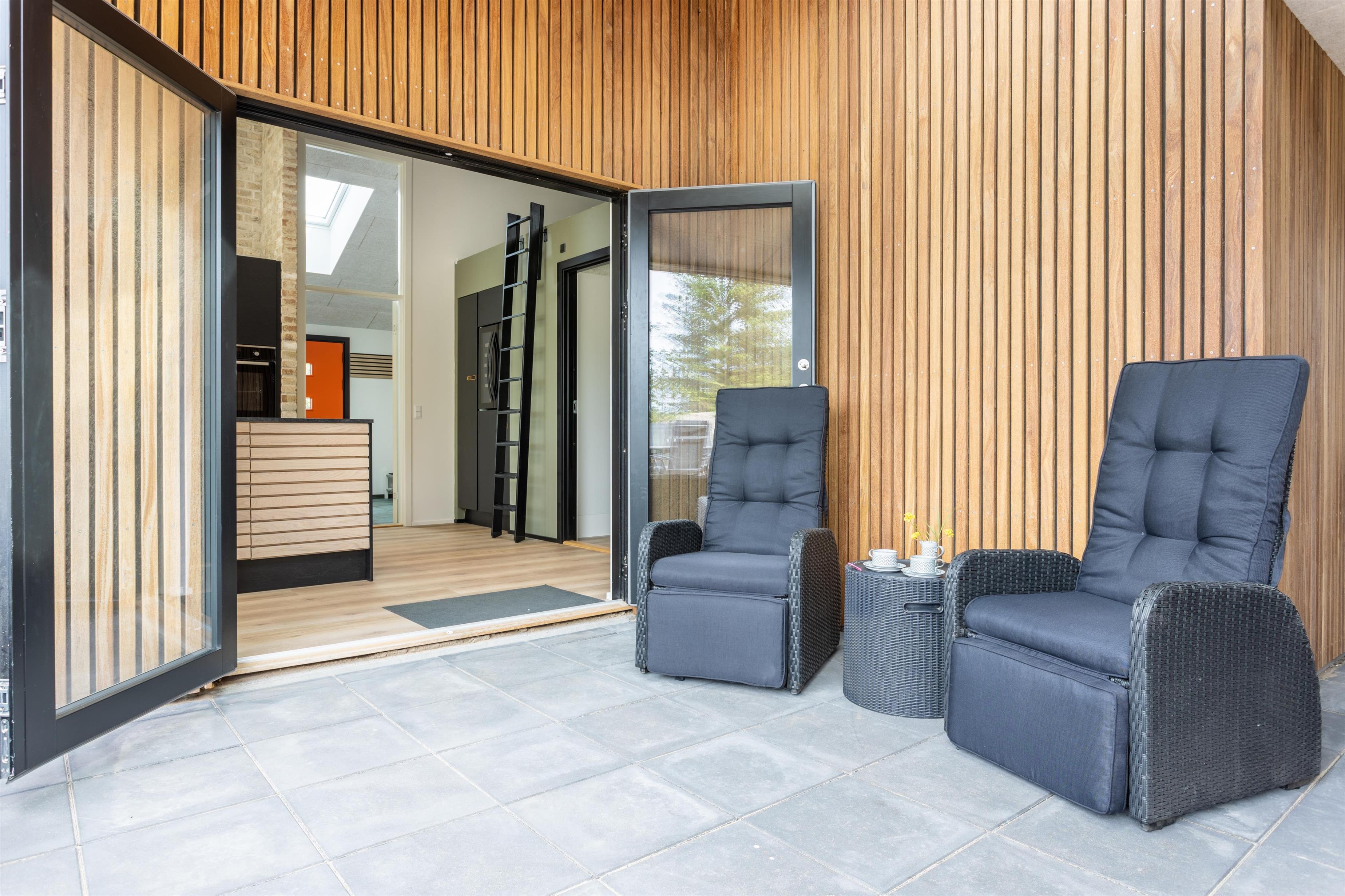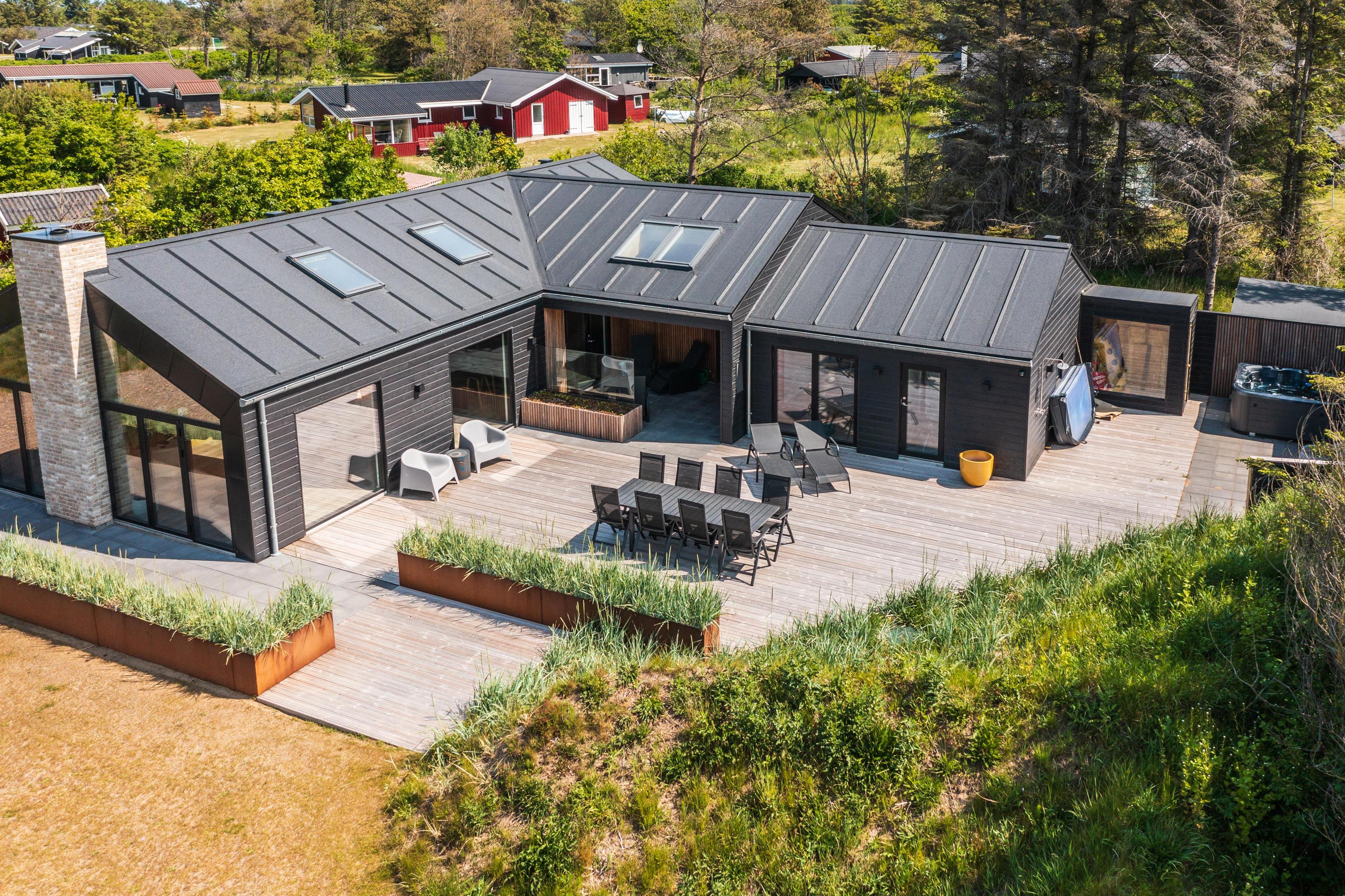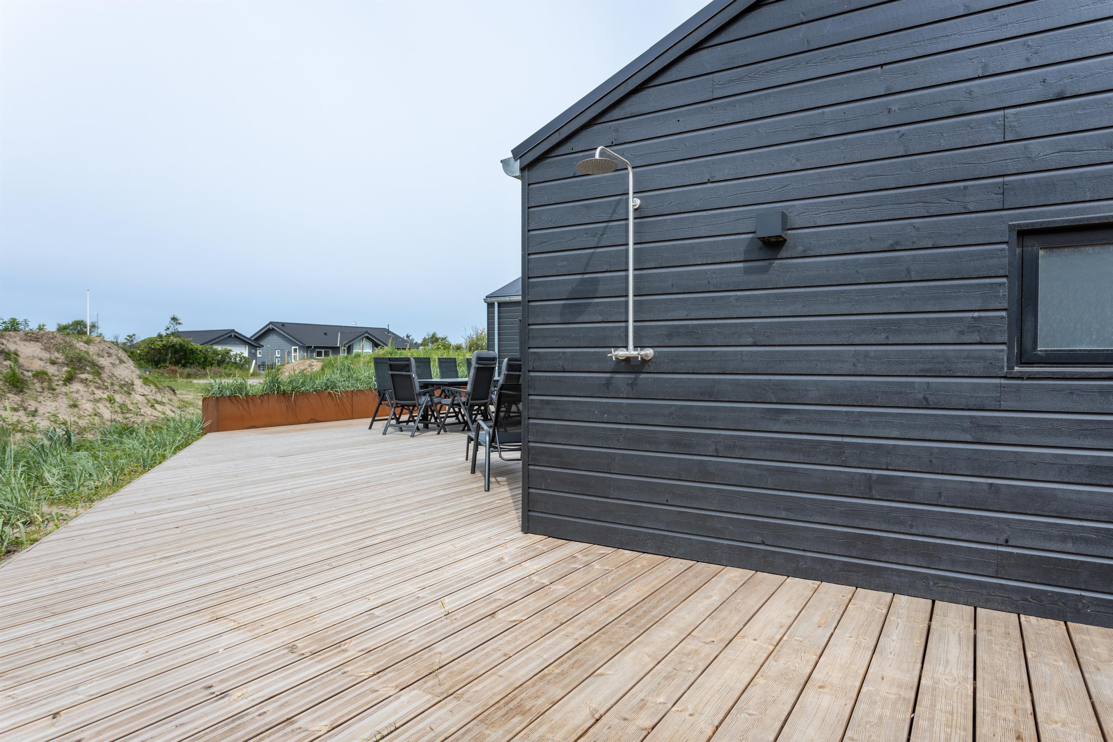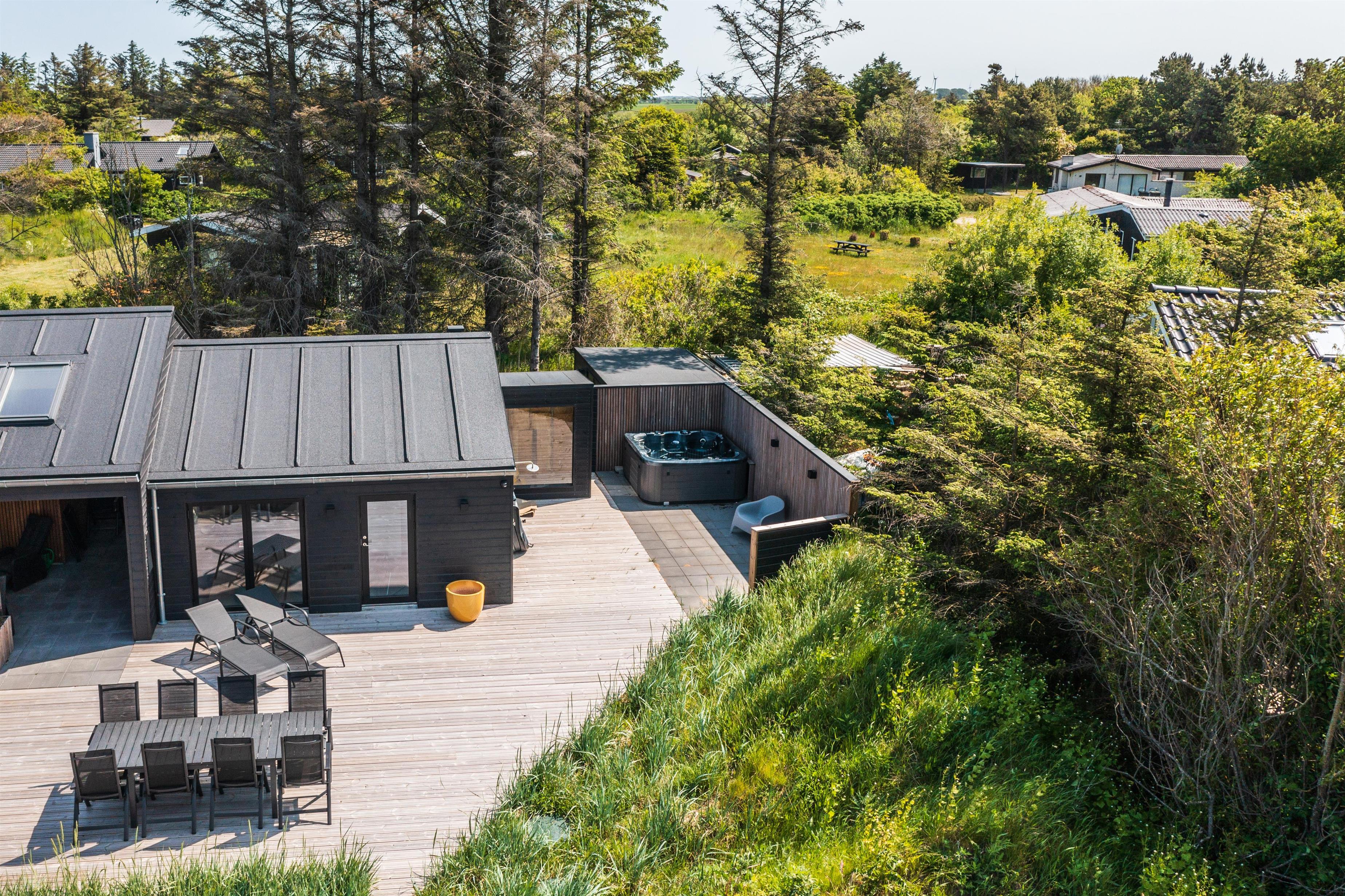 På husets syd-side er der etableret en stor, delvist overdækket terrasse, hvor I kan nyde sommeren i ro og mag. Fordi huset kan rumme hele 10 personer, har man tænkt flere uderum og lækroge ind i indretningen. Terrassen byder desuden på en udebruser samt en stor udespa med 8 siddepladser.