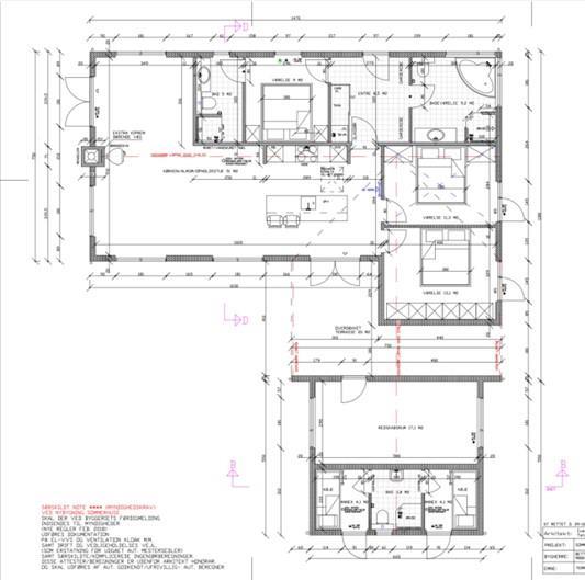 Med til feriehuset hører også et fint anneks med to soveværelser, et badeværelse og et multirum. Fra annekset kan I gå via den overdækkede terrasse ind til hovedhuset. Obs. I annekset er der indgang til værelserne fra multirummet - dette fremgår ikke på plantegningen.