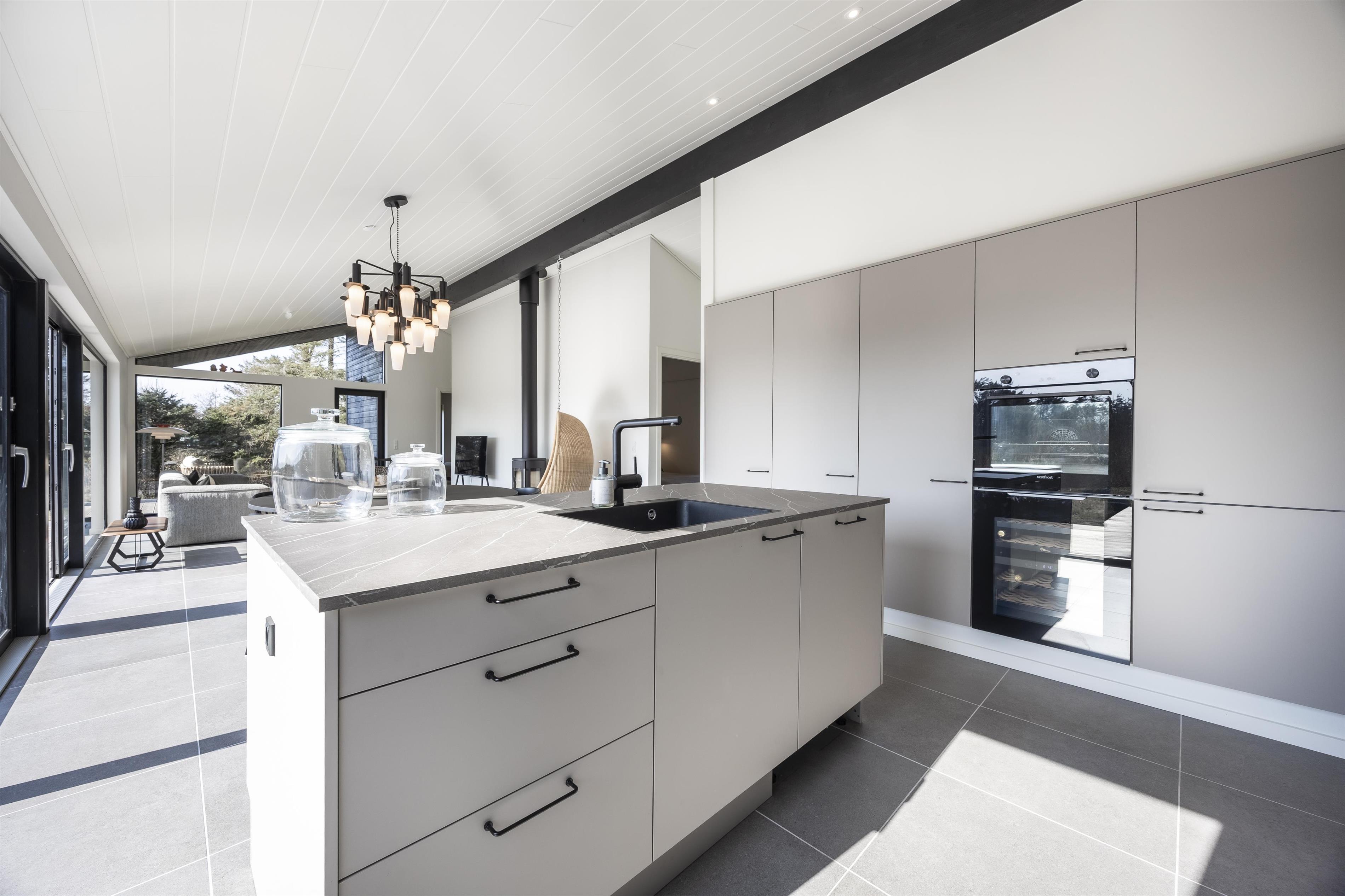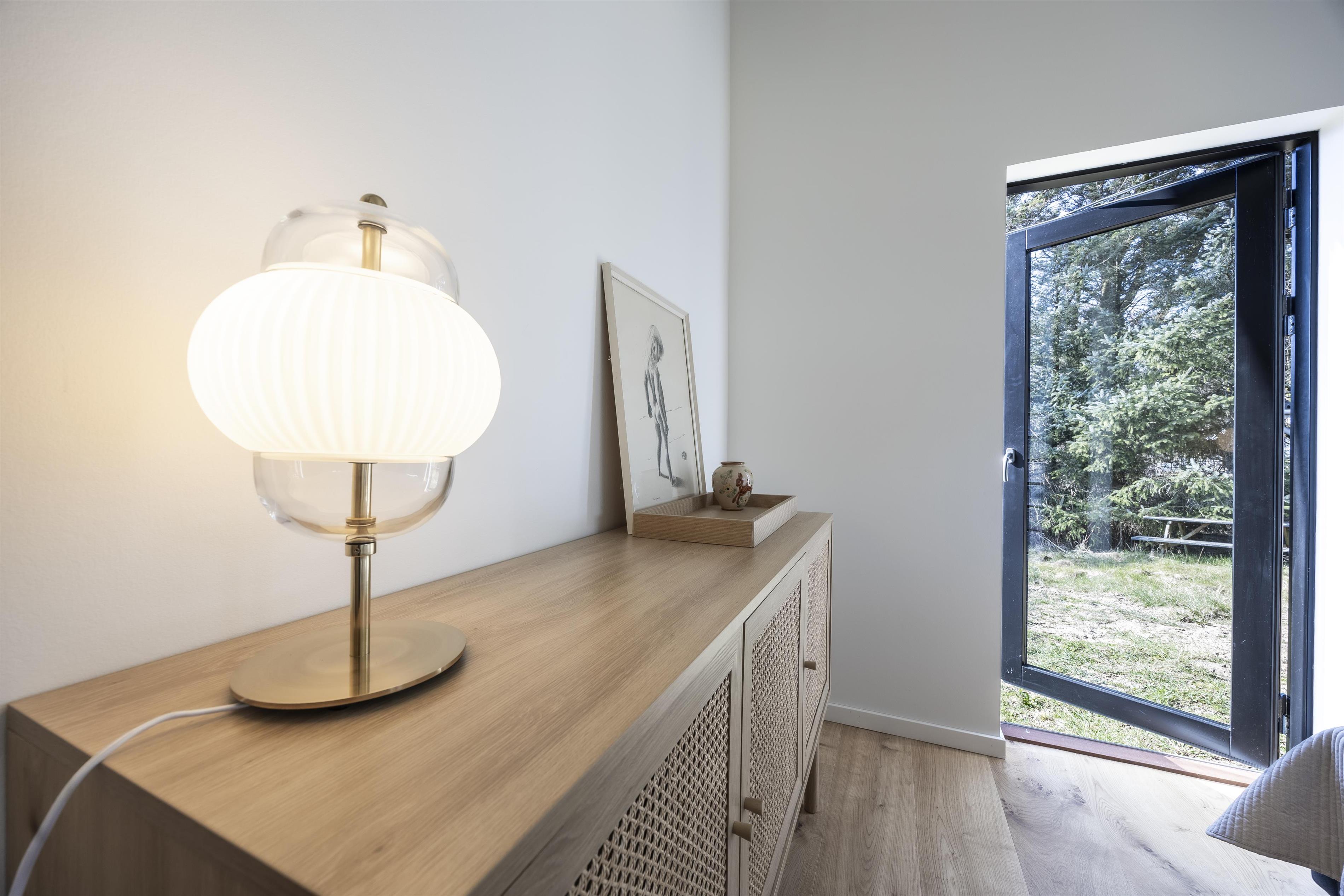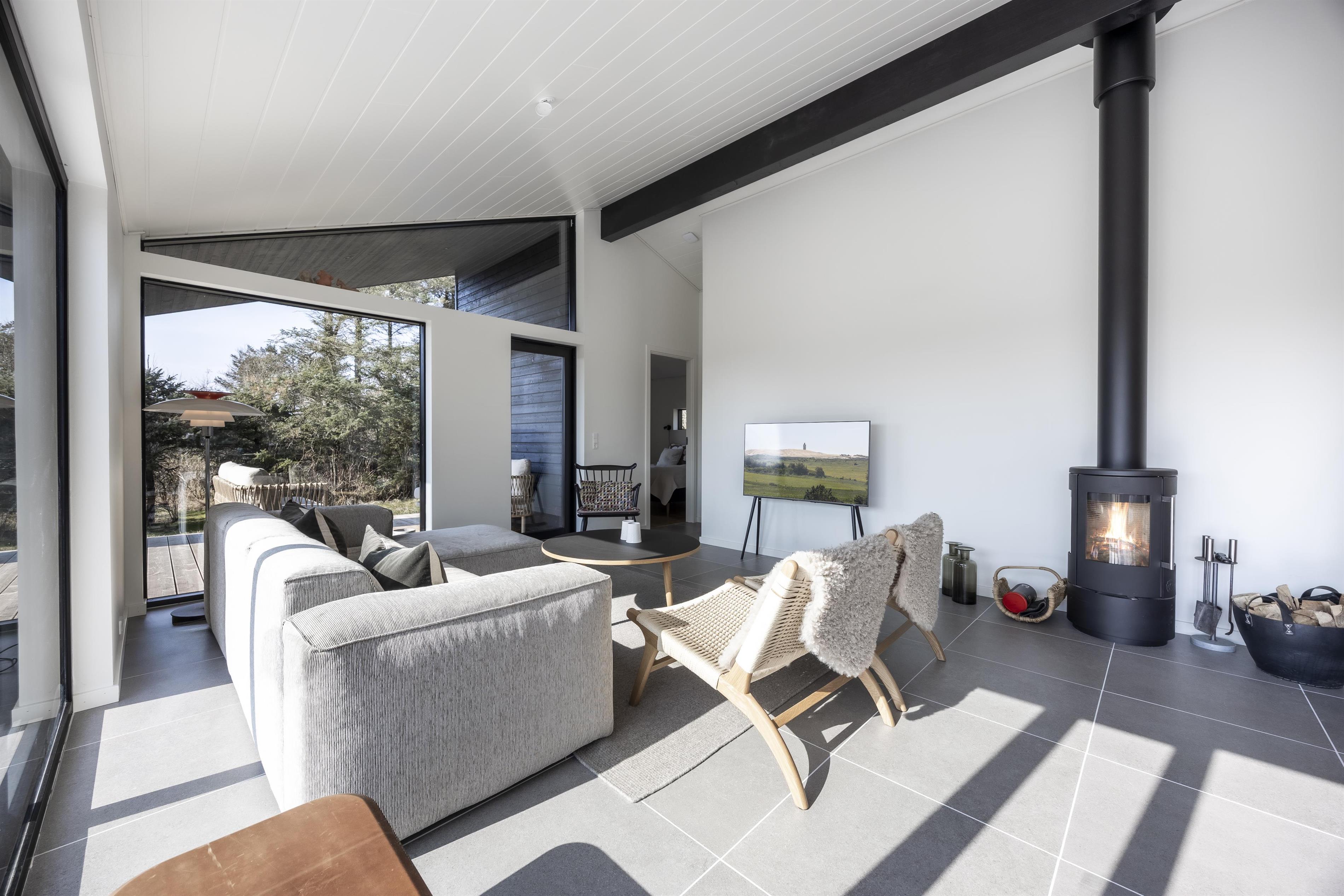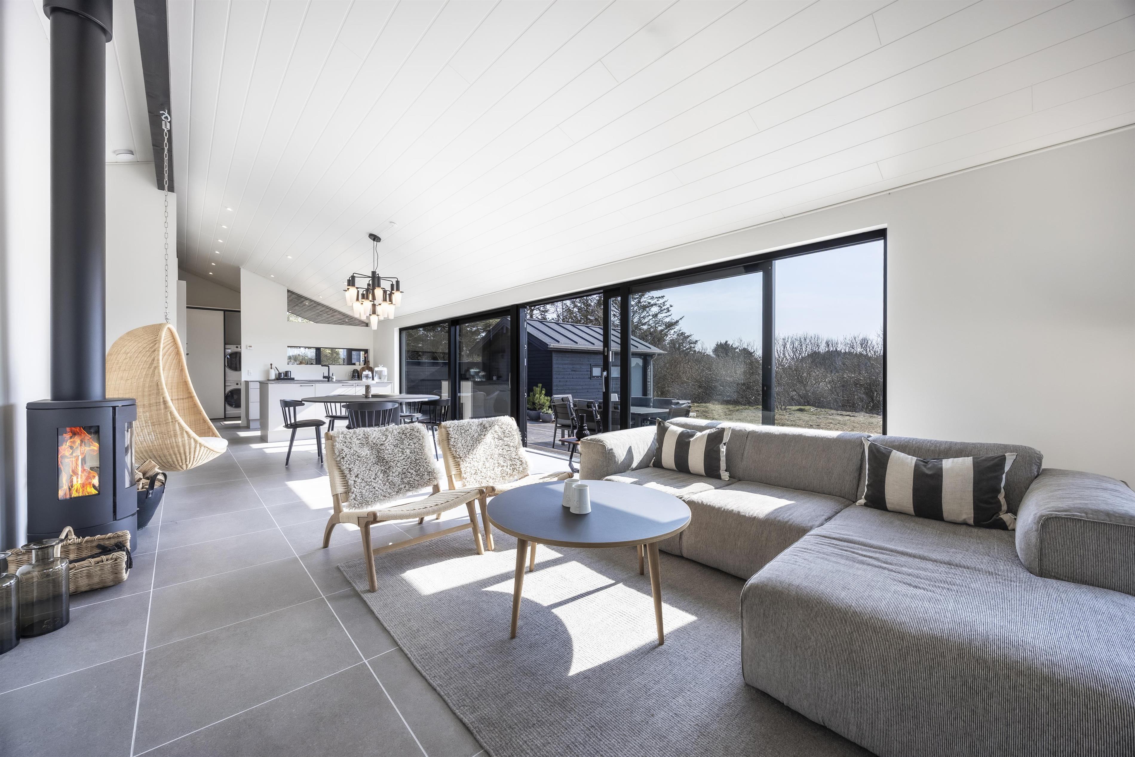 Hele huset bærer præg af, at der er tænkt på at skabe en hjemlig og naturlig atmosfære. Store vinduespartier i opholdsrummet lukker både lyset og naturen indenfor, hvilket forstærker den rolige stemning. På kolde dage kan I sætte en god film på, tænde op i brændeovnen og nyde en afslappende aften i lyset fra den knitrende ild. Huset er desuden energivenligt og opvarmes med varmepumpe.