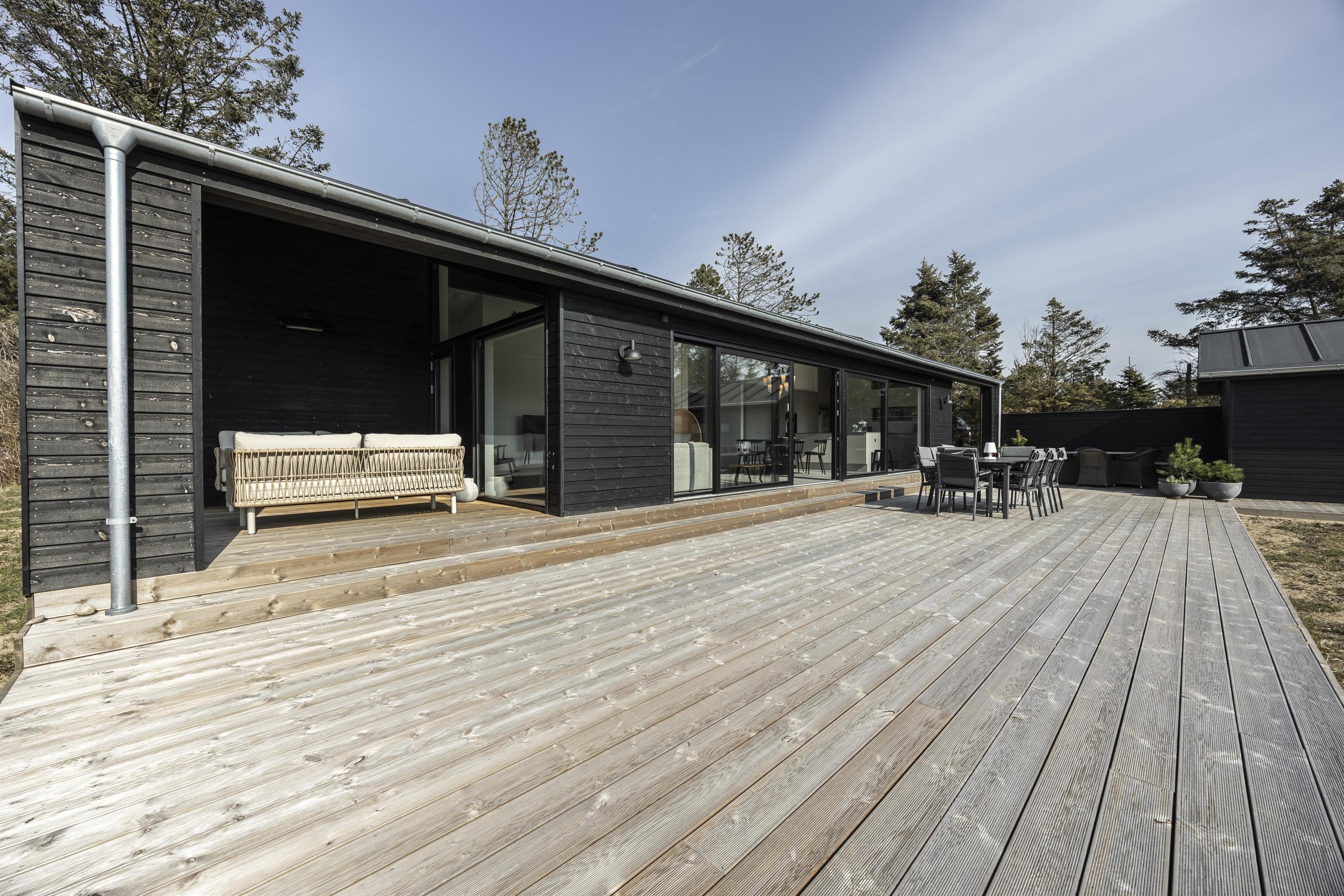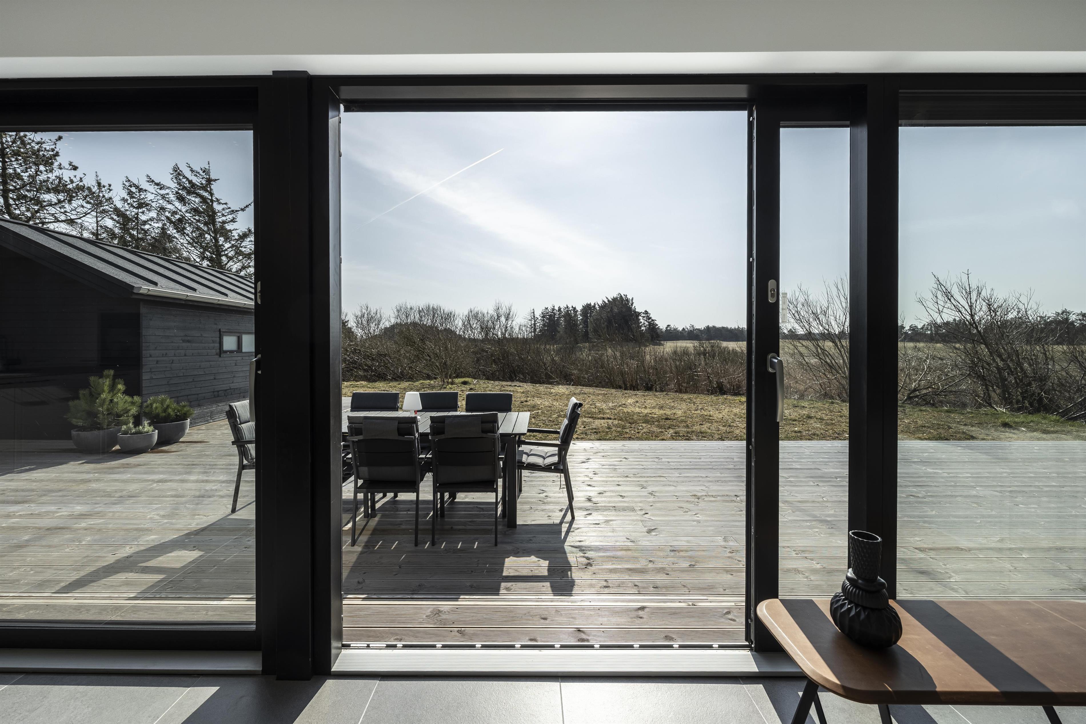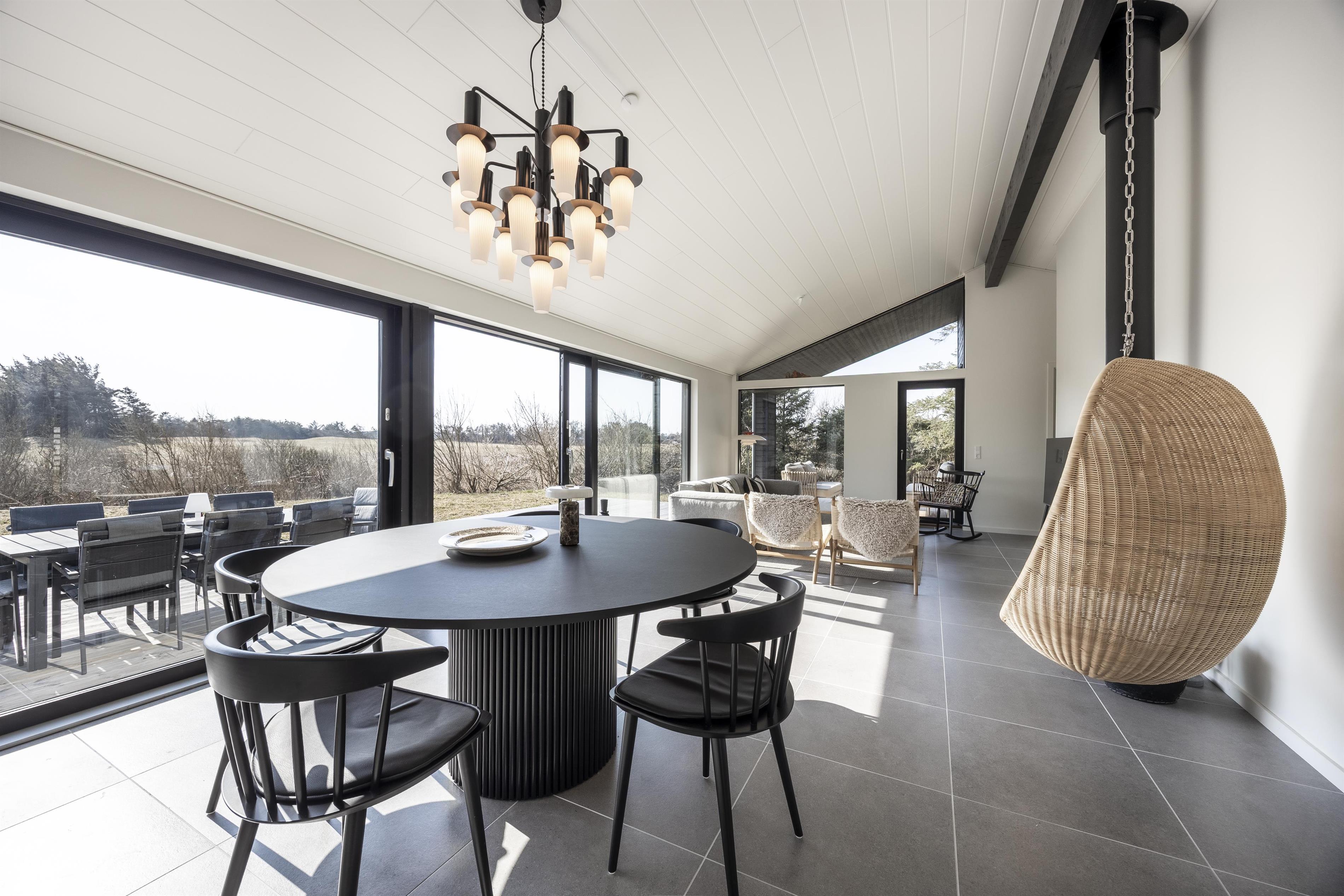 Fra huset har I direkte adgang til flere skønne terrasseområder. Skub de store skydedøre til side, og lad solen og den friske luft strømme ind. Tilbered lækre måltider på grillen, mens børnene leger og hygger på den store plæne. Terrasserne er helt ugenerede - lige med undtagelse af, hvis en nysgerrig ko eller hest kigger over budskadset. Her kan I nyde dagens måltider i solen eller finde læ på en rolig eftermiddag. Når mørket falder på, kan I trække hen under den overdækkede terrasse, tænde for terrassevarmeren og nyde en stille sommeraften i godt selskab.