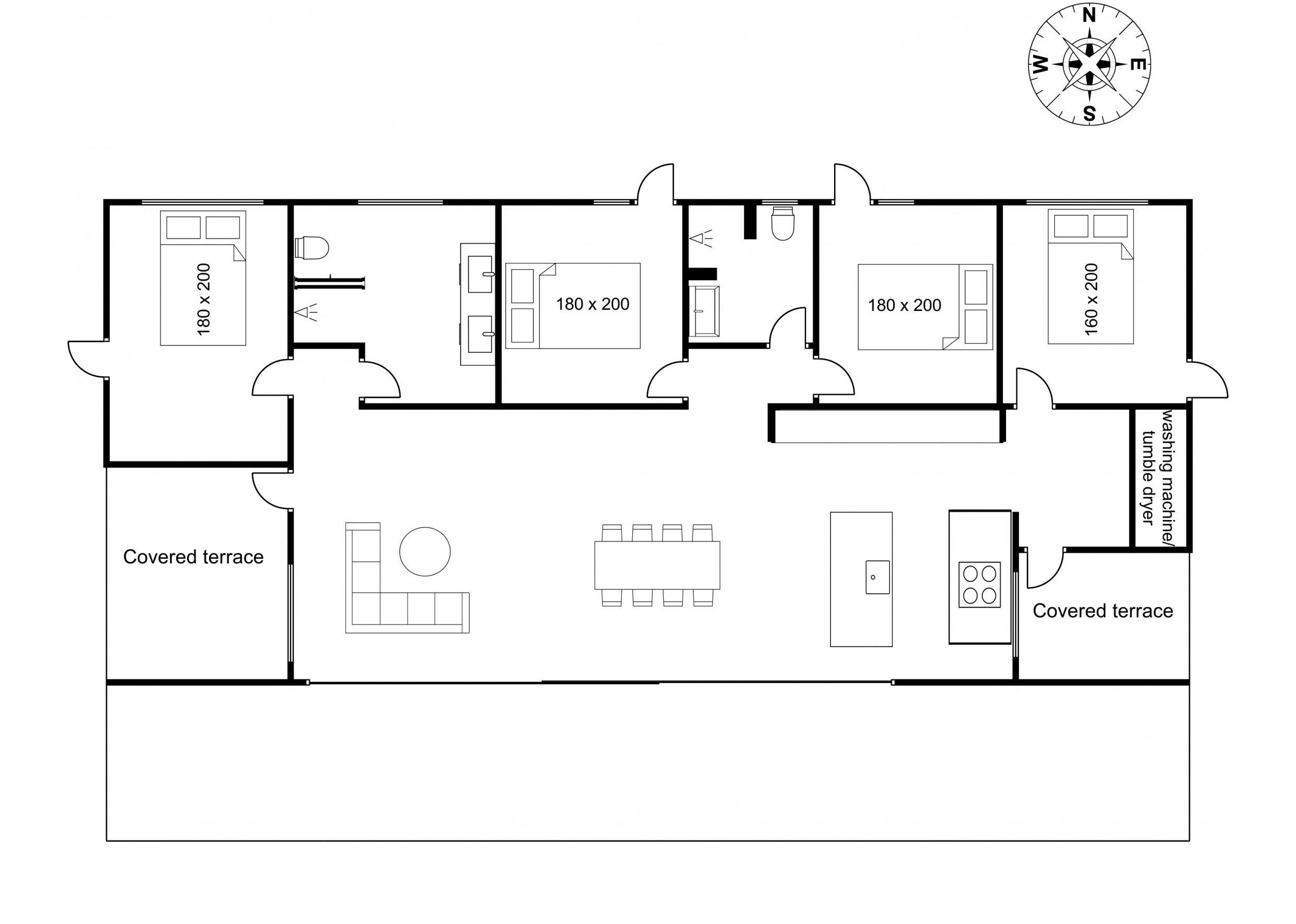 Når I låser døren op til dette indbydende feriehus, træder I direkte ind i en rummelig entré med god plads til overtøj. Her finder I også vaskemaskine og tørretumbler. Længere fremme mødes I af husets første hyggelige soveværelse med dobbeltseng. Hjertet af feriehuset er det åbne køkken-alrum med spiseplads og et hyggeligt sofahjørne. Herfra er der adgang til tre yderligere, rummelige soveværelser samt to store badeværelser - begge med bruseniche.