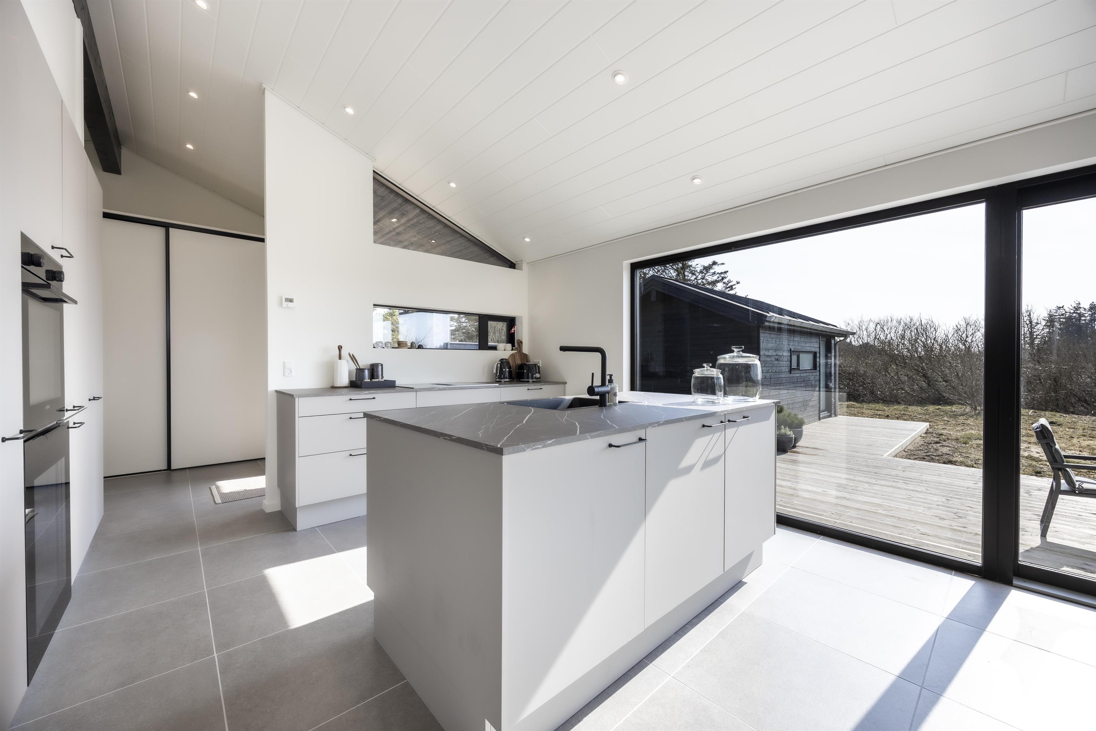 I den hyggelige kystby Lønstrup i Nordjylland finder I dette moderne og flotte feriehus, som netop er blevet opført. Huset ligger som det sidste på vejen, og de skønne terrasseområder er derfor helt ugenerede med udsigt til den imponerende, rå natur og køer, der græsser fredeligt på marken overfor. Det er ren idyl.