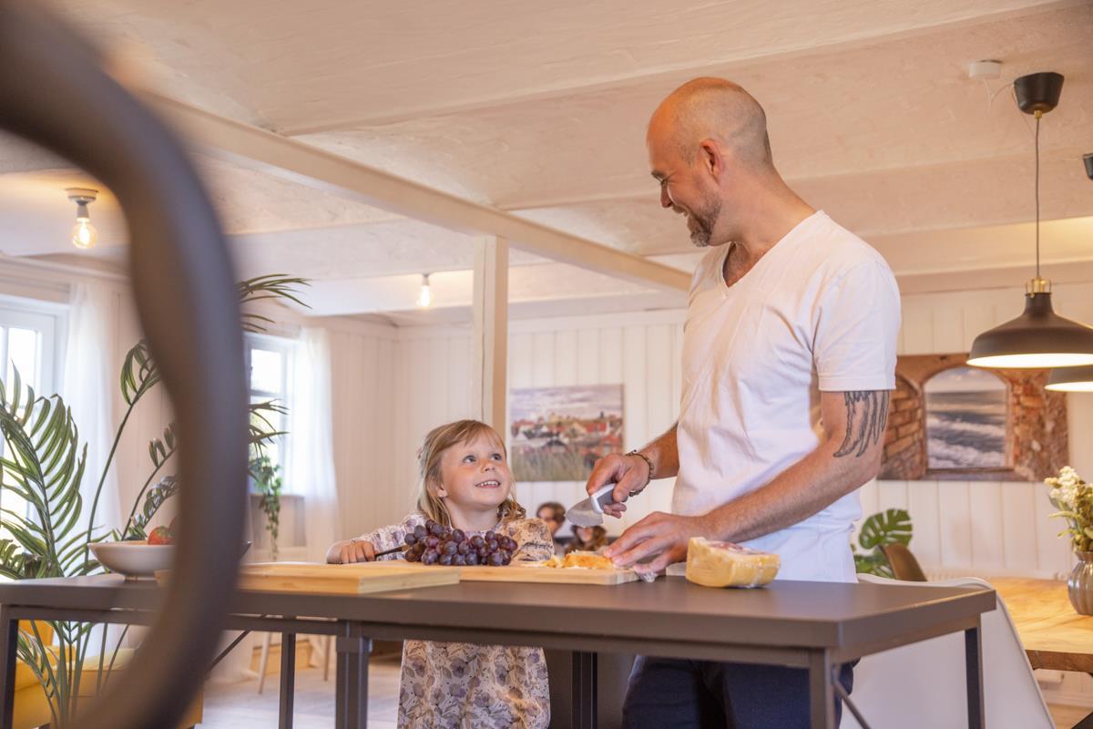 Træd ind i Kostalden og oplev en indbydende atmosfære, hvor de gamle buede loftshvælvinger er bevaret. I det store køkken-alrum kan måltiderne nydes ved det lange, håndlavede spisebord, og stuen er designet til at skabe hyggelige stunder.