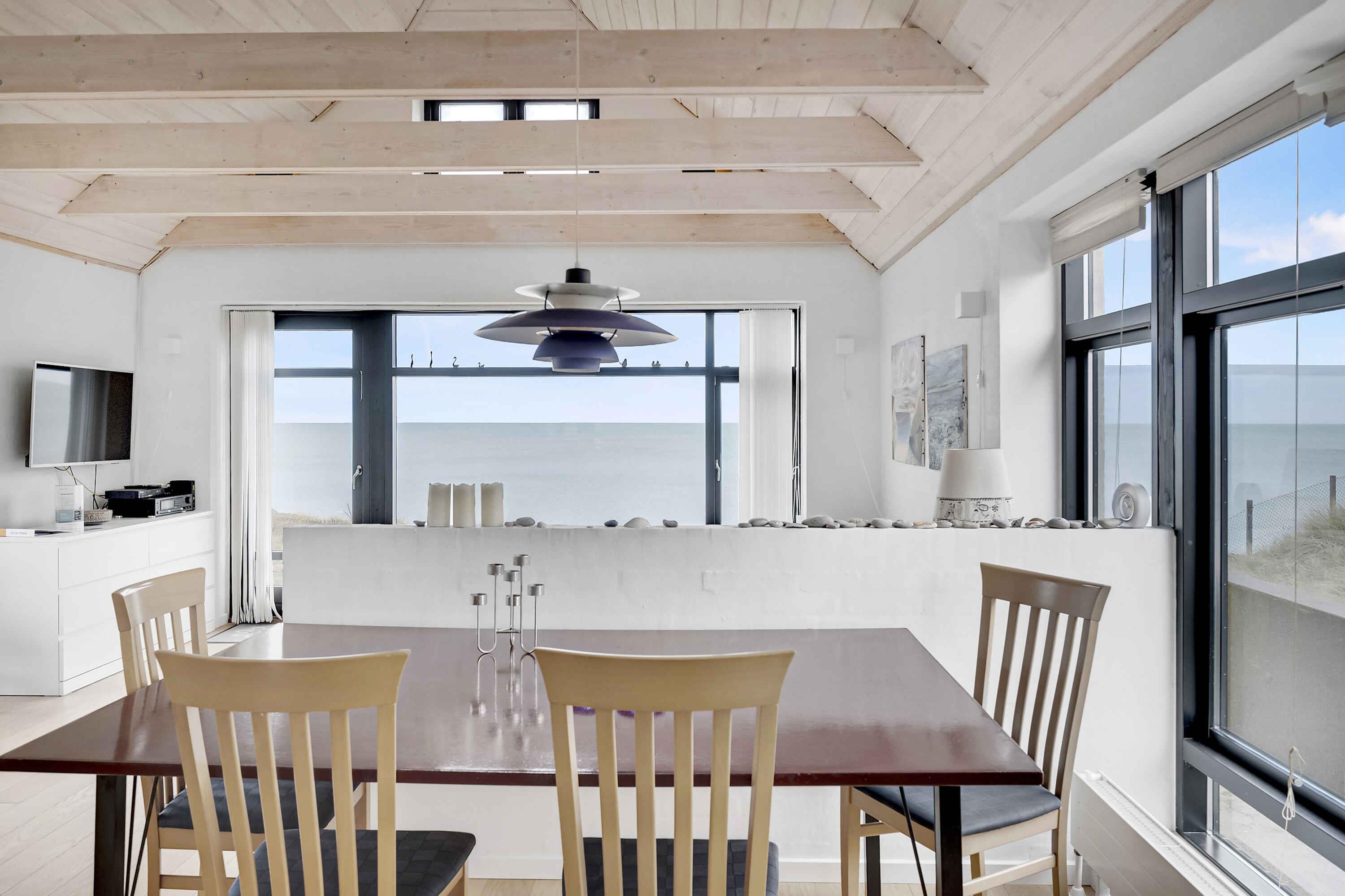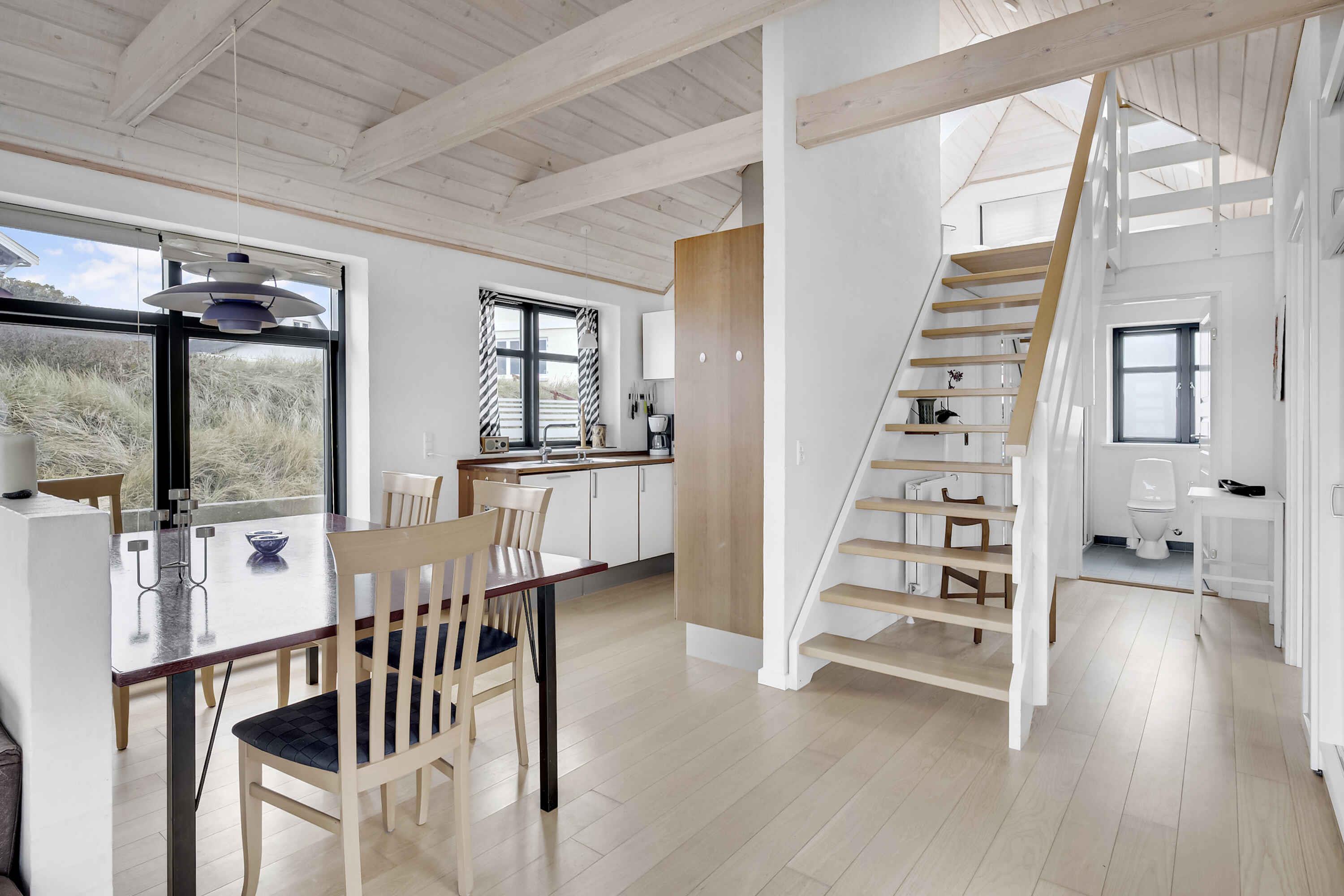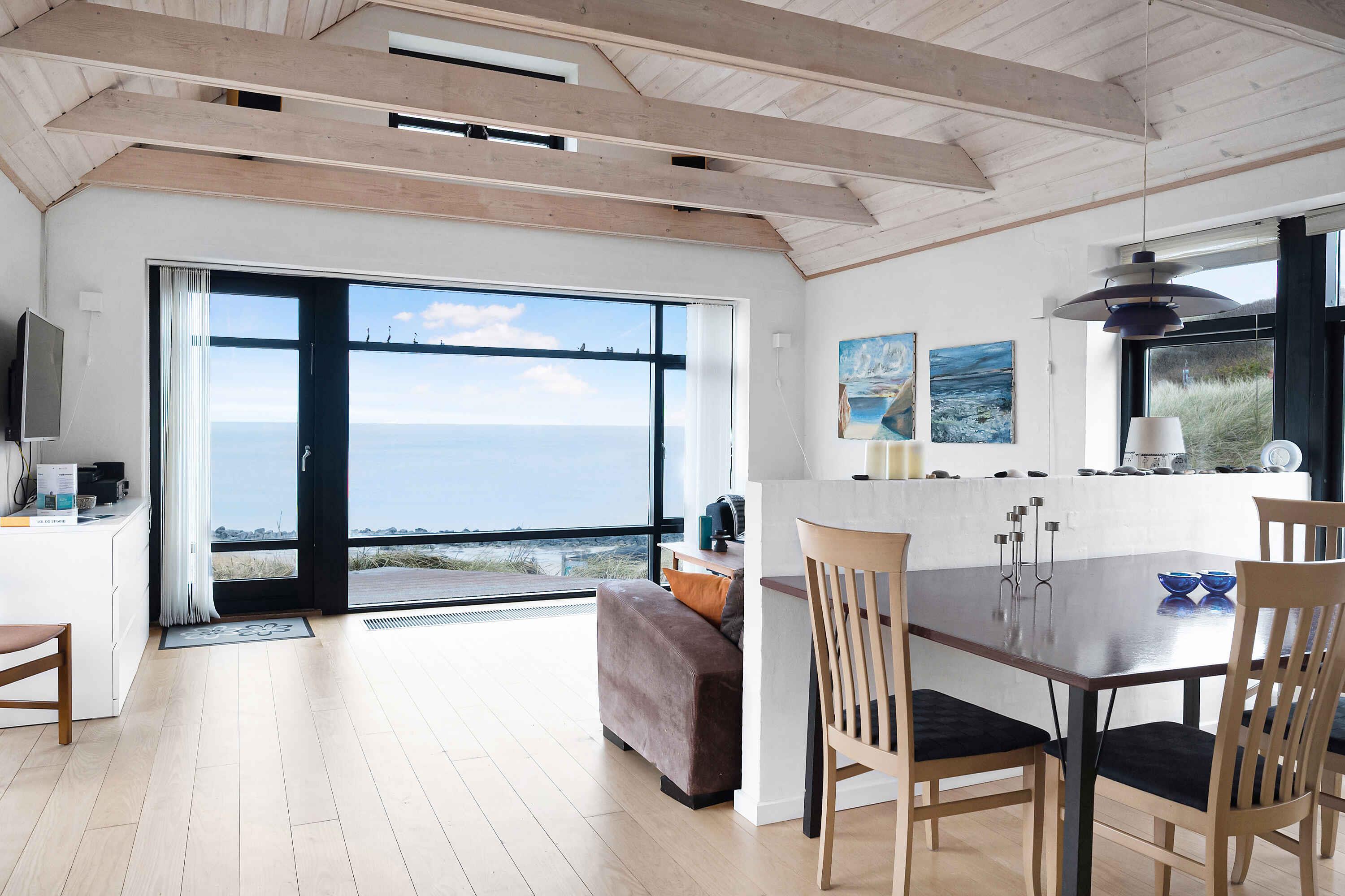 Sommerhus i Lønstrup med panorama havudsigt, 92 m², to soveværelser og hems. Fuldt udstyret køkken, vaskemaskine, gulvvarme og 20 m² terrasse. 50 m fra strand og 300 m fra butik.