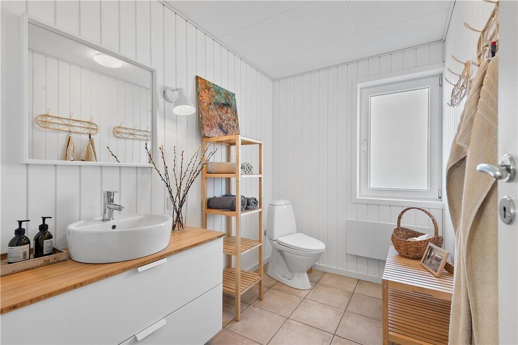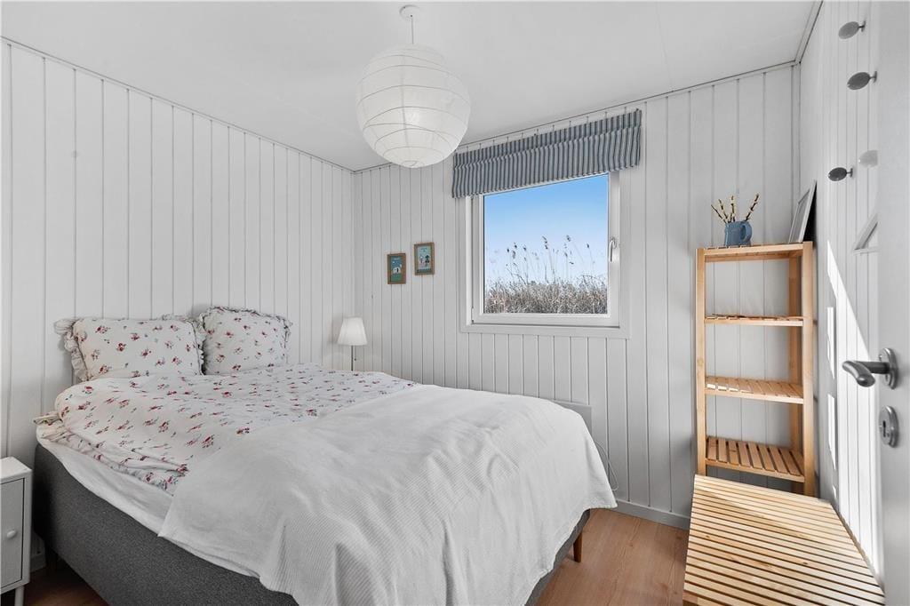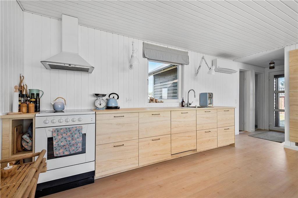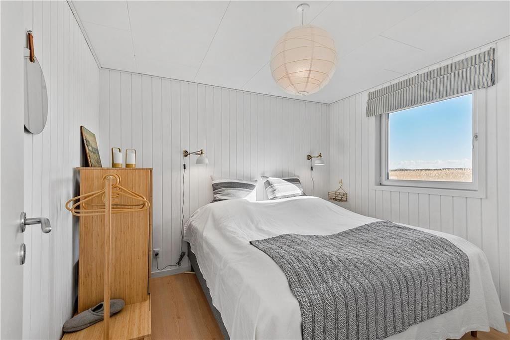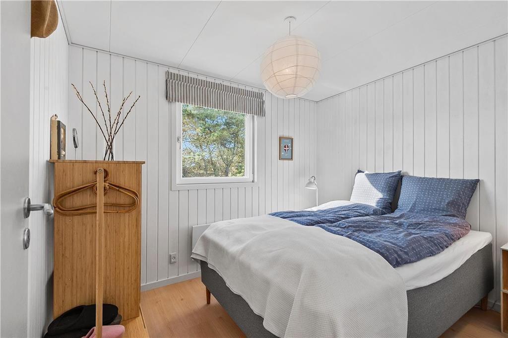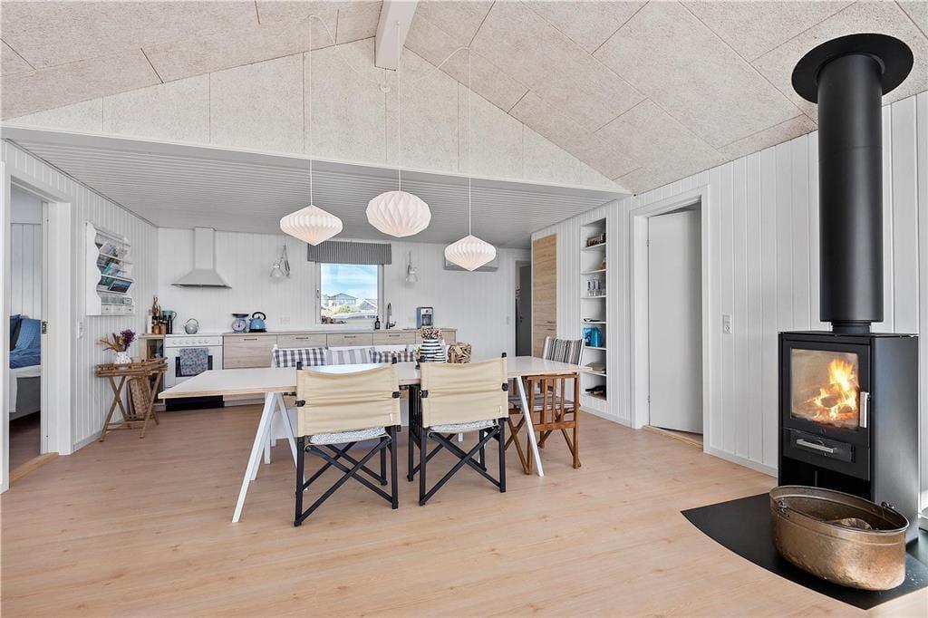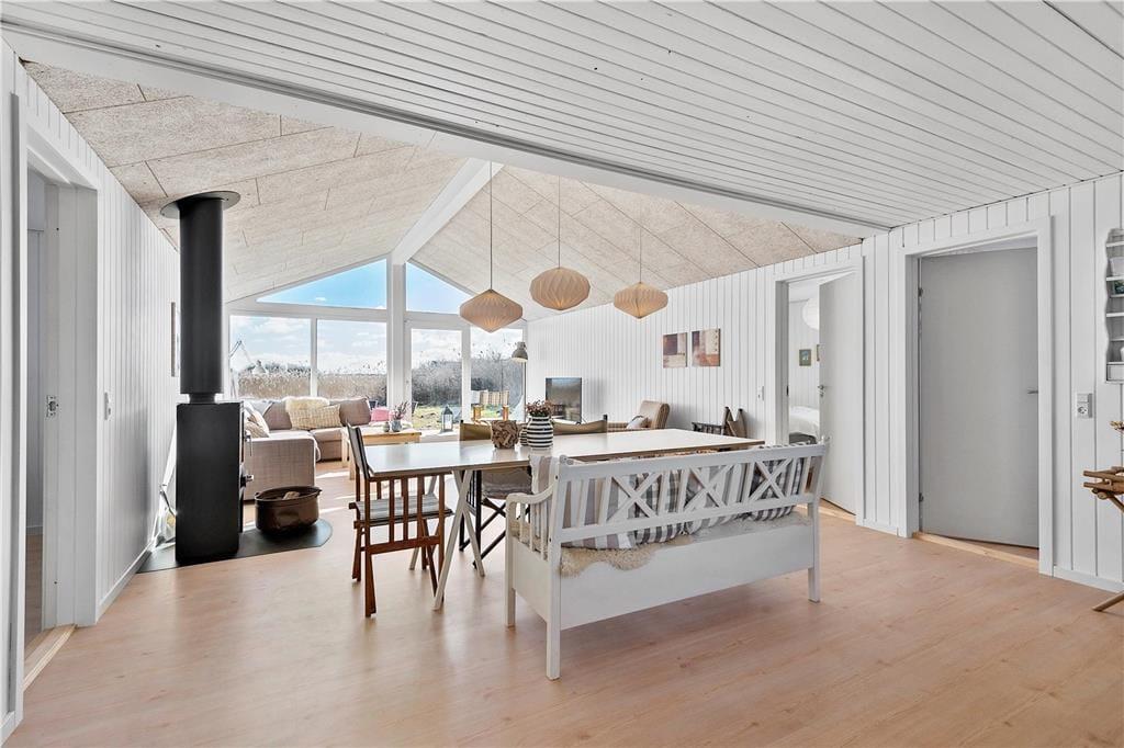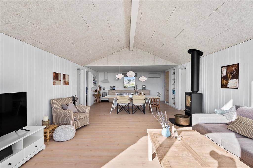 Sommerhuset fremstår knivskarpt, for det er et nybyggeri fra 2020, og man kan tydeligt se, at der er blevet kælet for detaljerne. Indretningen er lys og let med lækkert møblement og klassiske sommerhusdetaljer som brændeovnen og de hvidmalede trævægge. Mere atypiske detaljer er der også: For eksempel finder I både en tøjdamper og en popcornmaskine i huset, så I slipper for at gå rundt i krøllet tøj og er sikret gode snacks, når I bliver lækkersultne. Den velfungerende planløsning byder på tre gode soveværelser, der alle er indrettet med dobbeltseng, og et lækkert badeværelse samt gæstetoilet og et bryggers med vaskemaskine er der også gjort plads til. Sommerhusets største rum er imidlertid stuen, som har et flot åbent køkken i den ene ende, og i den anden åbenbarer et kæmpe gavlvindue den betagende udsigt mod haven og det tilstødende naturområde.