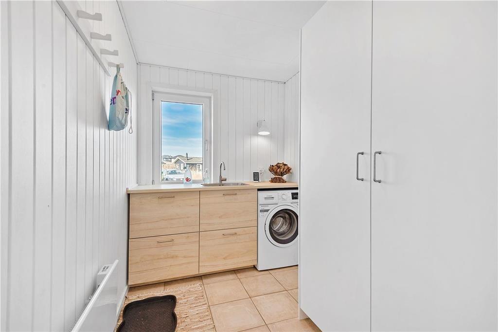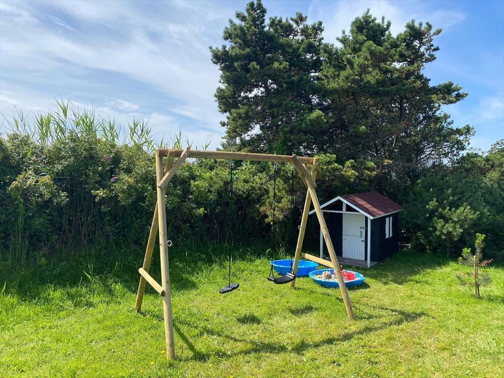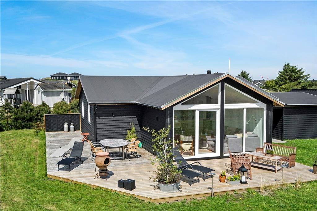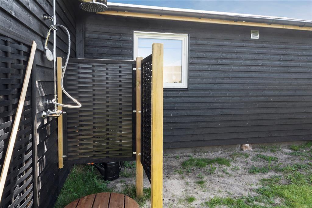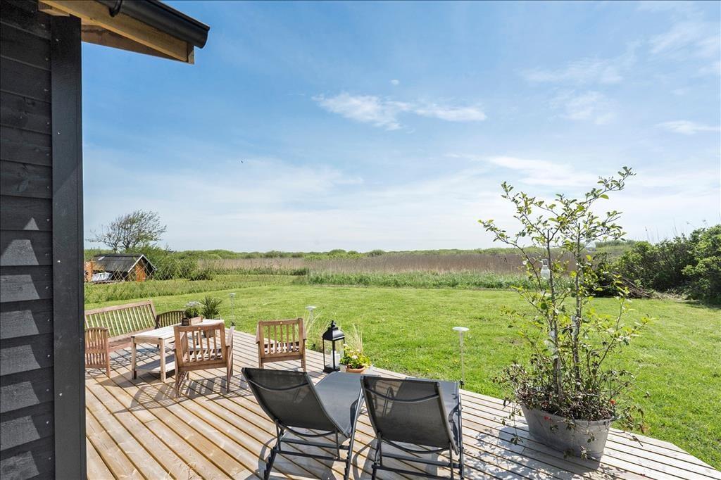 Fra stuen har I direkte adgang til en stor træterrasse, der breder sig i sydøstlig retning ud mod naturarealet. Havemøblerne passer godt til huset, så driverlivet under åben himmel bliver også stilfuldt og komfortabelt. En grill og liggestole er til rådighed, og som en skøn detalje er der en udendørs bruser på grunden, hvis I vil skylle saltvand og sand af kroppen, når I vender hjem fra en badetur i Vesterhavet.
