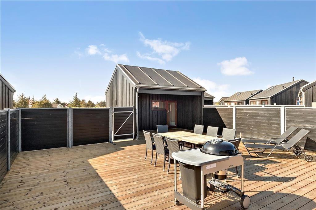 På begge sider af sommerhuset er der anlagt terrasser, men særligt den sydvendte vil sikkert blive jeres favorit – ikke kun på grund af den gode orientering, men også fordi den ligger helt afskærmet mellem sommerhuset, annekset og plankeværk som en herlig solgård. Her kan I nyde ferielivet på ugeneret vis, når I griller og slapper af i havemøblerne.