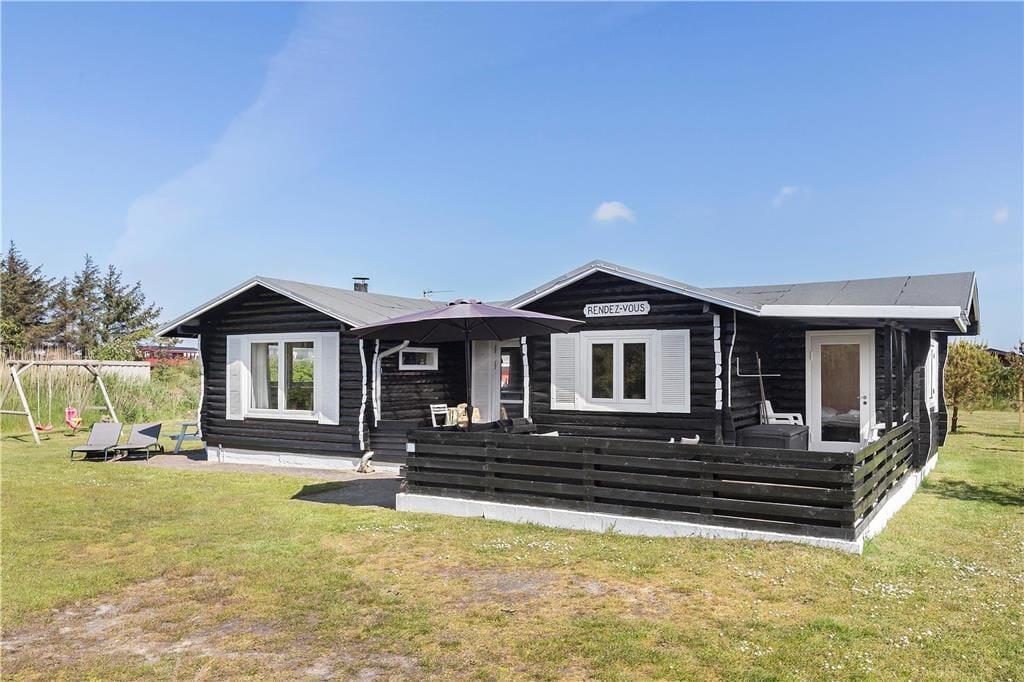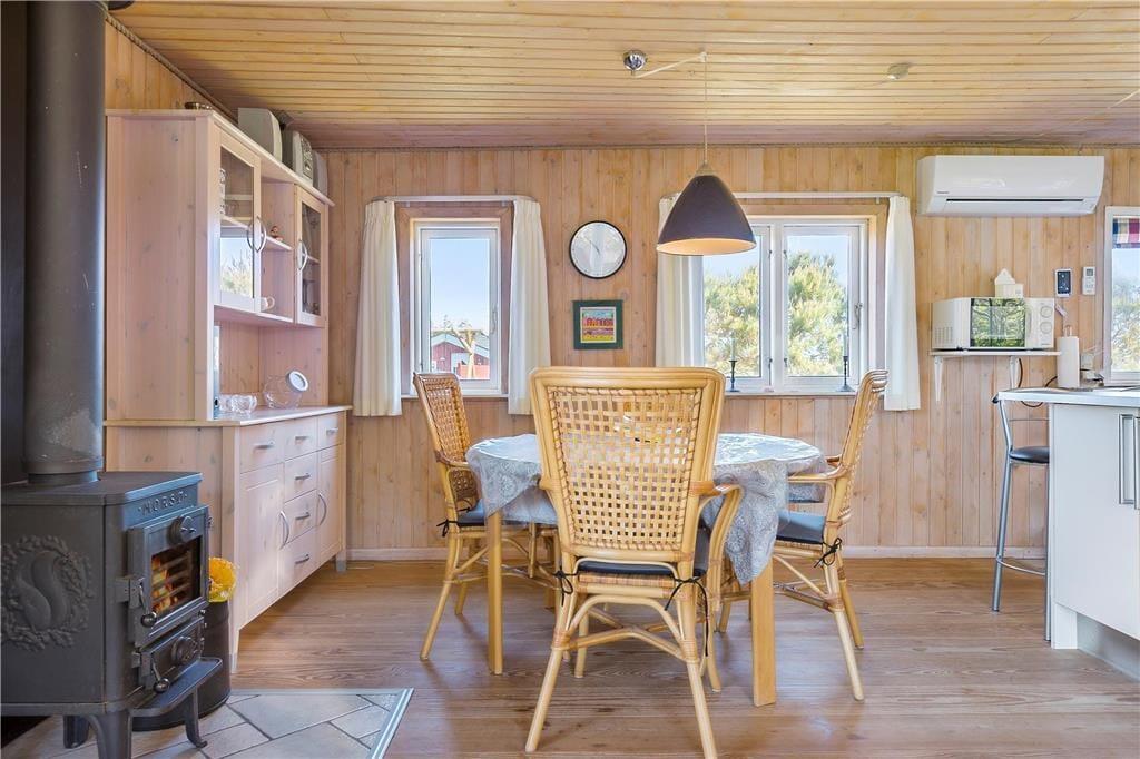 ”Rendez-vous”, som sommerhuset hedder, står med sortmalet, rustik træfacade og hvide vinduesskodder midt i den grønne have. Med andre ord charmerer det lige fra ankomsten, og også når I træder indenfor, kan I mærke sommerhusets varme og venlige atmosfære. Her er der lyse trælister på væggene, og en dejlig Morsø-brændeovn er bestemt også med til at skrue op for hyggestemningen i stuen. Er det koldt udenfor, kan I desuden tage varmepumpen i brug, når I slapper af i sofaafdelingen eller nyder et godt måltid mad omkring spisebordet. Feriens måltider kan I tilberede i det pæne og veludstyrede køkken, der ligger i åben forbindelse med stuen. Planløsningen byder for øvrigt på et badeværelse, der er udstyret med glasbruseniche, vaskemaskine og tørretumbler, og endelig er der to soveværelser, som fik nye senge i forbindelse med seneste renoveringsprojekt i 2017.