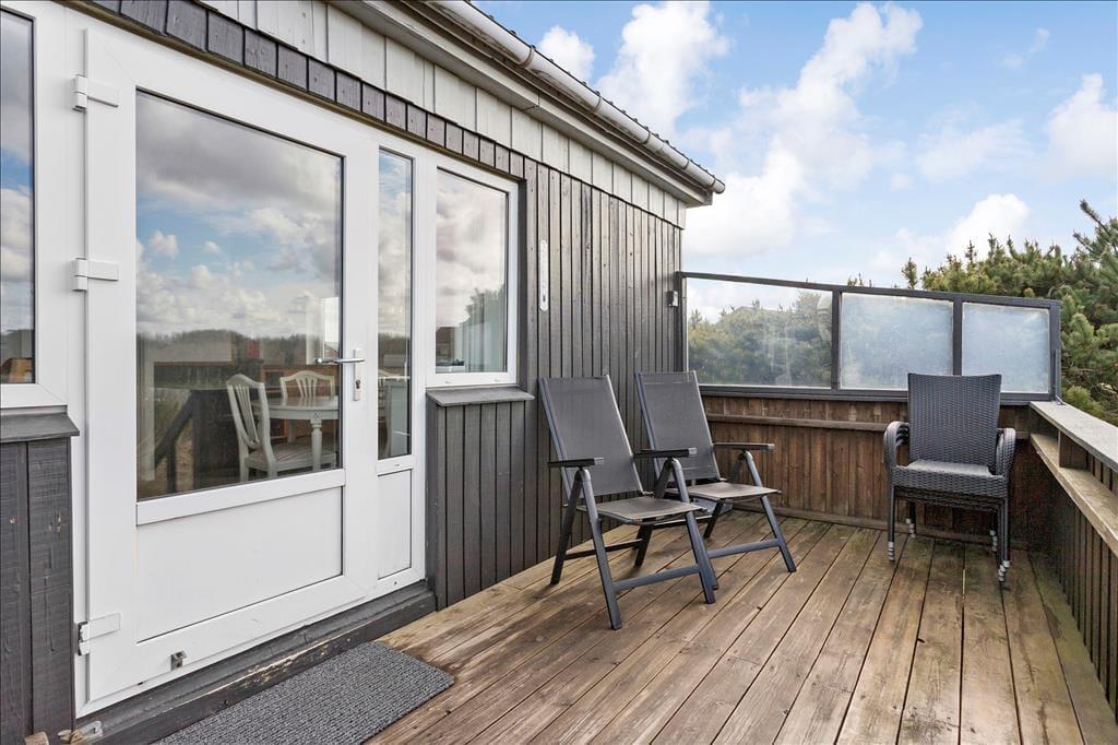 Syd for sommerhuset ligger en dejlig træterrasse, der er perfekt til solbeskinnet afslapning med gang i grillen og godt selskab. Afskærmningen giver læ mod både øst og vest, og mod syd kan I kigge ud over det grønne område, som grunden grænser op til.