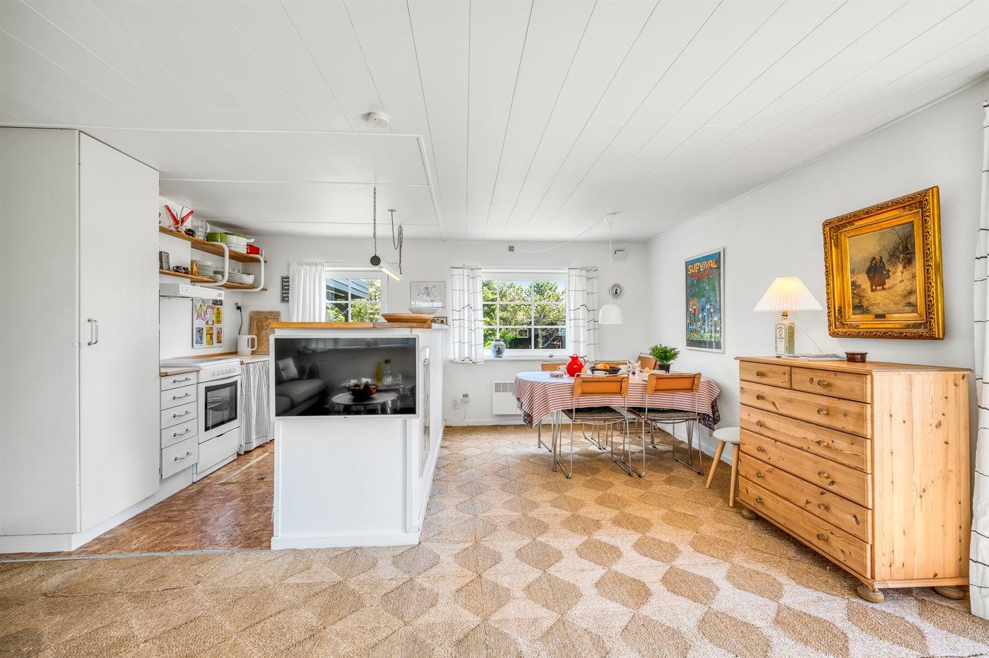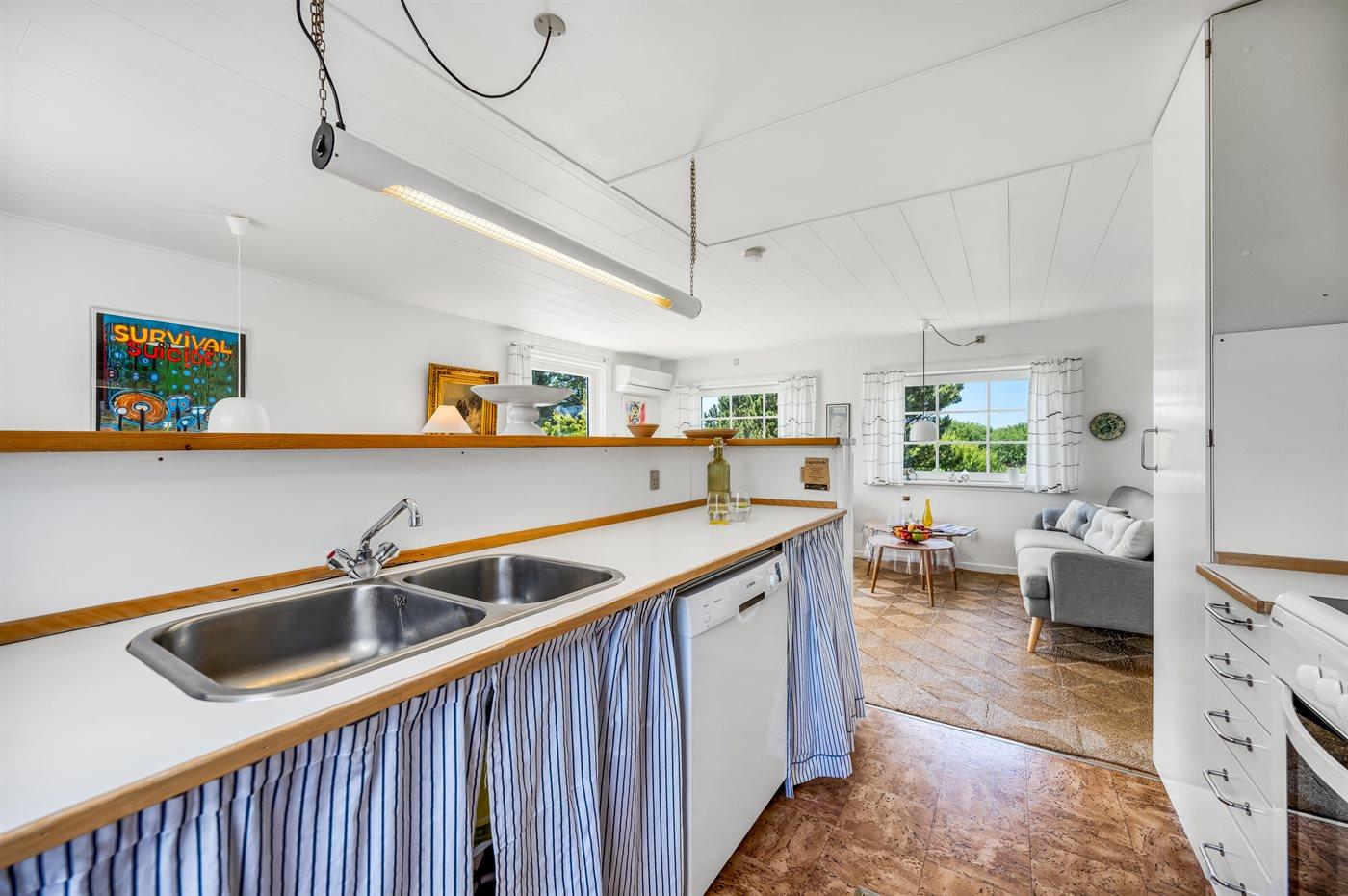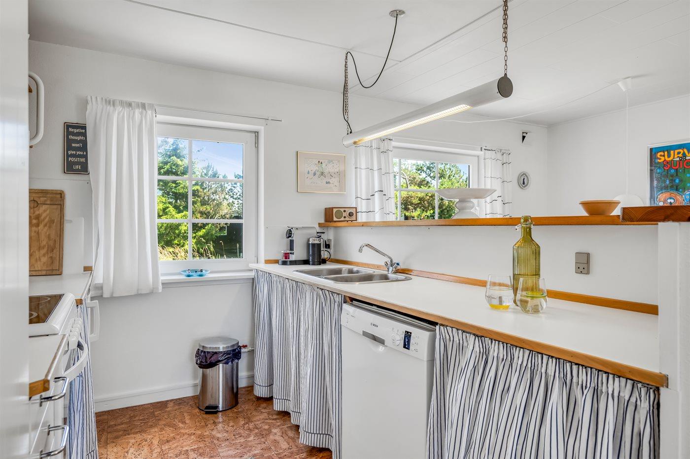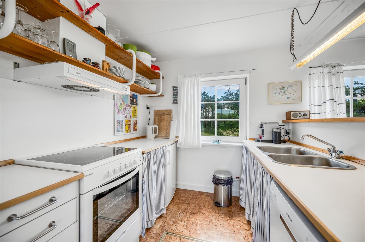 Køkkenet er udstyret med 1 køleskab. Der er 4 keramiske kogeplader, varmluftovn samt opvaskemaskine.
