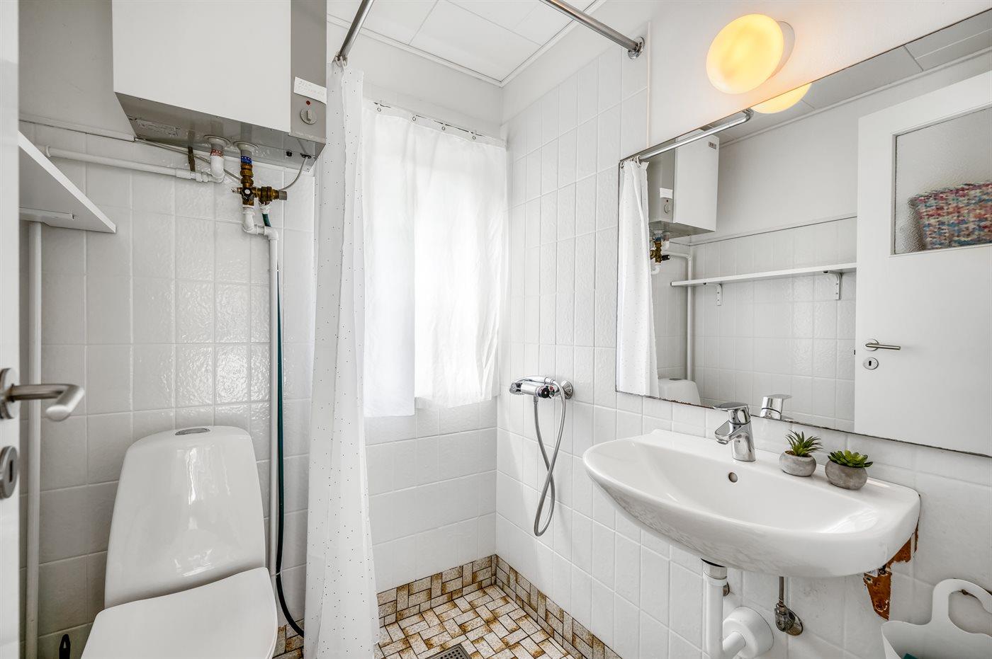 Der er 1 badeværelse med bruser og 1 toilet.