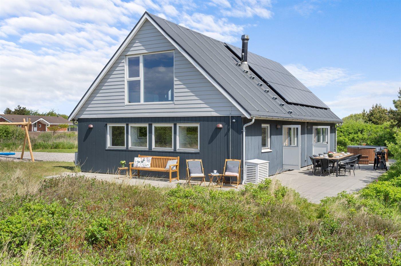 Lyst sommerhus i Rømøs klitlandskab med moderne faciliteter og vildmarksbad på sydvendt terrasse.