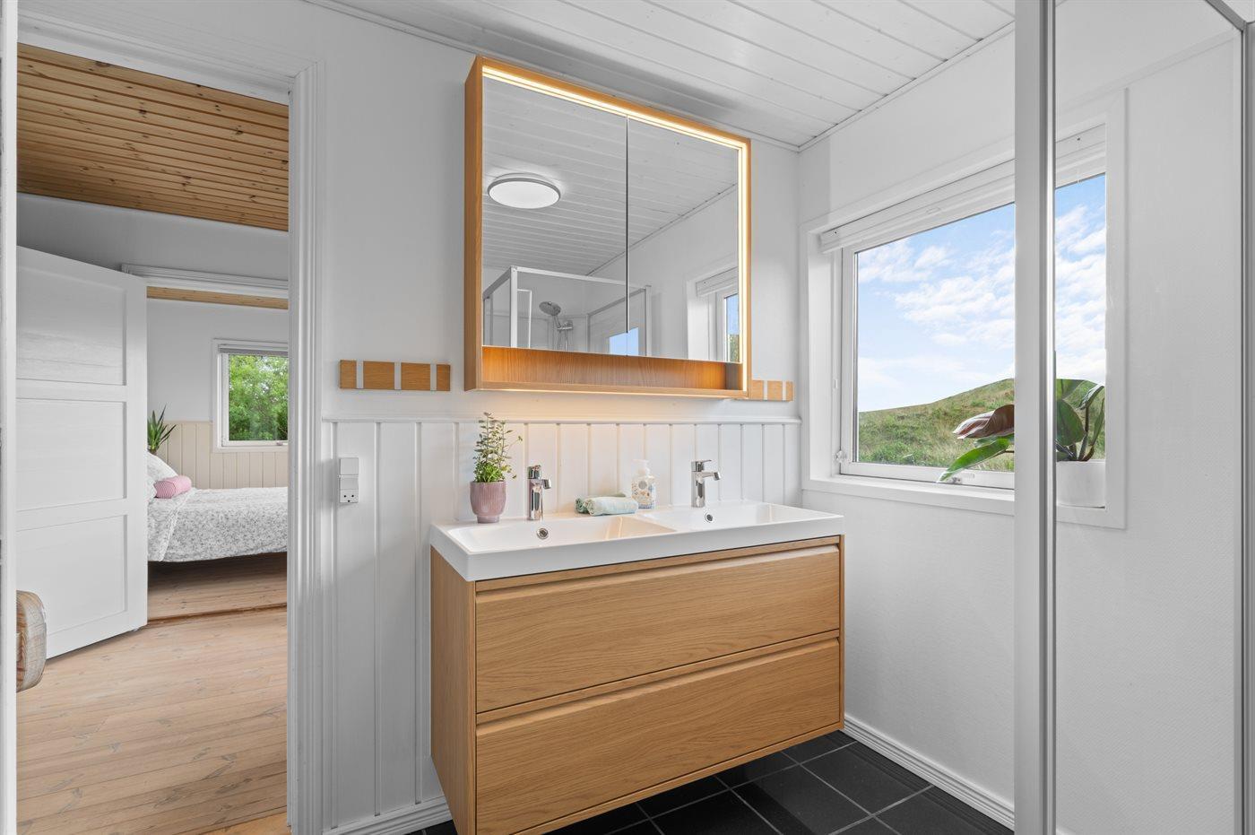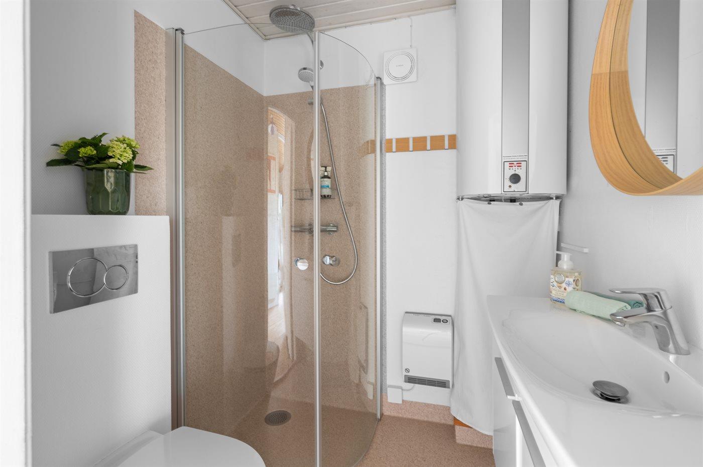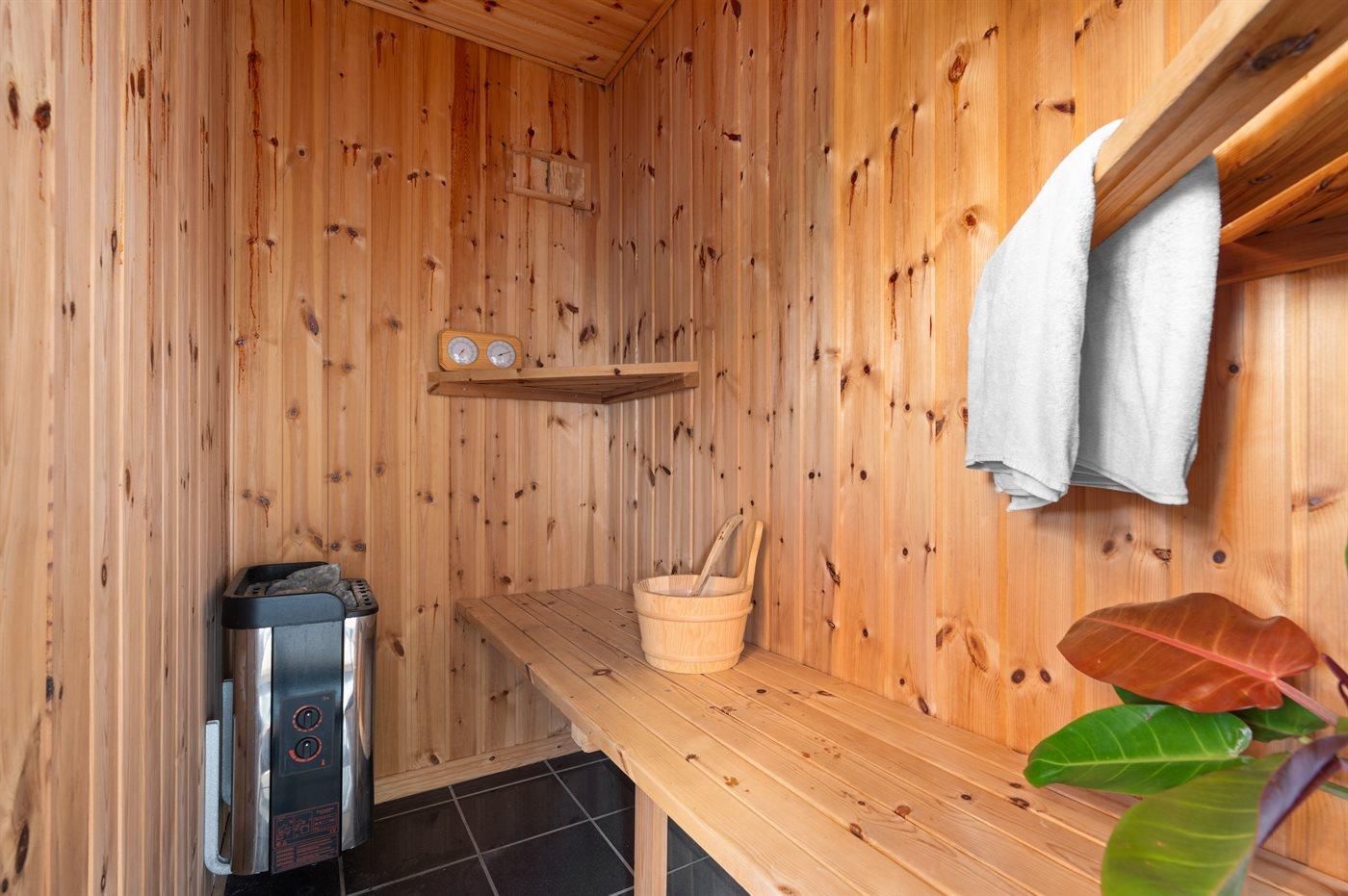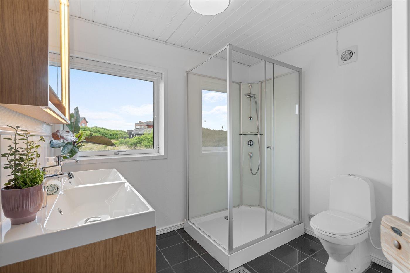 Der er 2 badeværelser med bruseniche og 2 toiletter. Der er gulvvarme på 1 badeværelse. I saunaen er der mulighed for afslapning.