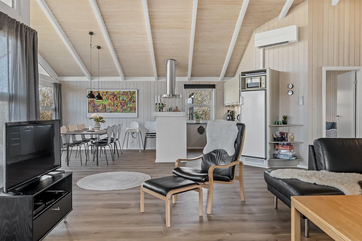 Skønt kvalitetssommerhus beliggende nær stranden og Vesterhavet. Huset er smagfuldt indrettet med adgang til hems, hvor 2 af sovepladserne befinder sig.