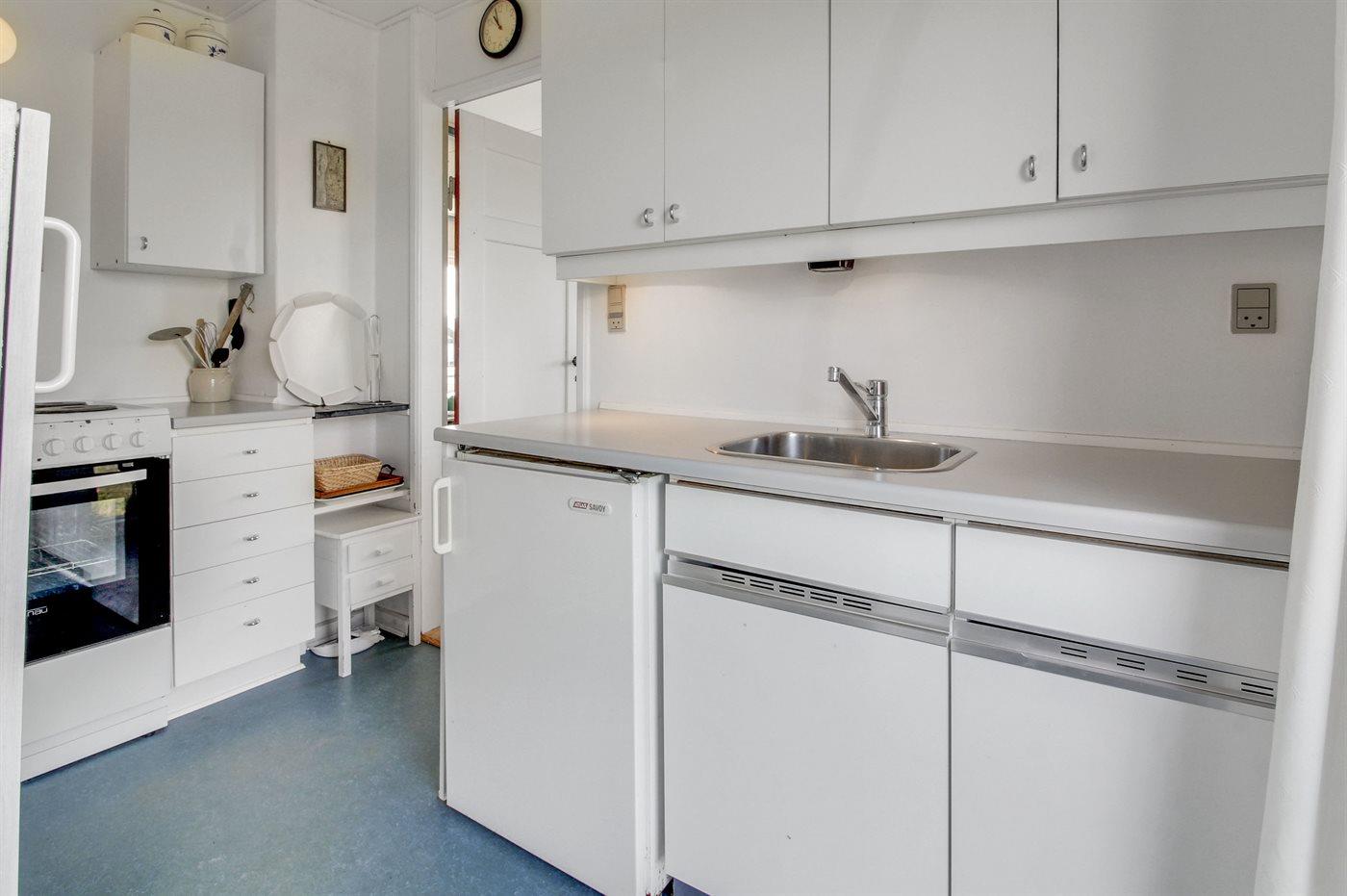 Køkkenet er udstyret med 1 køleskab. Der er 4 elkogeplader, bageovn.